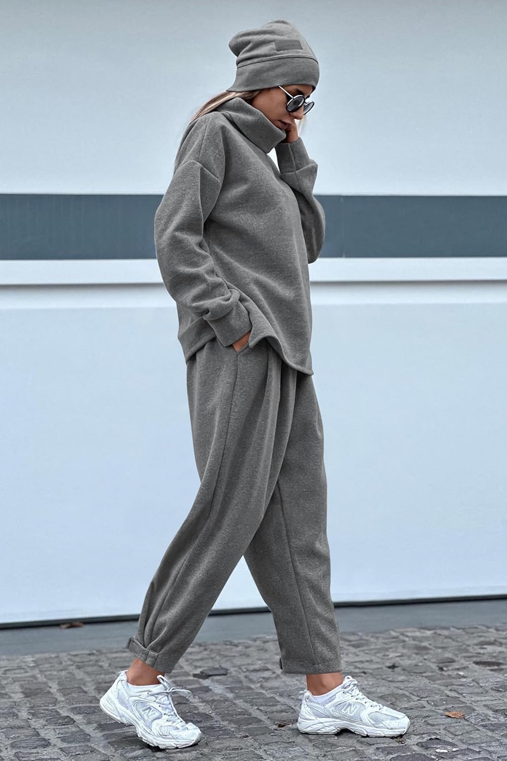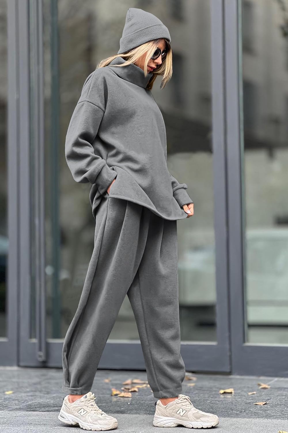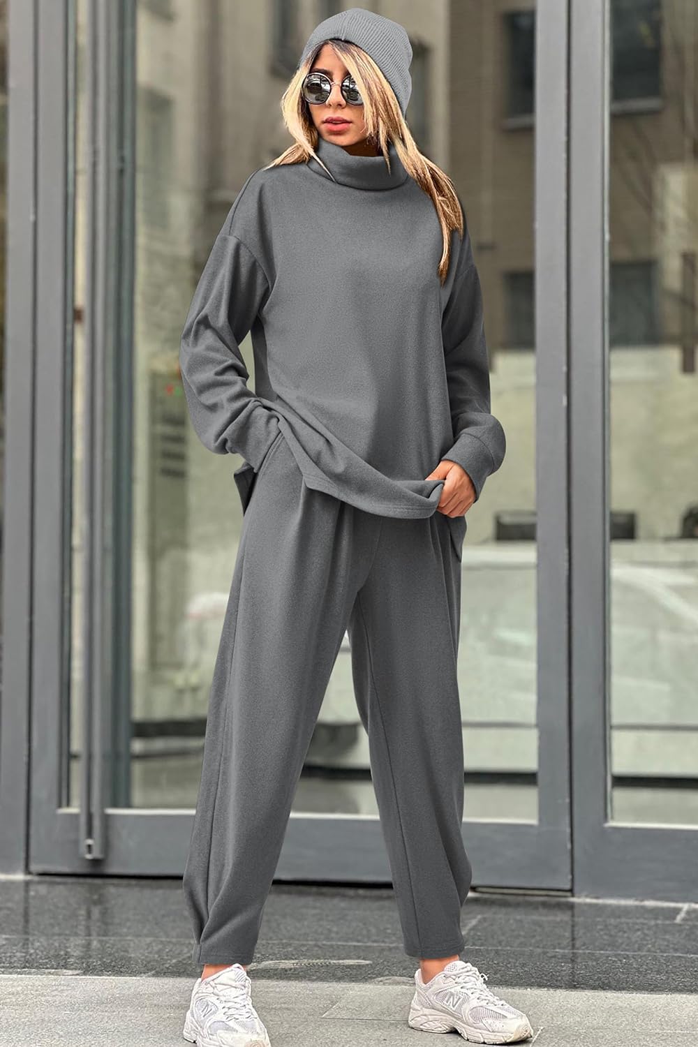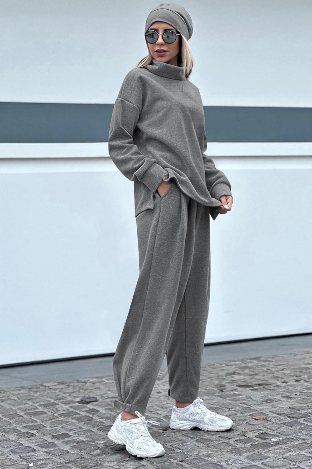 PRETTYGARDEN Women's 2023 Fall Two Piece Outfits Long Sleeve Tracksuit Set Turtleneck Pullover Tops Casual Pants Sweatsuits(Grey)