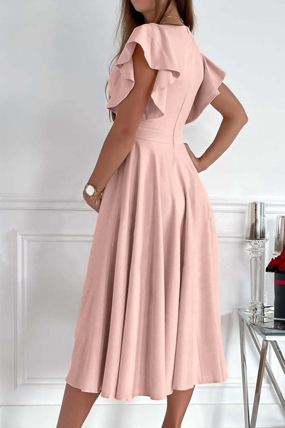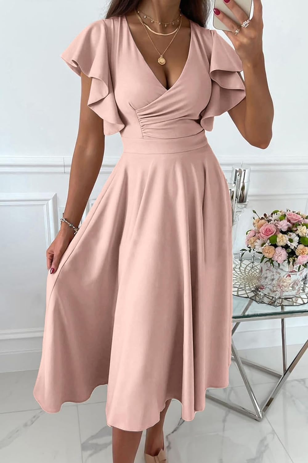PRETTYGARDEN Women's 2023 Summer Midi Dress Ruffle Cap Sleeve V Neck Swing A Line Cocktail Party Dresses(Apricot)