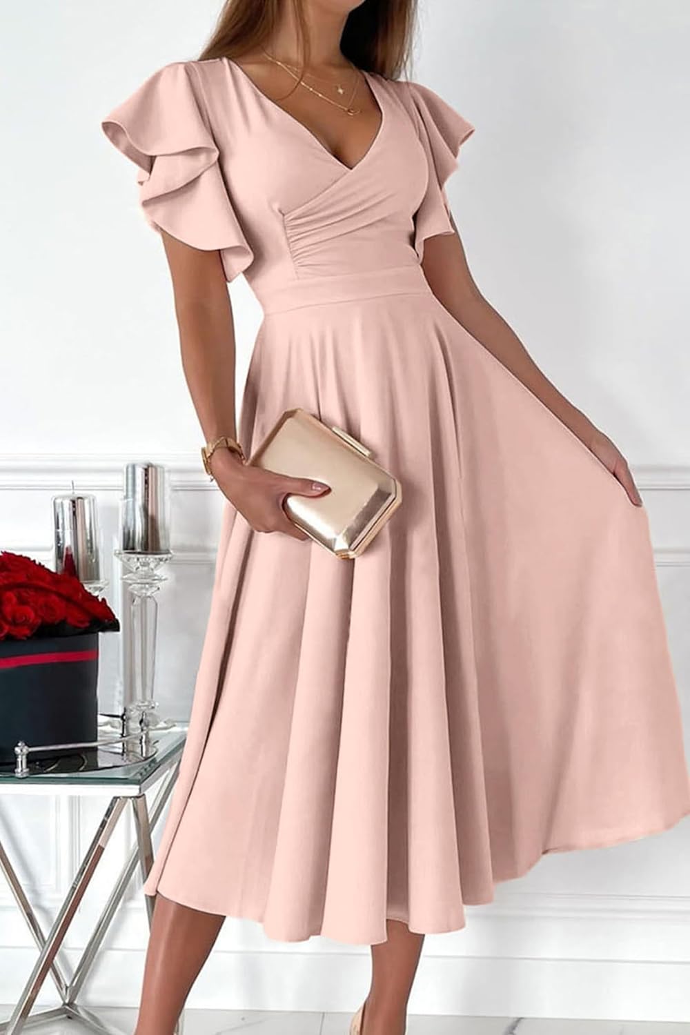 PRETTYGARDEN Women’s 2023 Summer Midi Dress Ruffle Cap Sleeve V Neck Swing A Line Cocktail Party Dresses(Apricot)