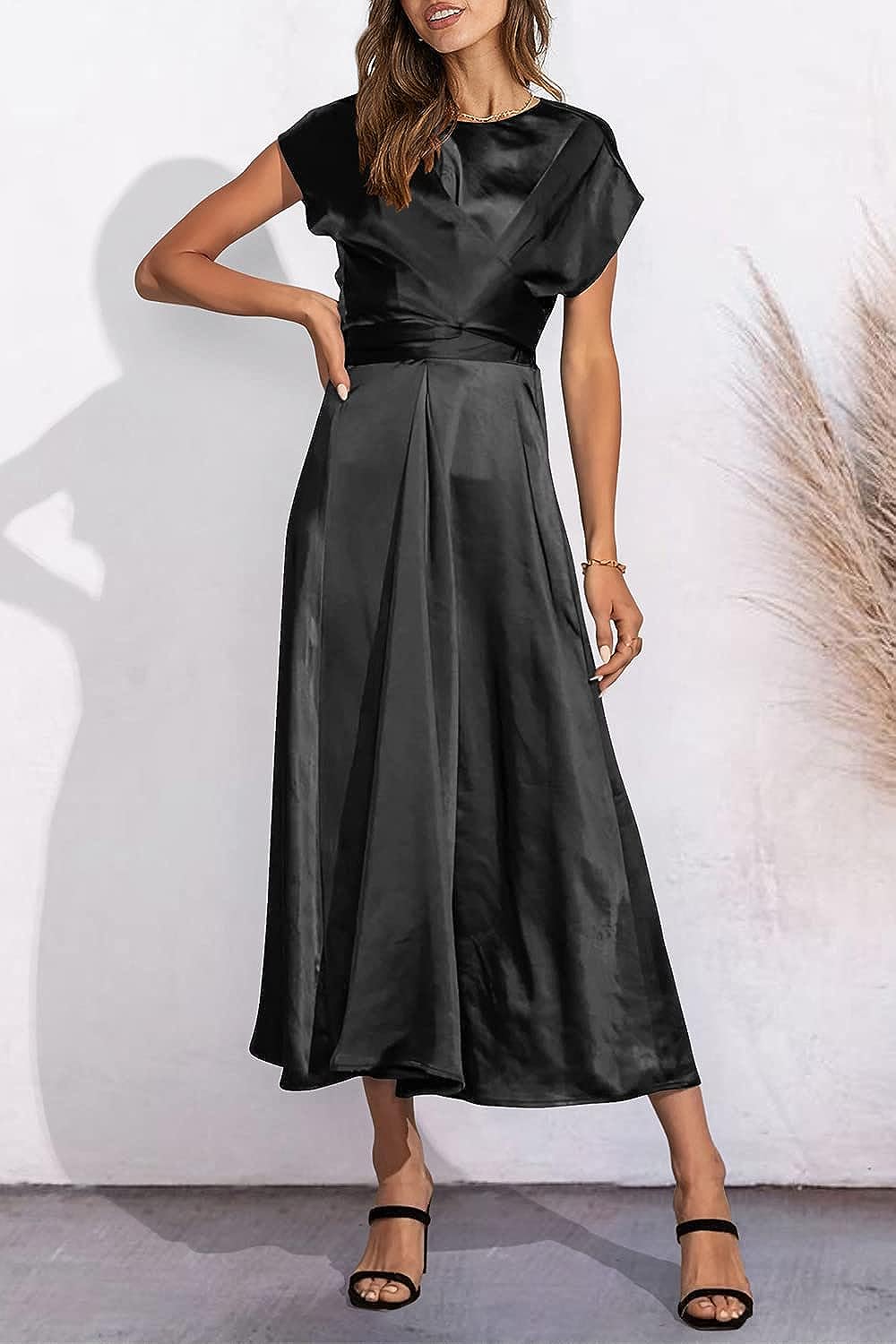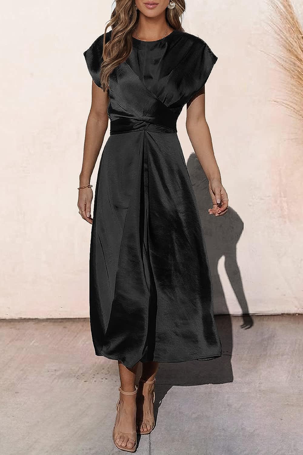 PRETTYGARDEN Women’s 2023 Summer Satin Midi Dress Cap Sleeve Tie Waist Elegant A-Line Flowy Dresses(Black)