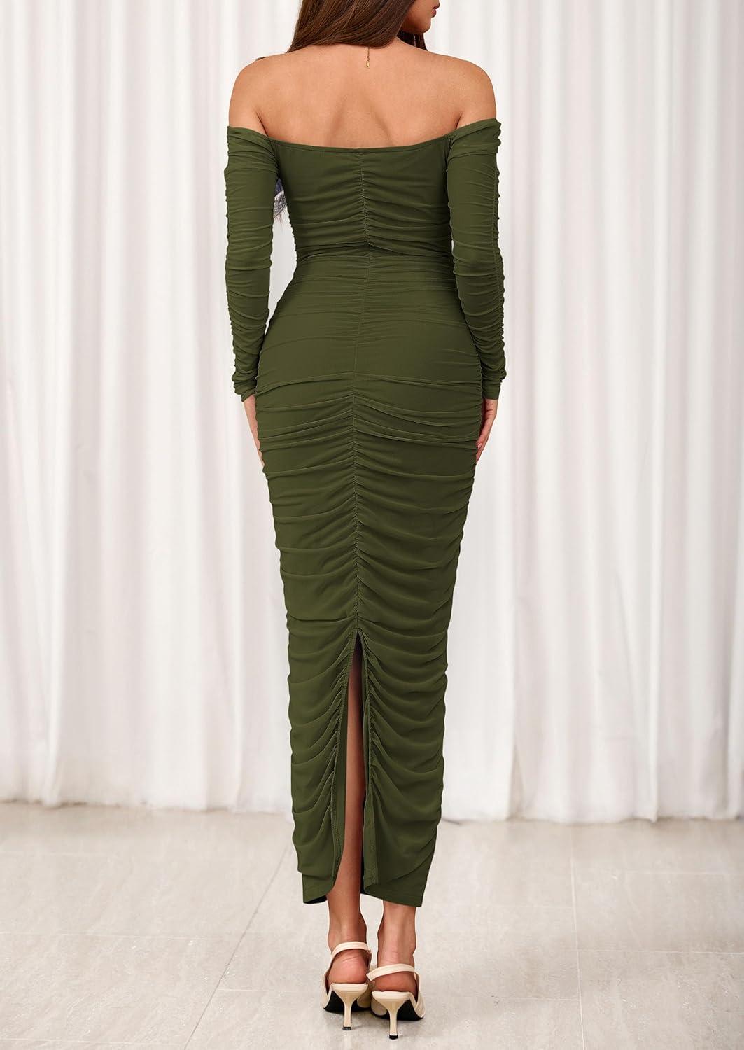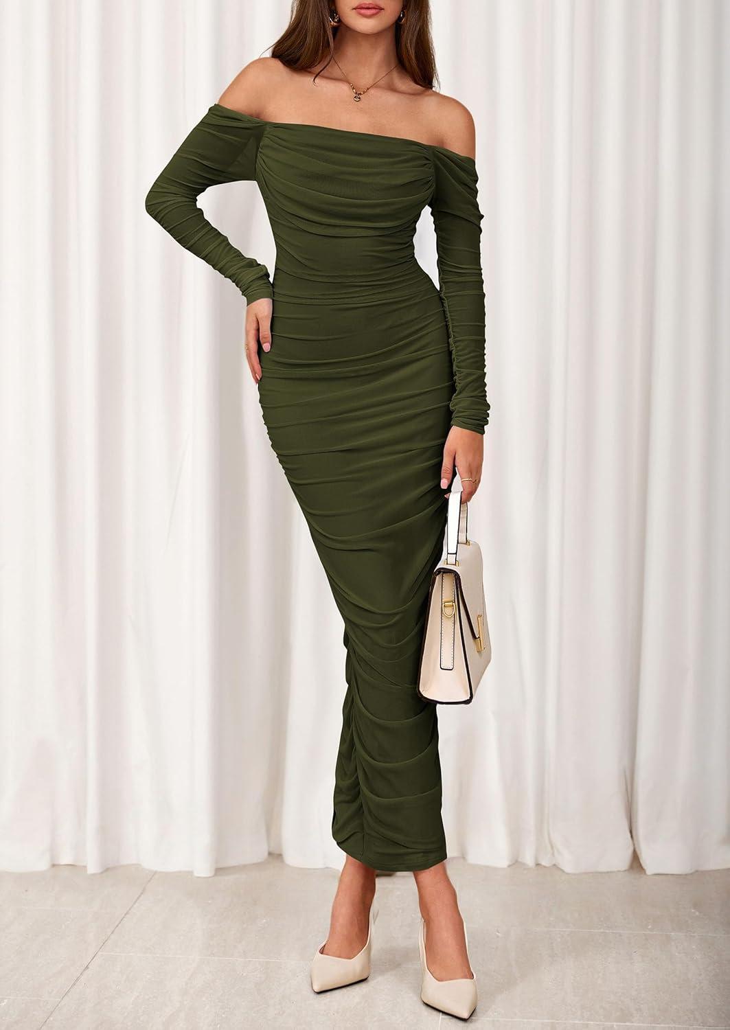 PRETTYGARDEN Womens 2025 Fall Long Sleeve Maxi Dress Off Shoulder Mesh Ruched Bodycon Trendy Long Wedding Guest Dresses(Army Green)