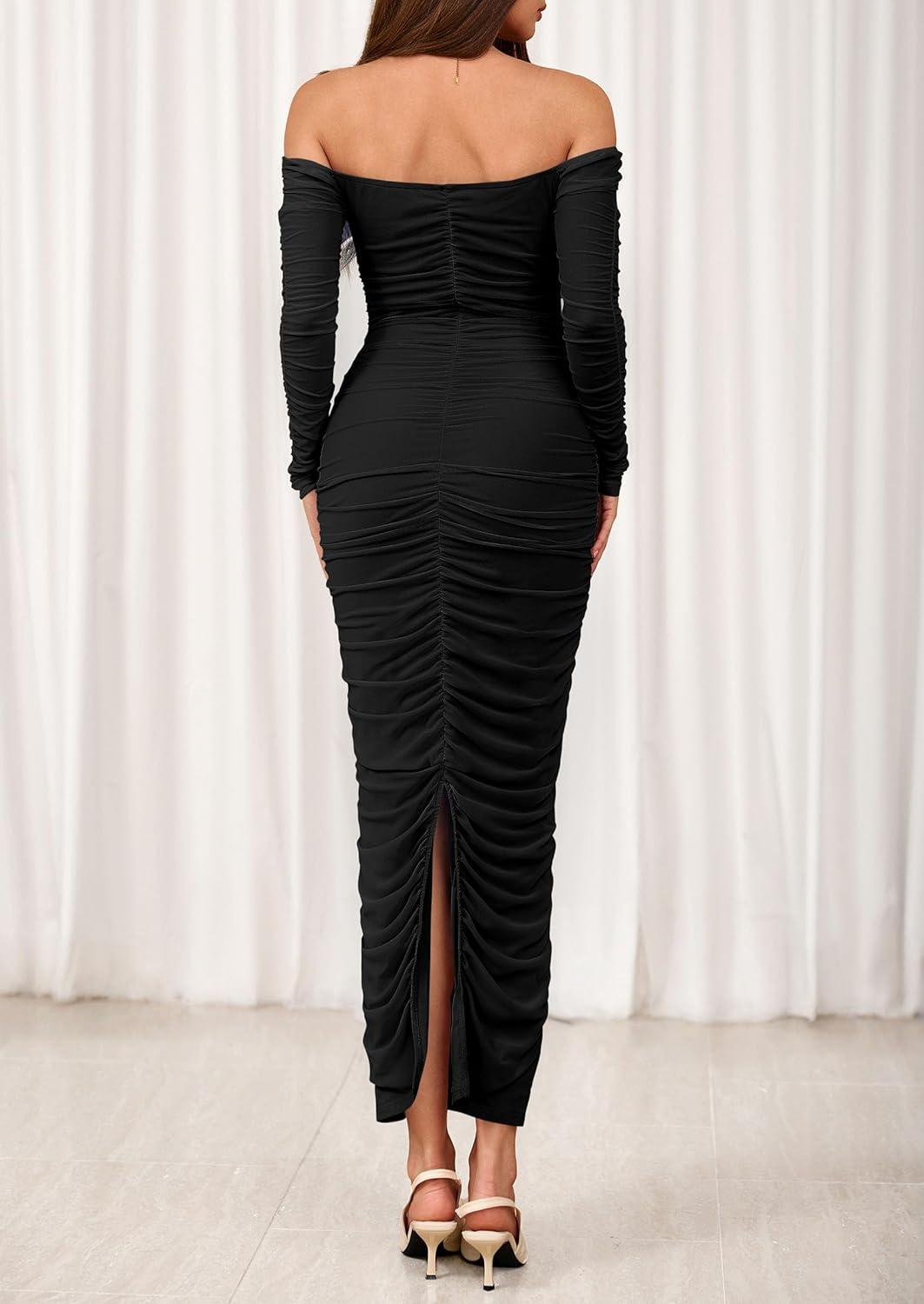 PRETTYGARDEN Womens 2025 Fall Long Sleeve Maxi Dress Off Shoulder Mesh Ruched Bodycon Trendy Long Wedding Guest Dresses(Black)