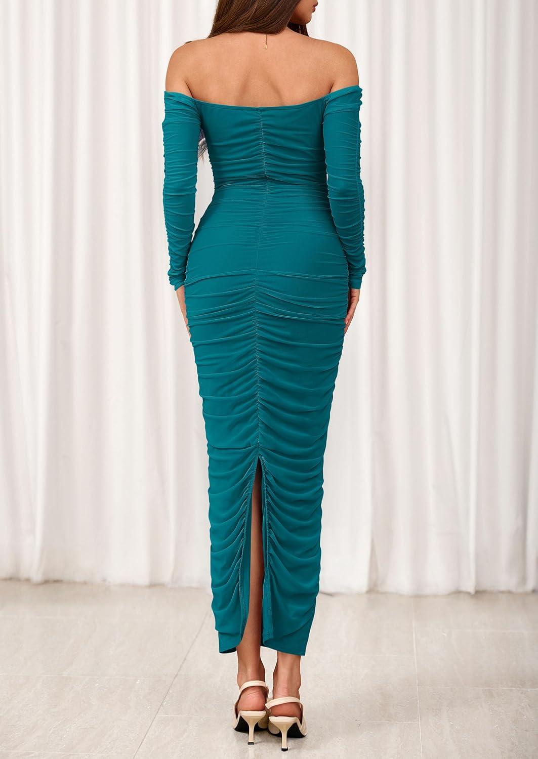 PRETTYGARDEN Womens 2025 Fall Long Sleeve Maxi Dress Off Shoulder Mesh Ruched Bodycon Trendy Long Wedding Guest Dresses(Lake Blue)