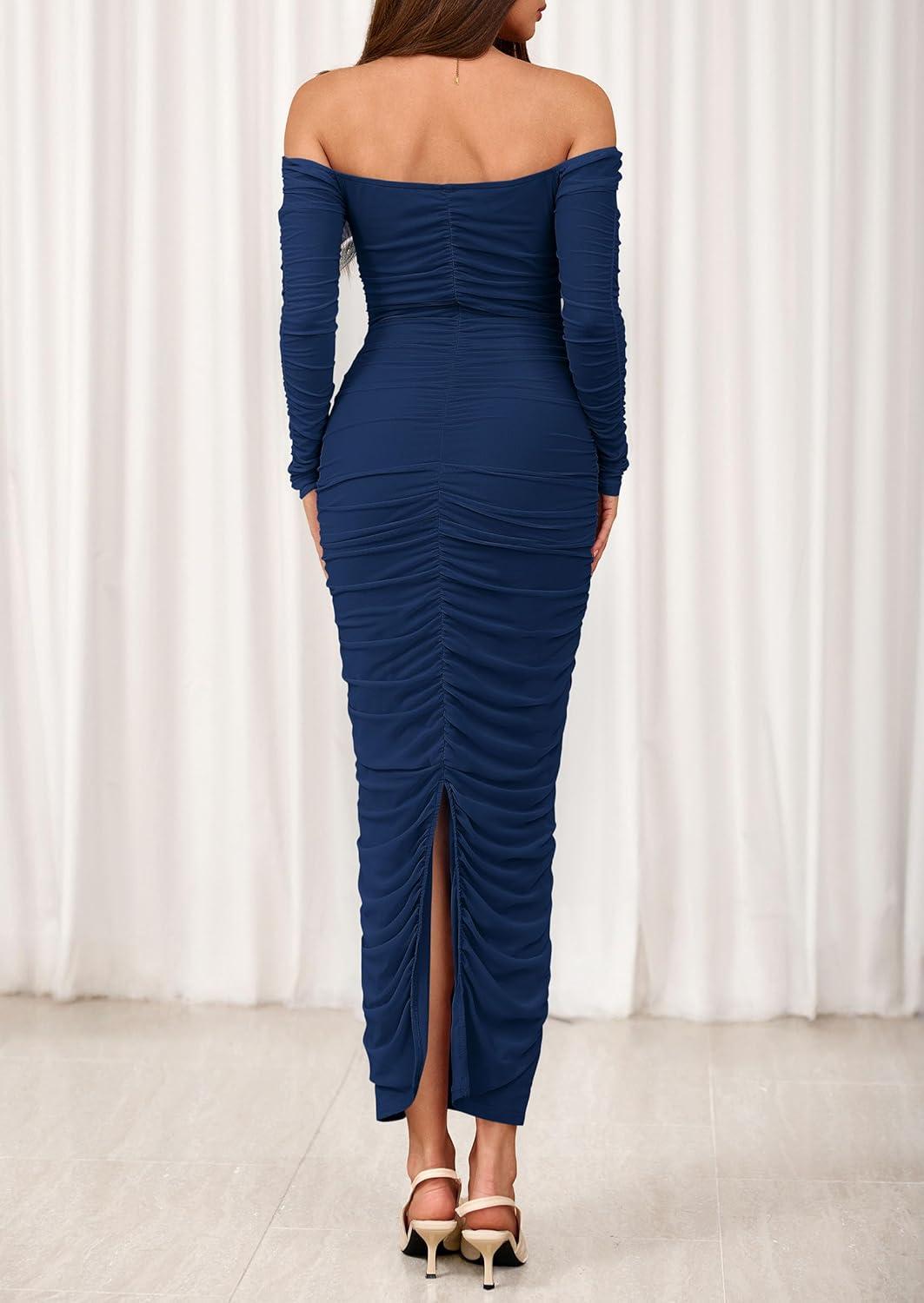 PRETTYGARDEN Womens 2025 Fall Long Sleeve Maxi Dress Off Shoulder Mesh Ruched Bodycon Trendy Long Wedding Guest Dresses(Navy Blue)