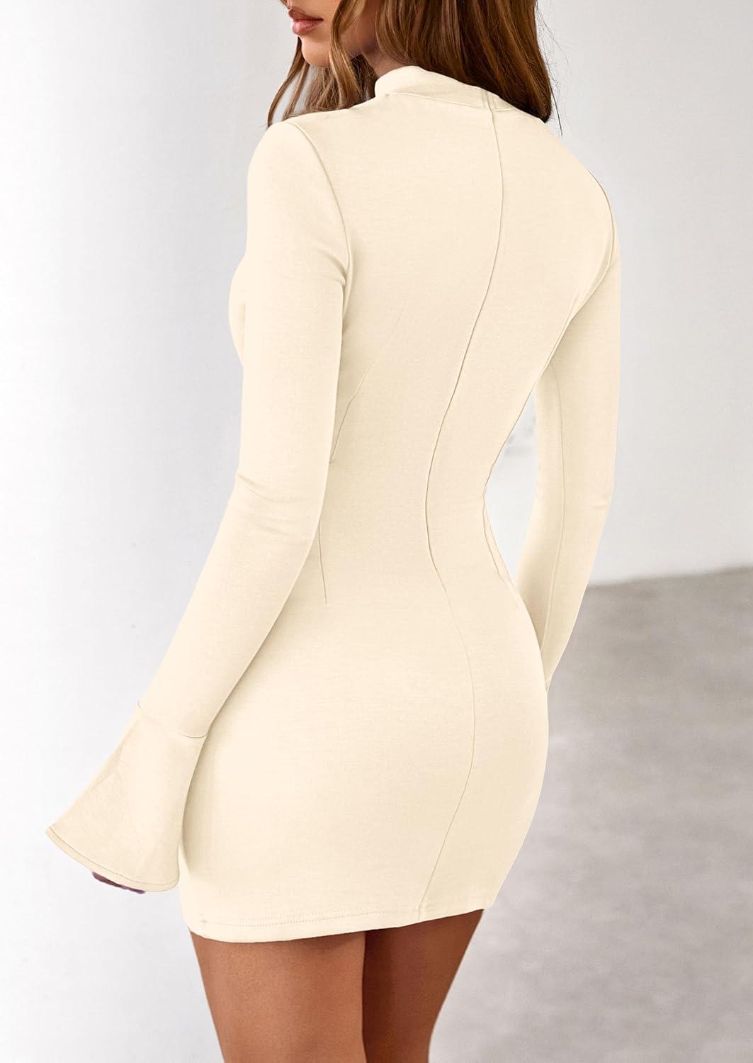 PRETTYGARDEN Women’s 2025 Fall Short Formal Dresses Long Sleeve Mock Neck Elegant Wedding Guest Party Club Bodycon Mini Dress(Beige)