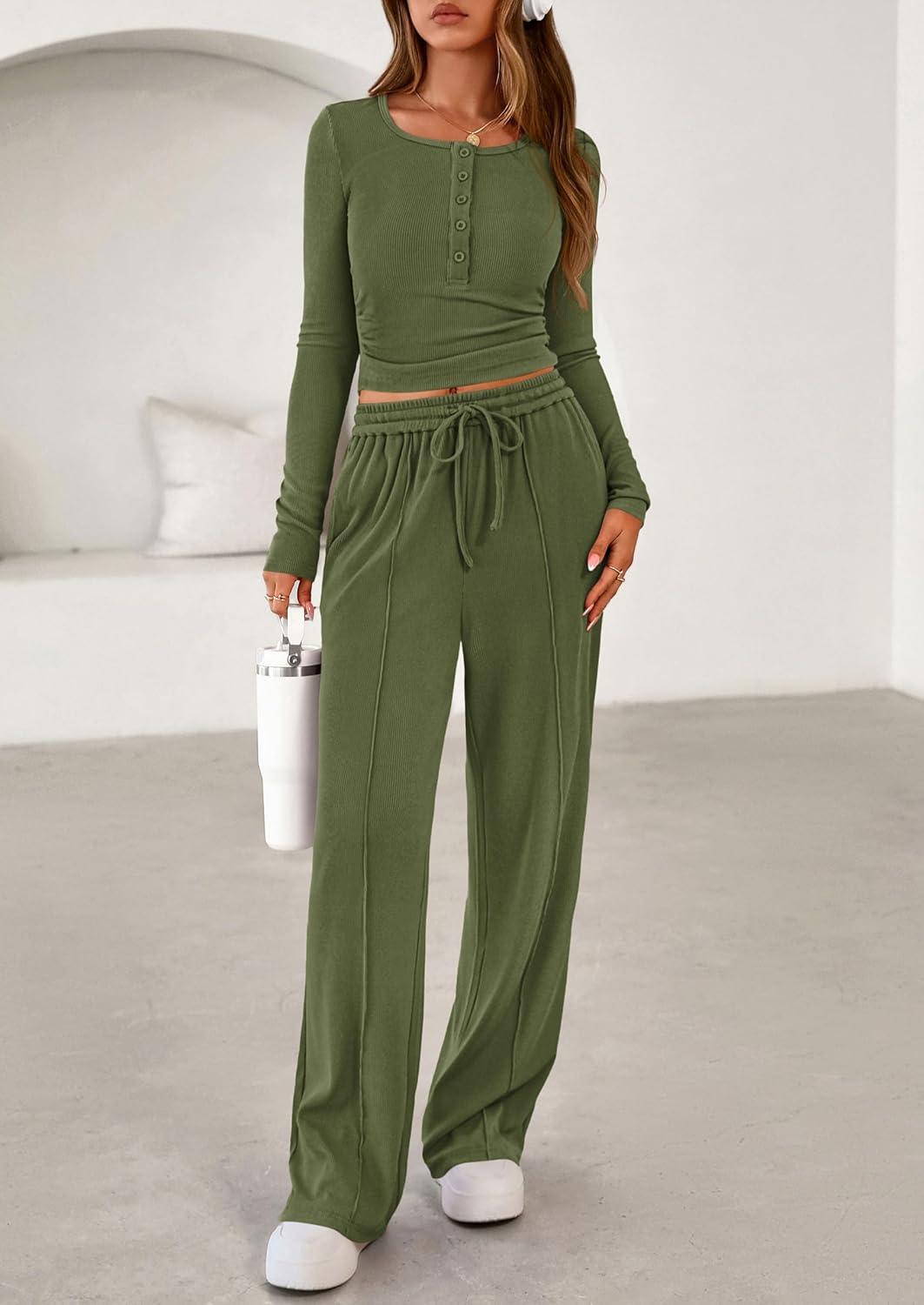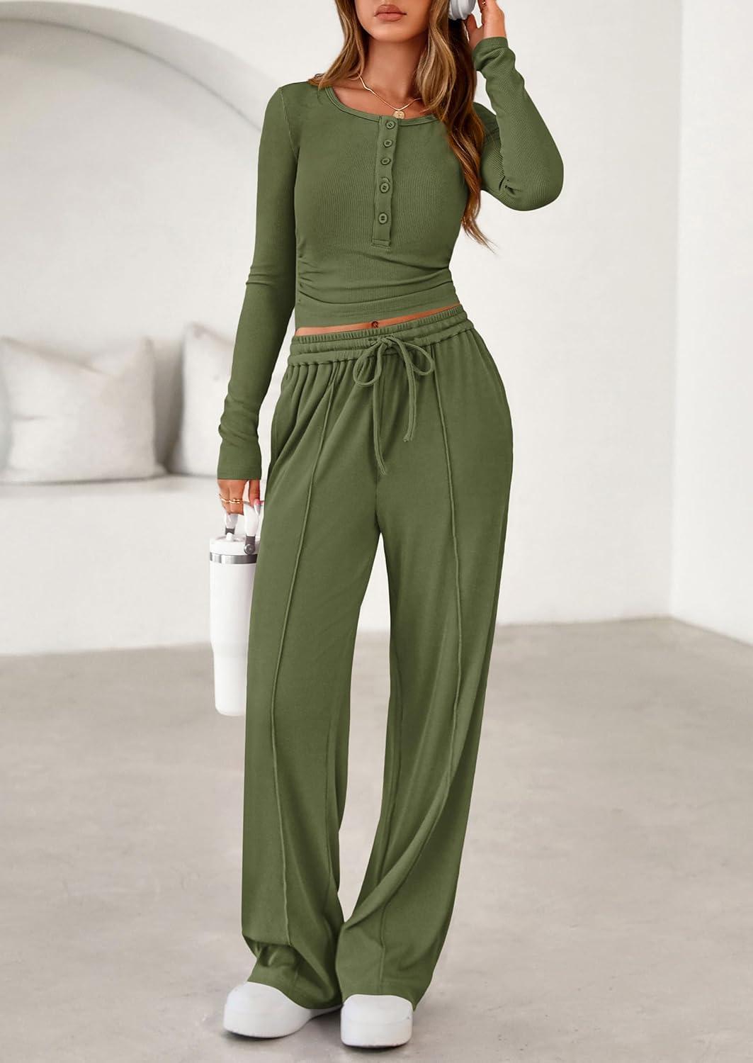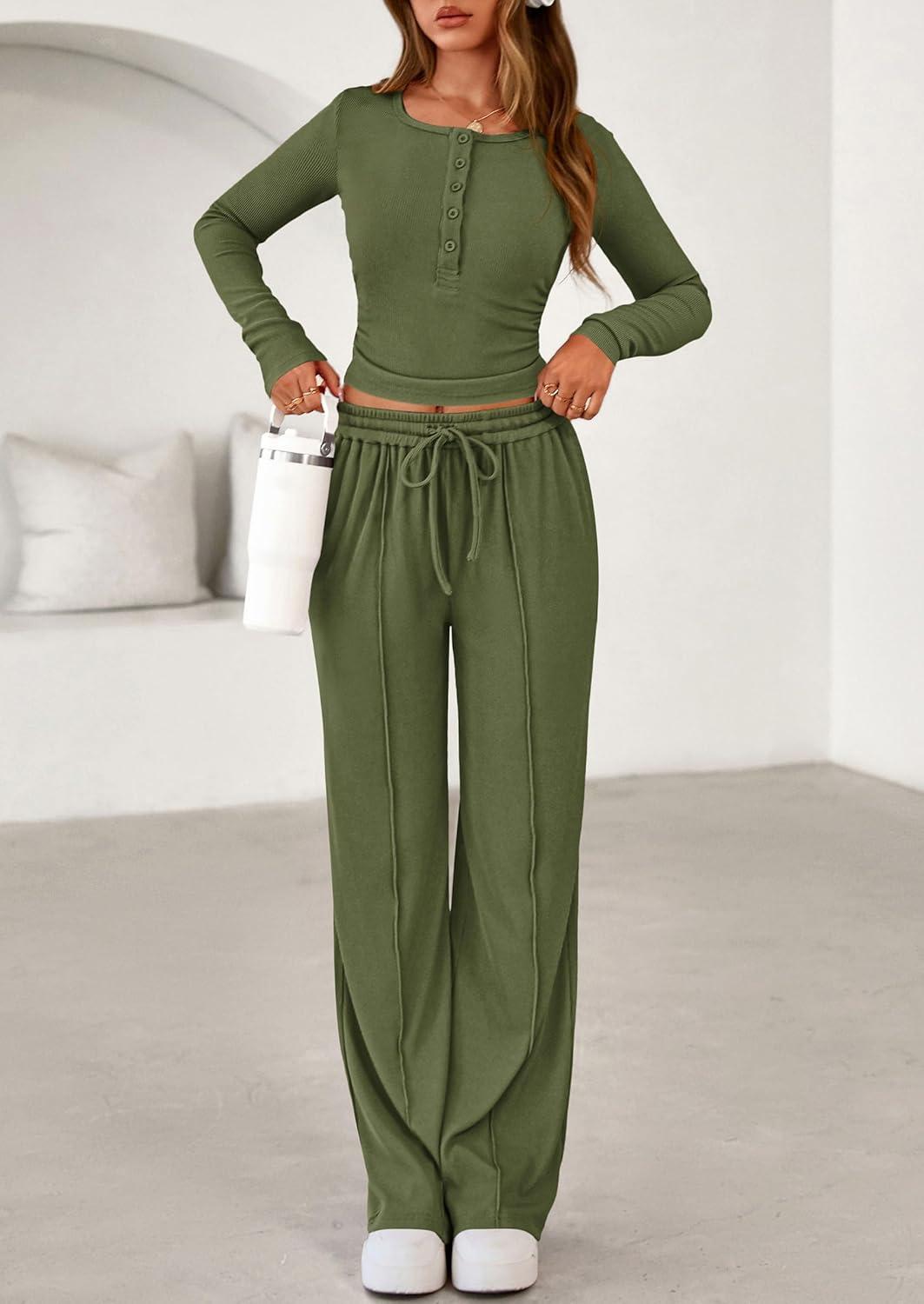 PRETTYGARDEN Women's 2025 Fall Trendy 2 Piece Outfits Lounge Sets Long Sleeve Top Henley Shirts Wide Leg Pants Travel Clothes(Army Green)