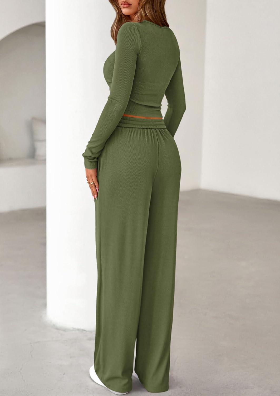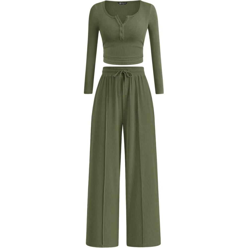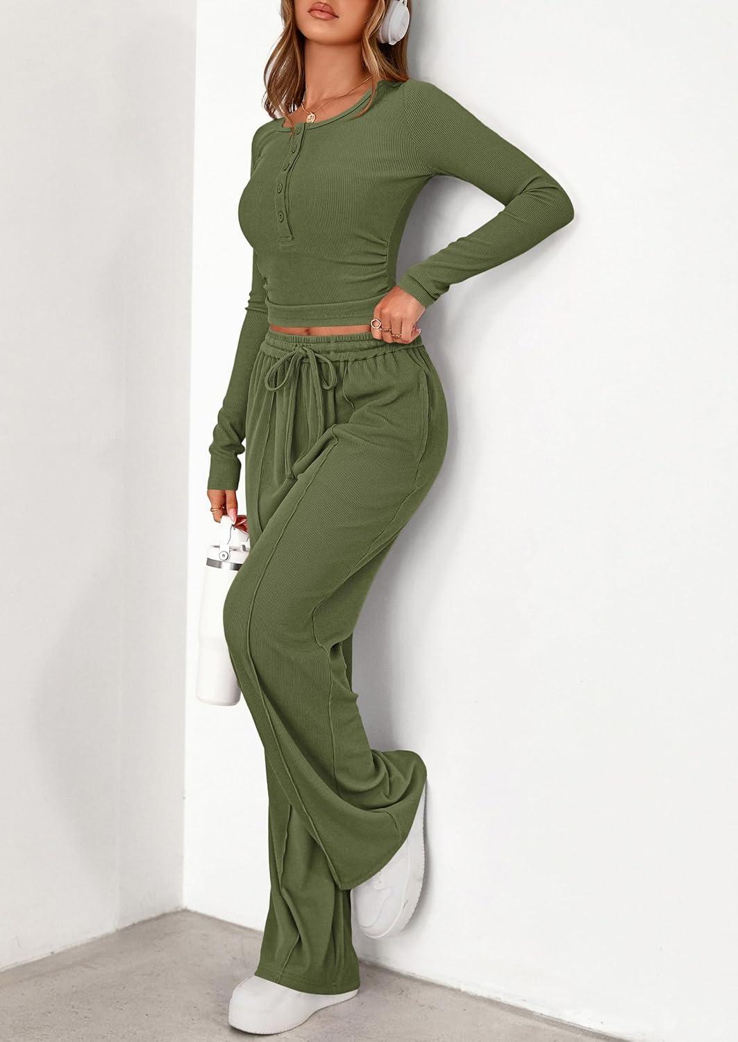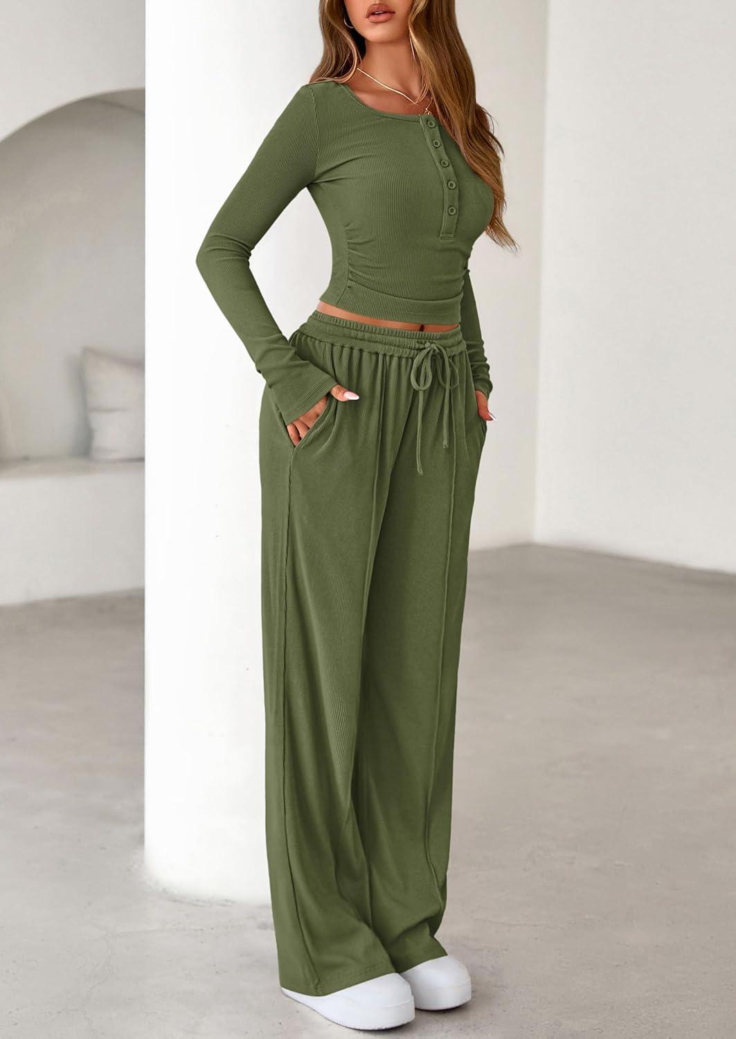 PRETTYGARDEN Women's 2025 Fall Trendy 2 Piece Outfits Lounge Sets Long Sleeve Top Henley Shirts Wide Leg Pants Travel Clothes(Army Green)