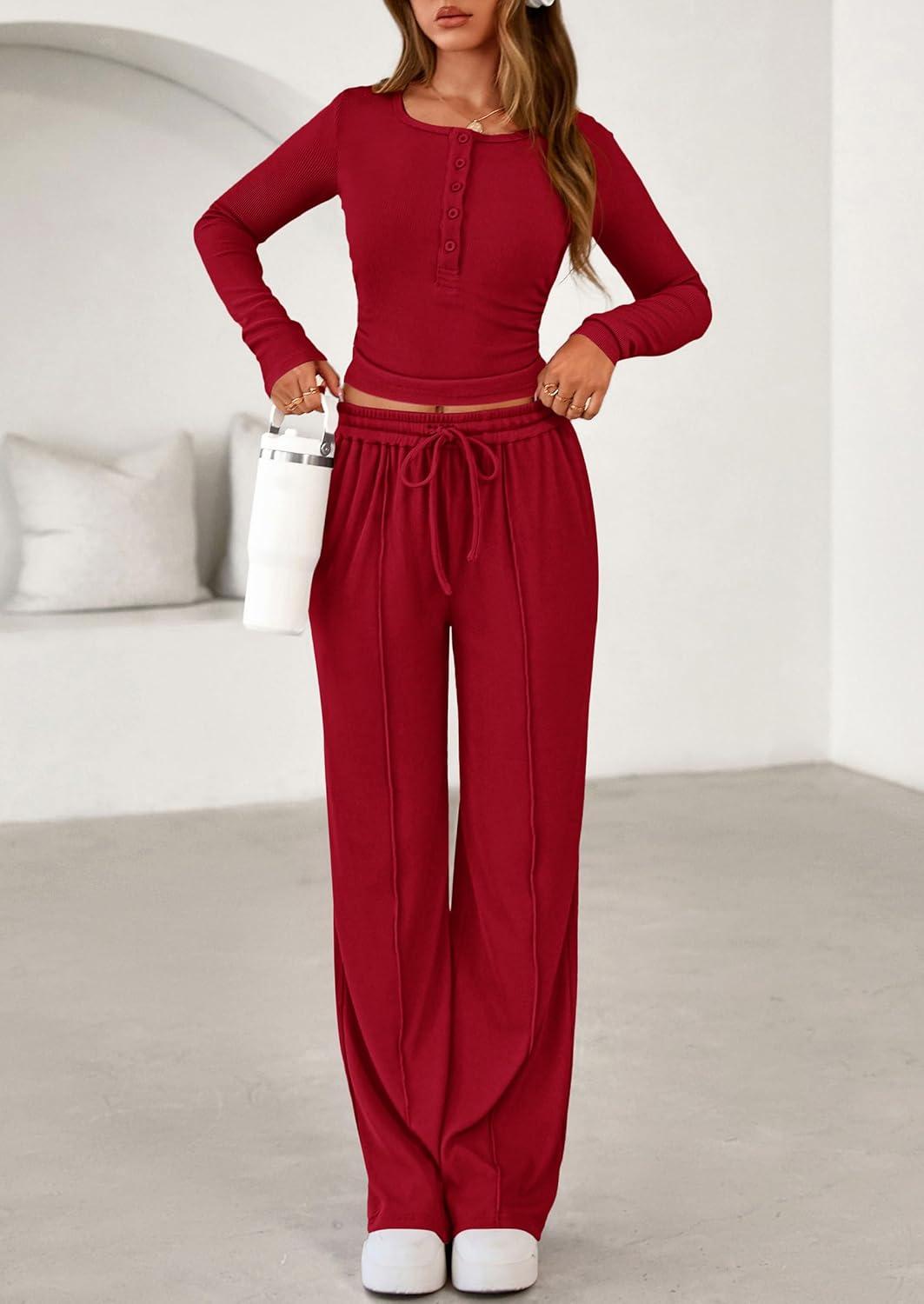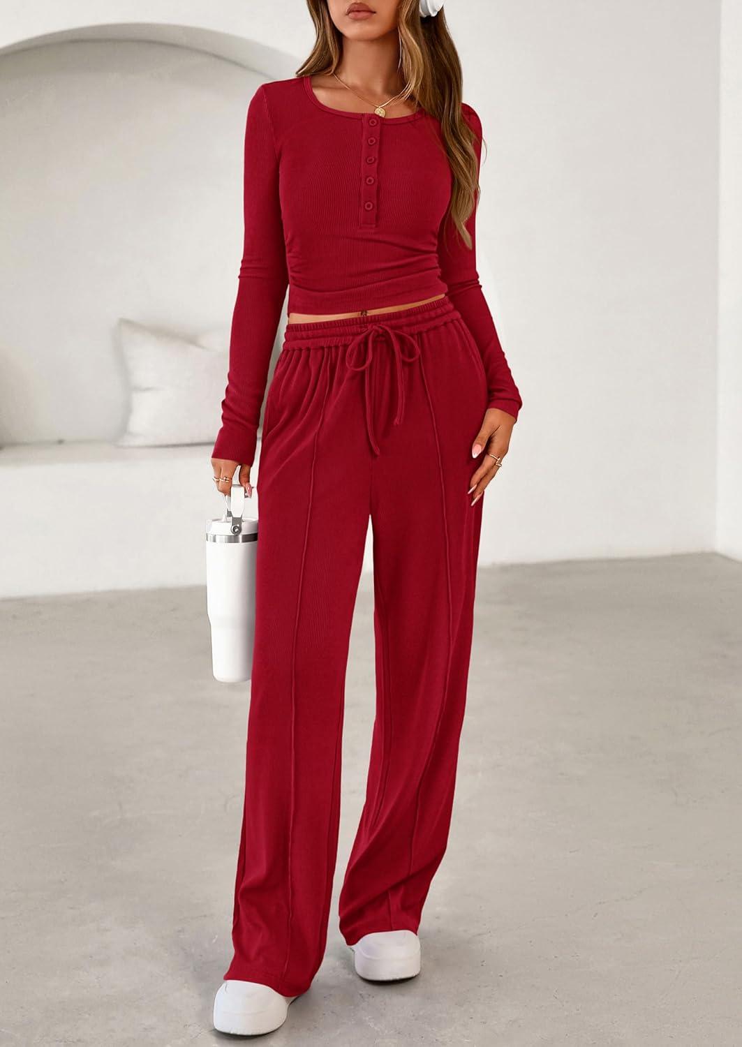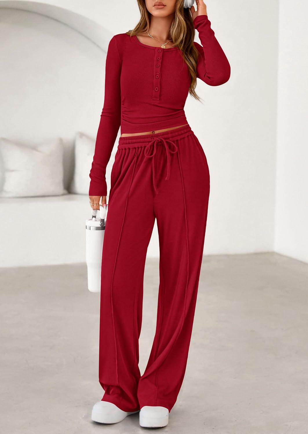 PRETTYGARDEN Women's 2025 Fall Trendy 2 Piece Outfits Lounge Sets Long Sleeve Top Henley Shirts Wide Leg Pants Travel Clothes(Red)
