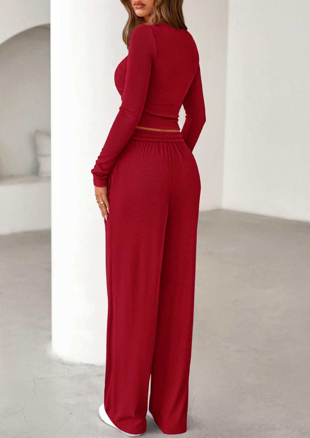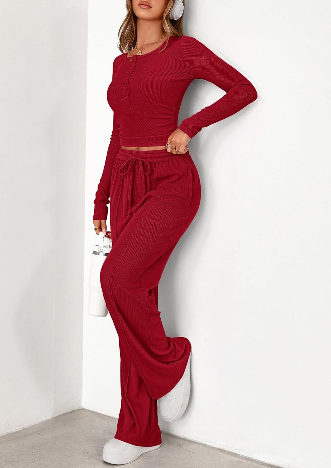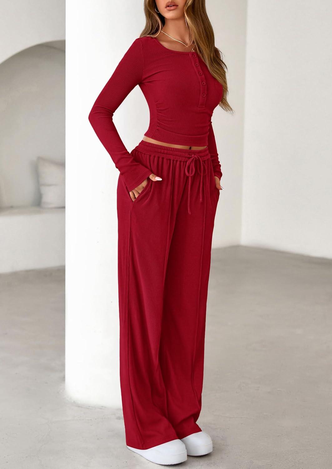 PRETTYGARDEN Women's 2025 Fall Trendy 2 Piece Outfits Lounge Sets Long Sleeve Top Henley Shirts Wide Leg Pants Travel Clothes(Red)
