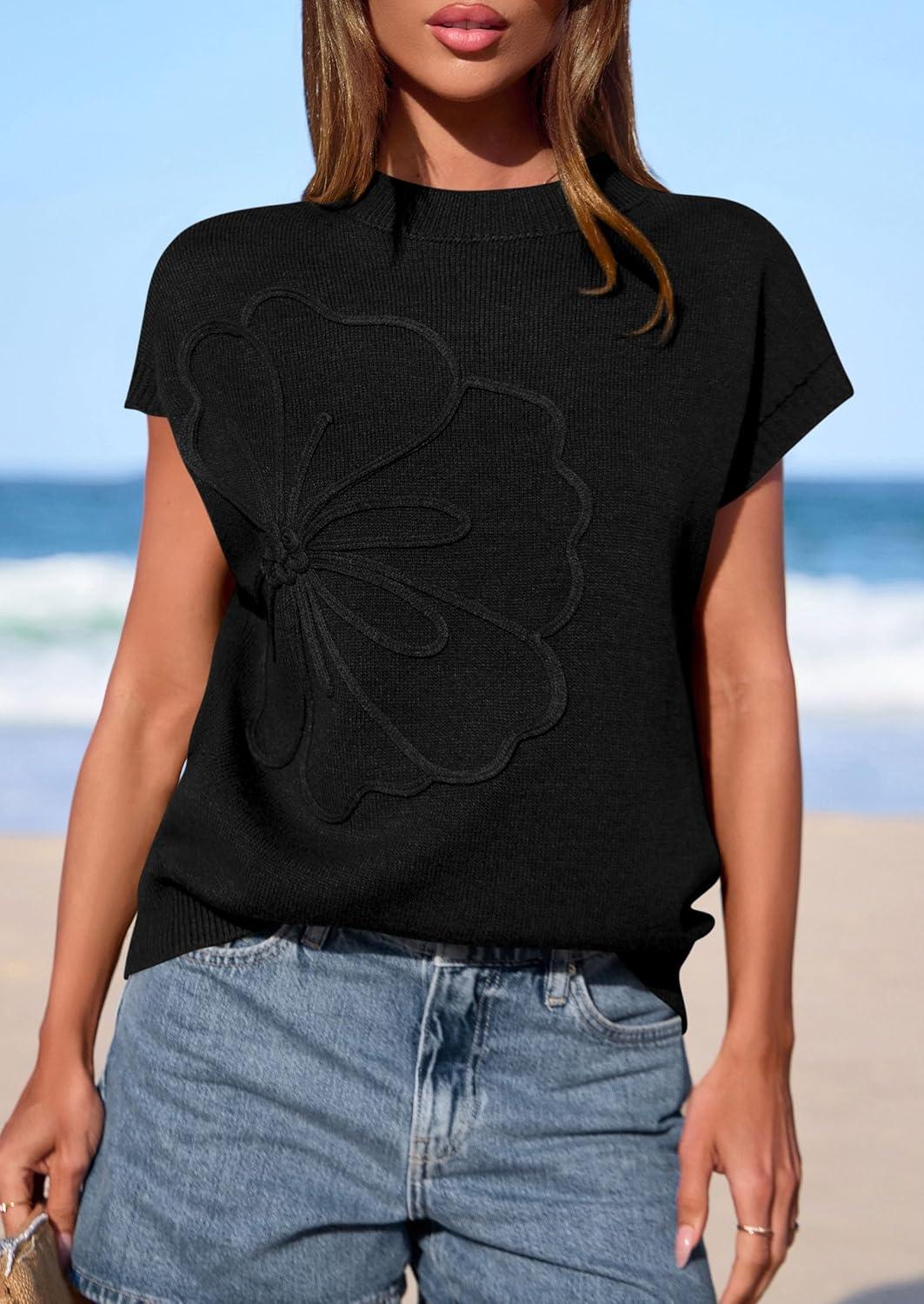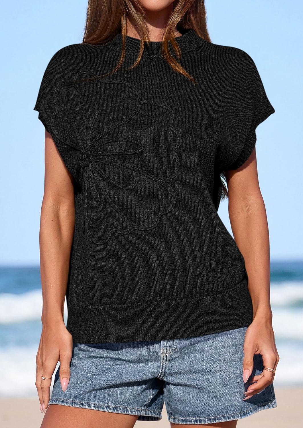 PRETTYGARDEN Women’s 2026 Spring Sweater Vest Trendy Flower Knit Short Sleeve Cute Pullover Tank Tops Summer Fashion Clothing(Black)