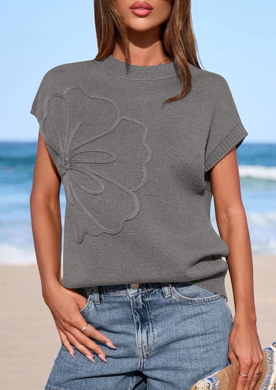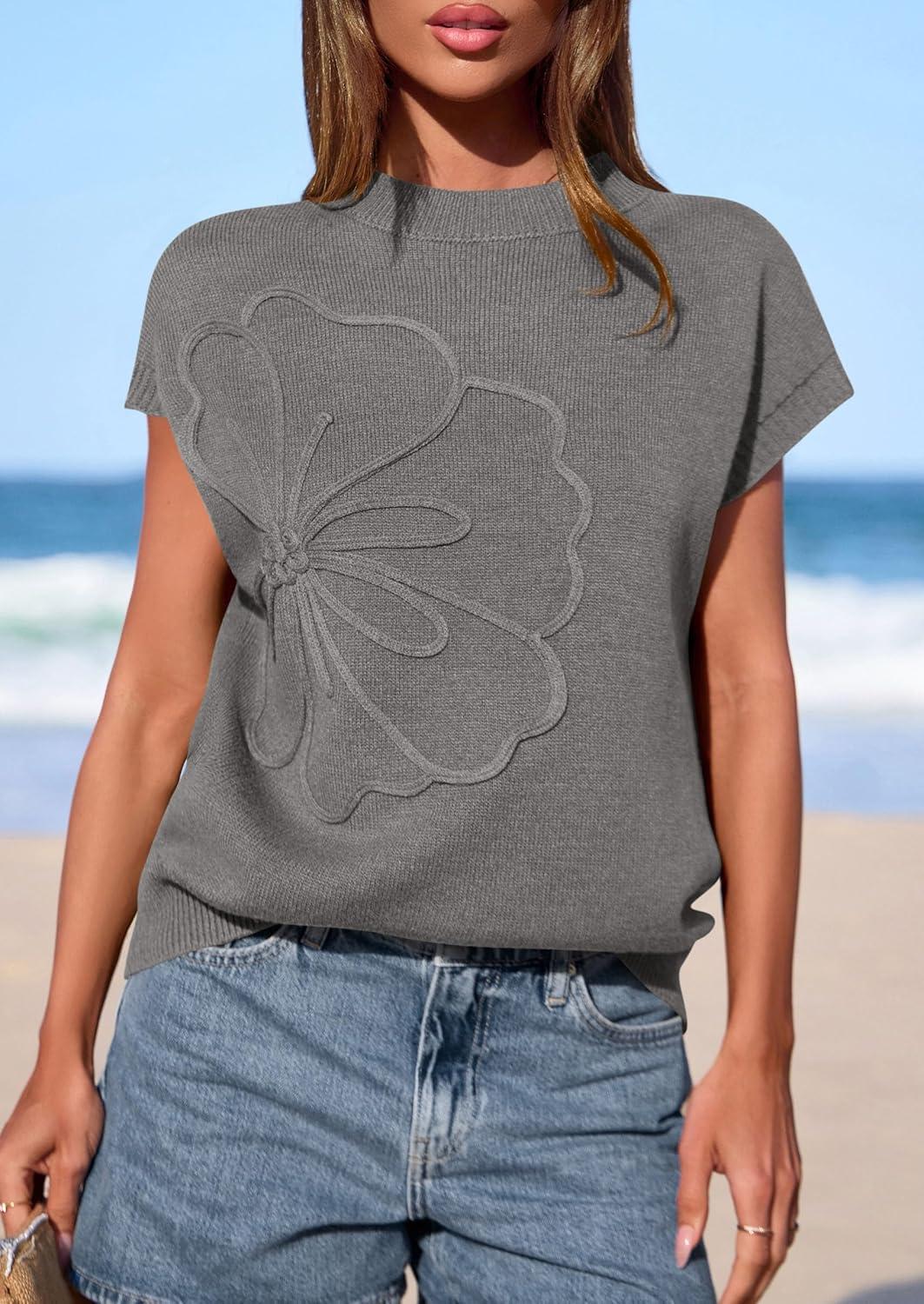 PRETTYGARDEN Women’s 2026 Spring Sweater Vest Trendy Flower Knit Short Sleeve Cute Pullover Tank Tops Summer Fashion Clothing(Grey)