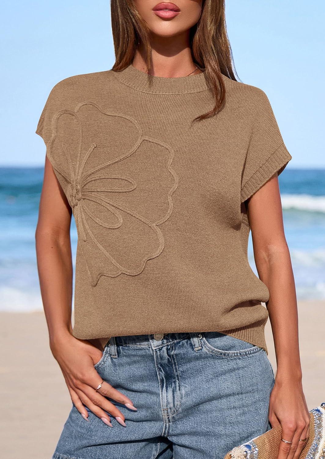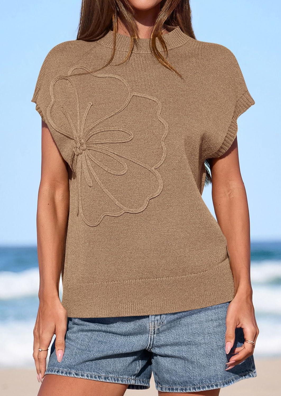PRETTYGARDEN Women’s 2026 Spring Sweater Vest Trendy Flower Knit Short Sleeve Cute Pullover Tank Tops Summer Fashion Clothing(Khaki)