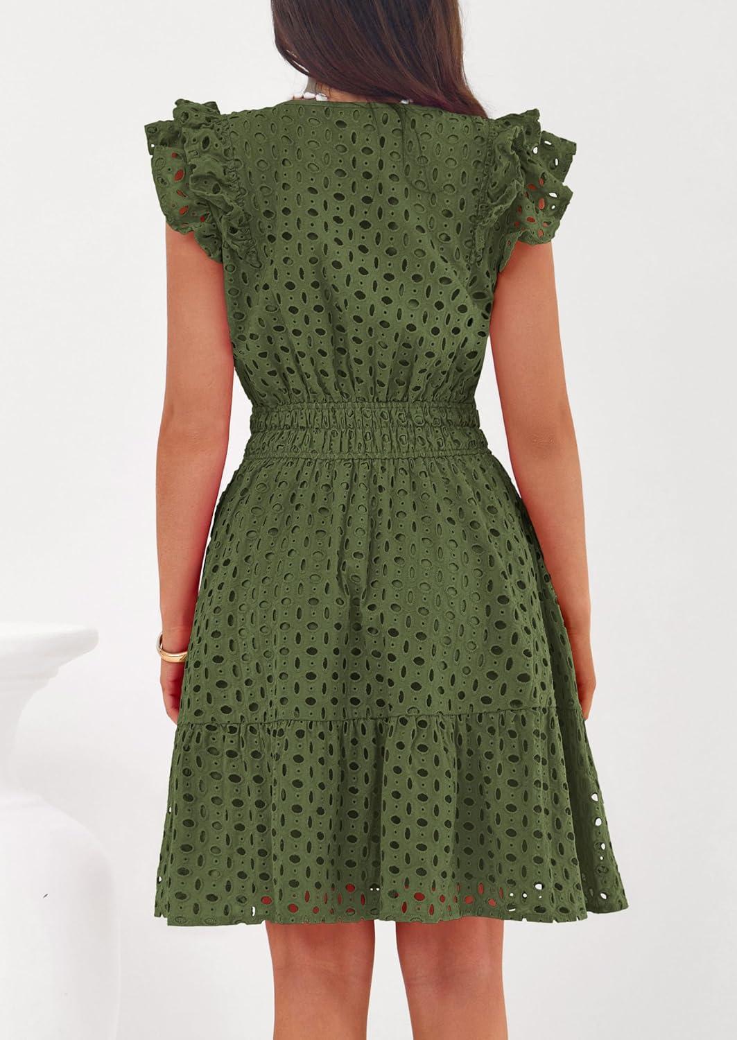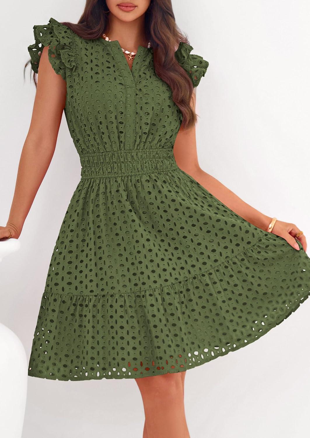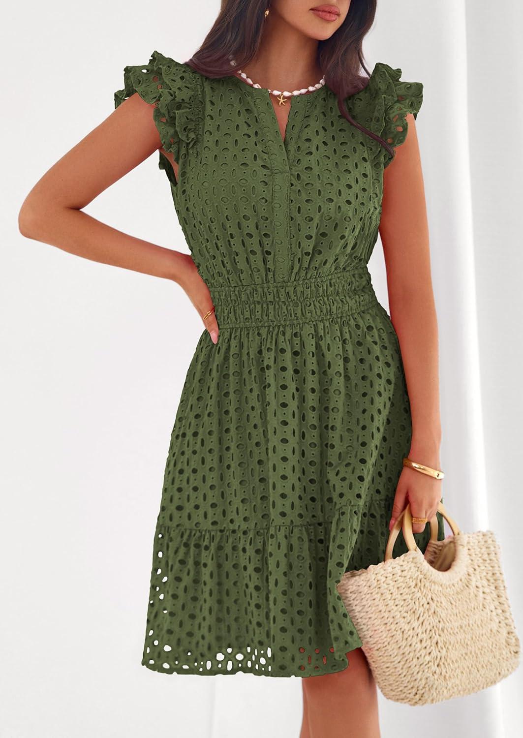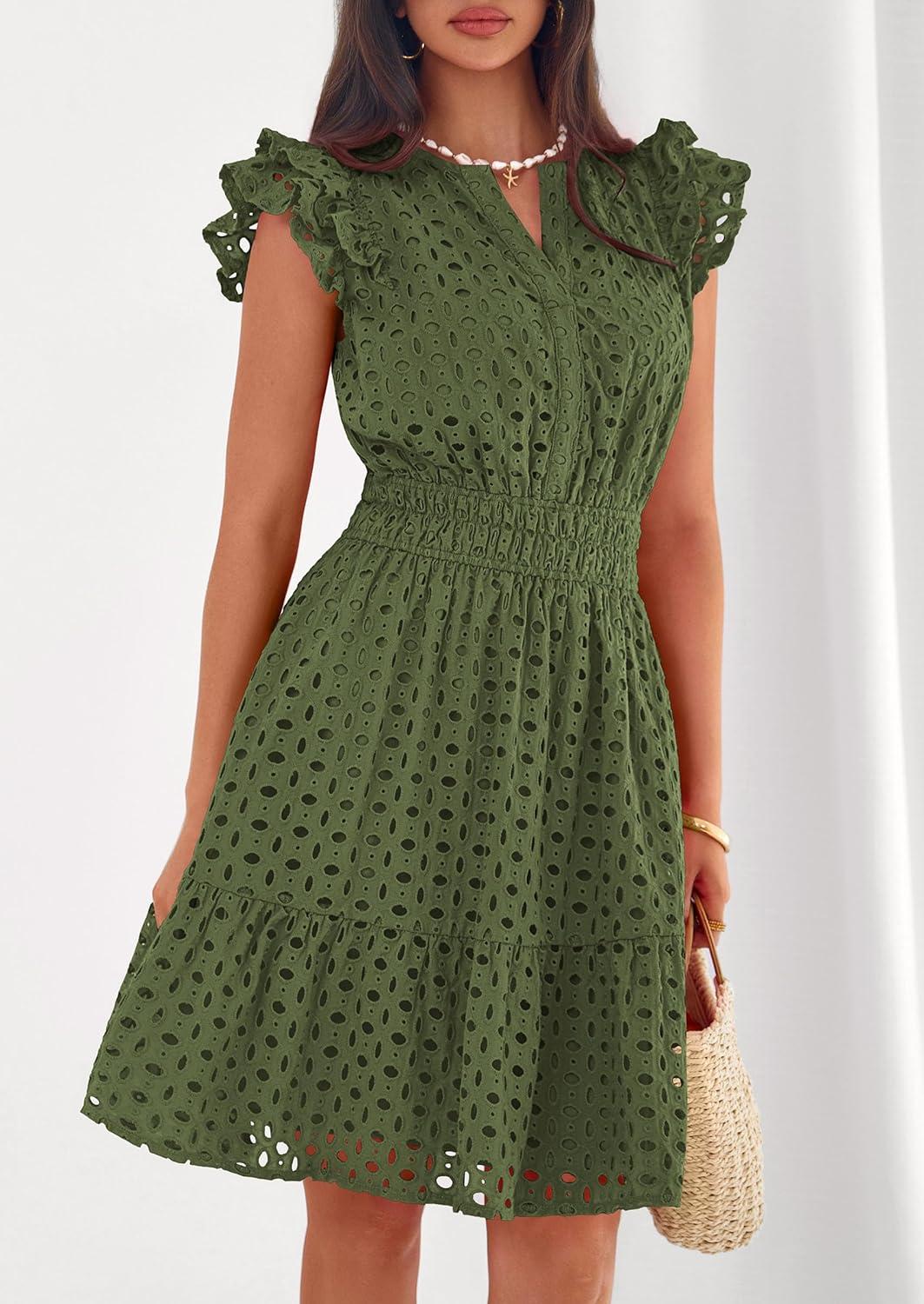 PRETTYGARDEN Women's 2026 Summer Sundresses Eyelet Cap Sleeve V Neck Short Boho Wedding Guest Dress Beach Vacation Clothes(Army Green)