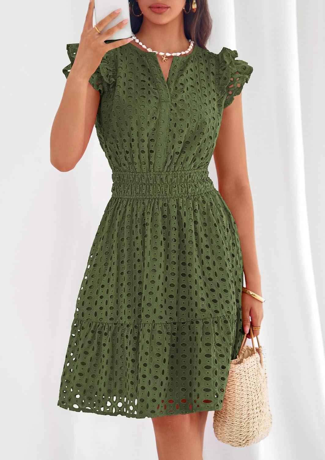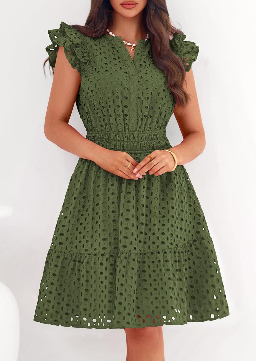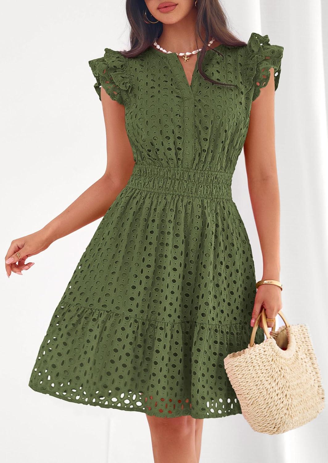 PRETTYGARDEN Women’s 2026 Summer Sundresses Eyelet Cap Sleeve V Neck Short Boho Wedding Guest Dress Beach Vacation Clothes(Army Green)