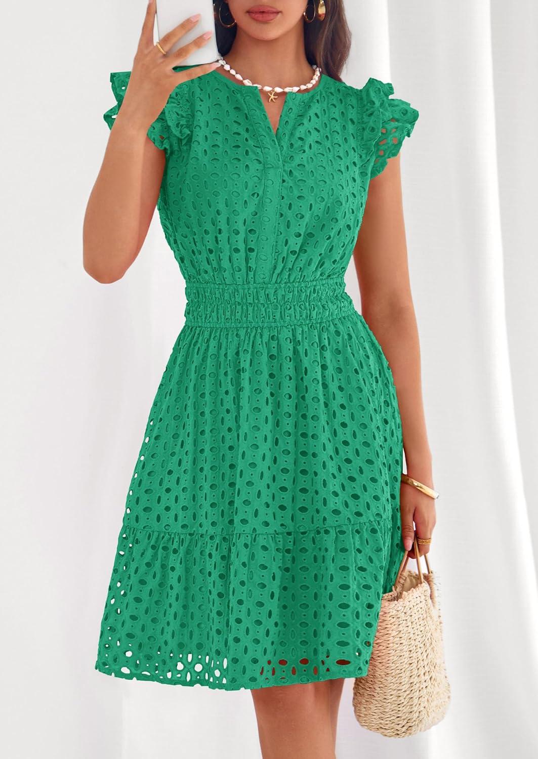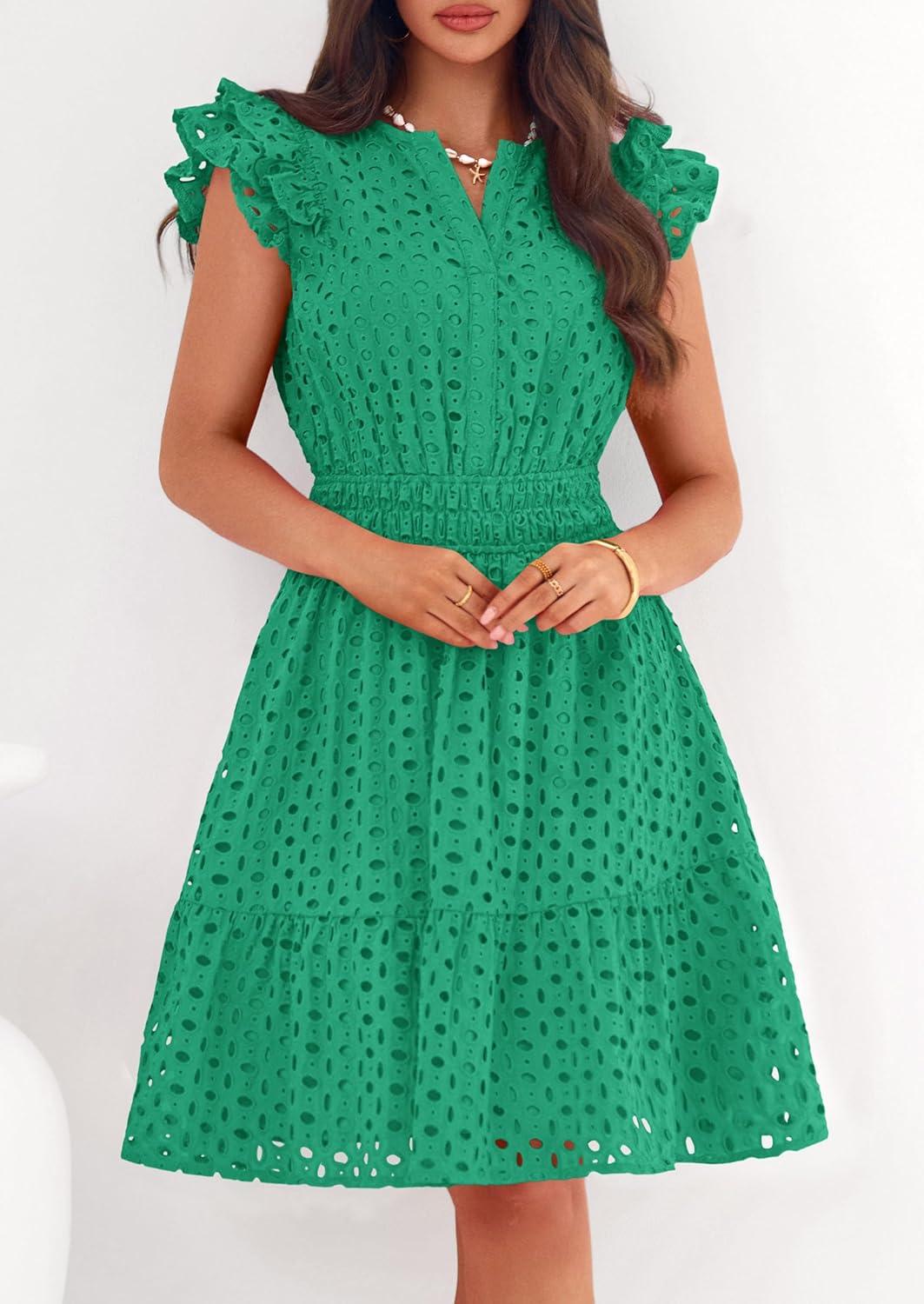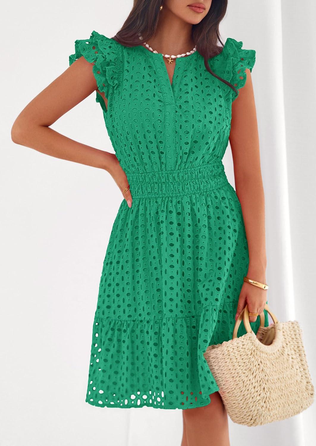 PRETTYGARDEN Women's 2026 Summer Sundresses Eyelet Cap Sleeve V Neck Short Boho Wedding Guest Dress Beach Vacation Clothes(Green)
