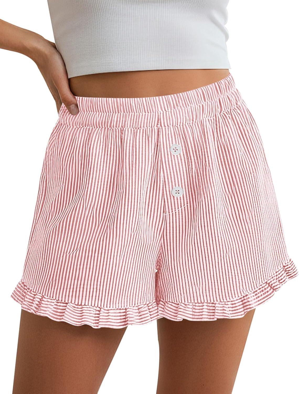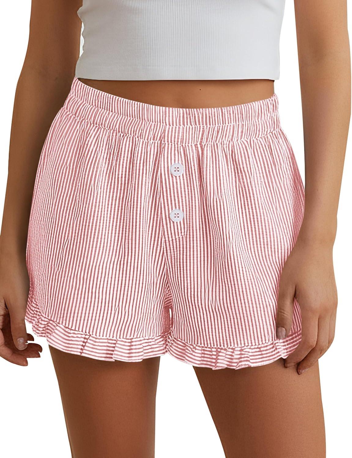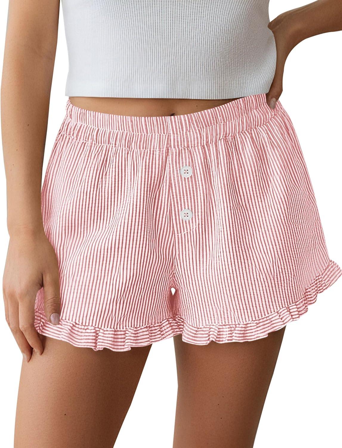 PRETTYGARDEN Womens Boxer Shorts Y2K Ruffle Pajama 2026 Summer Spring Lounge Sleep Striped Casual Beach Pj Bottoms Pockets(Stripe Light Pink)