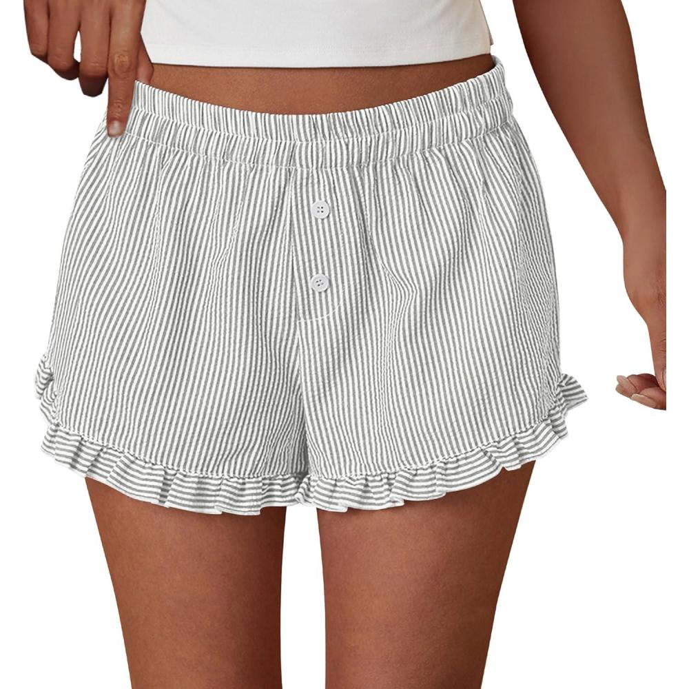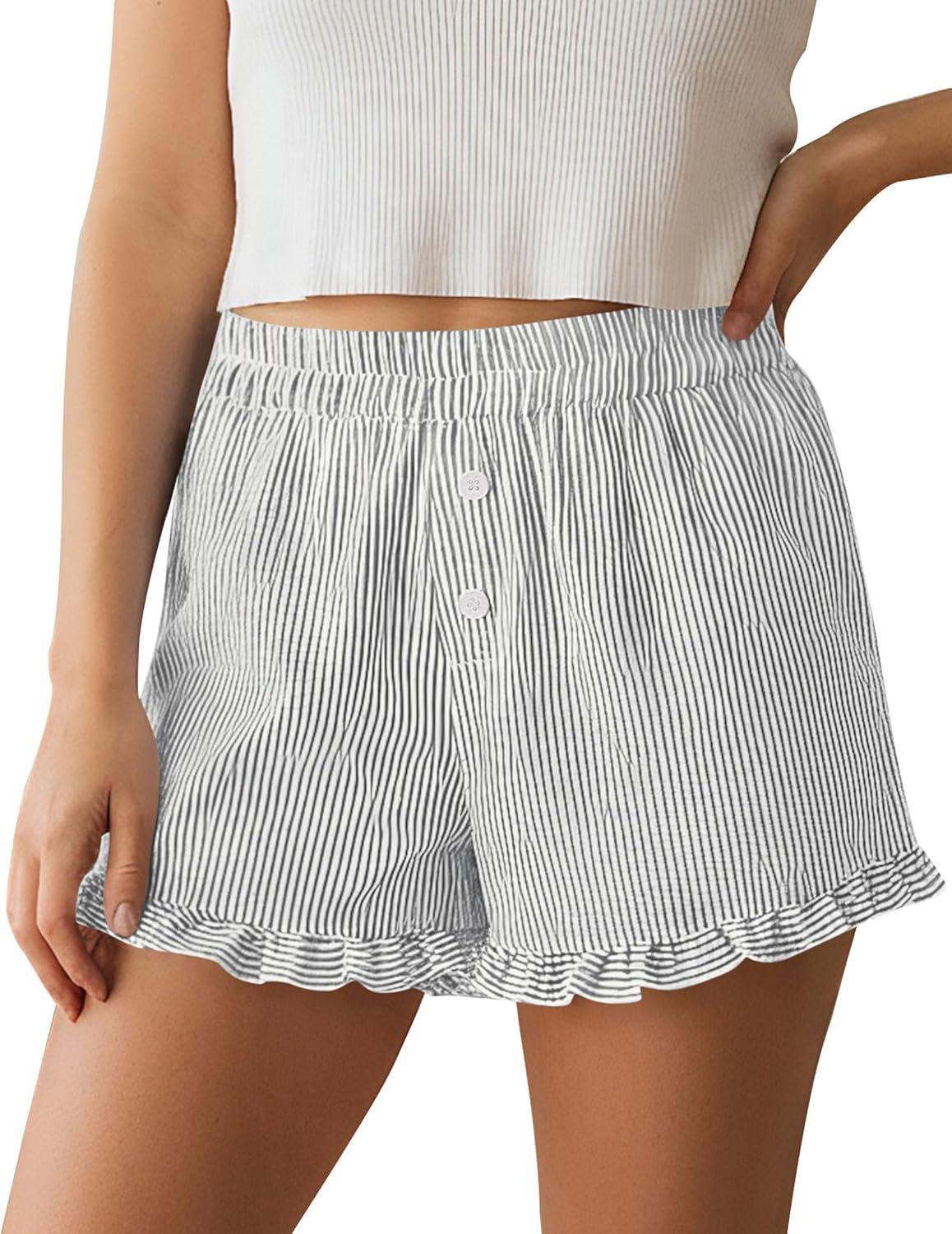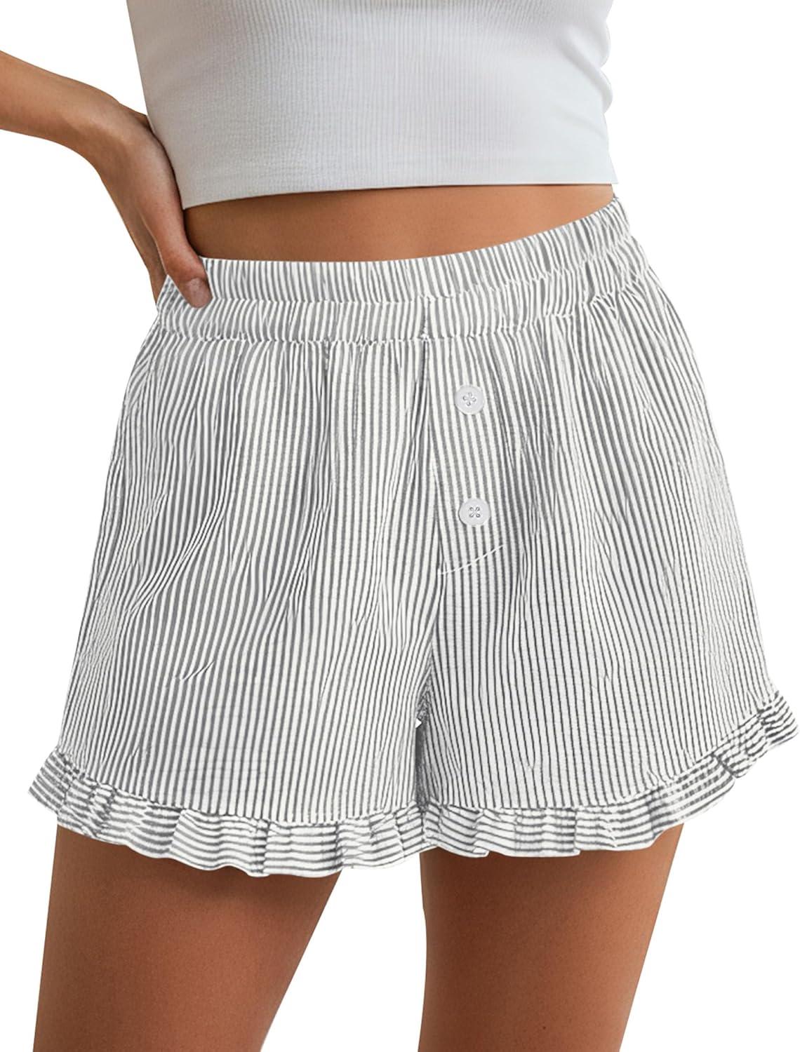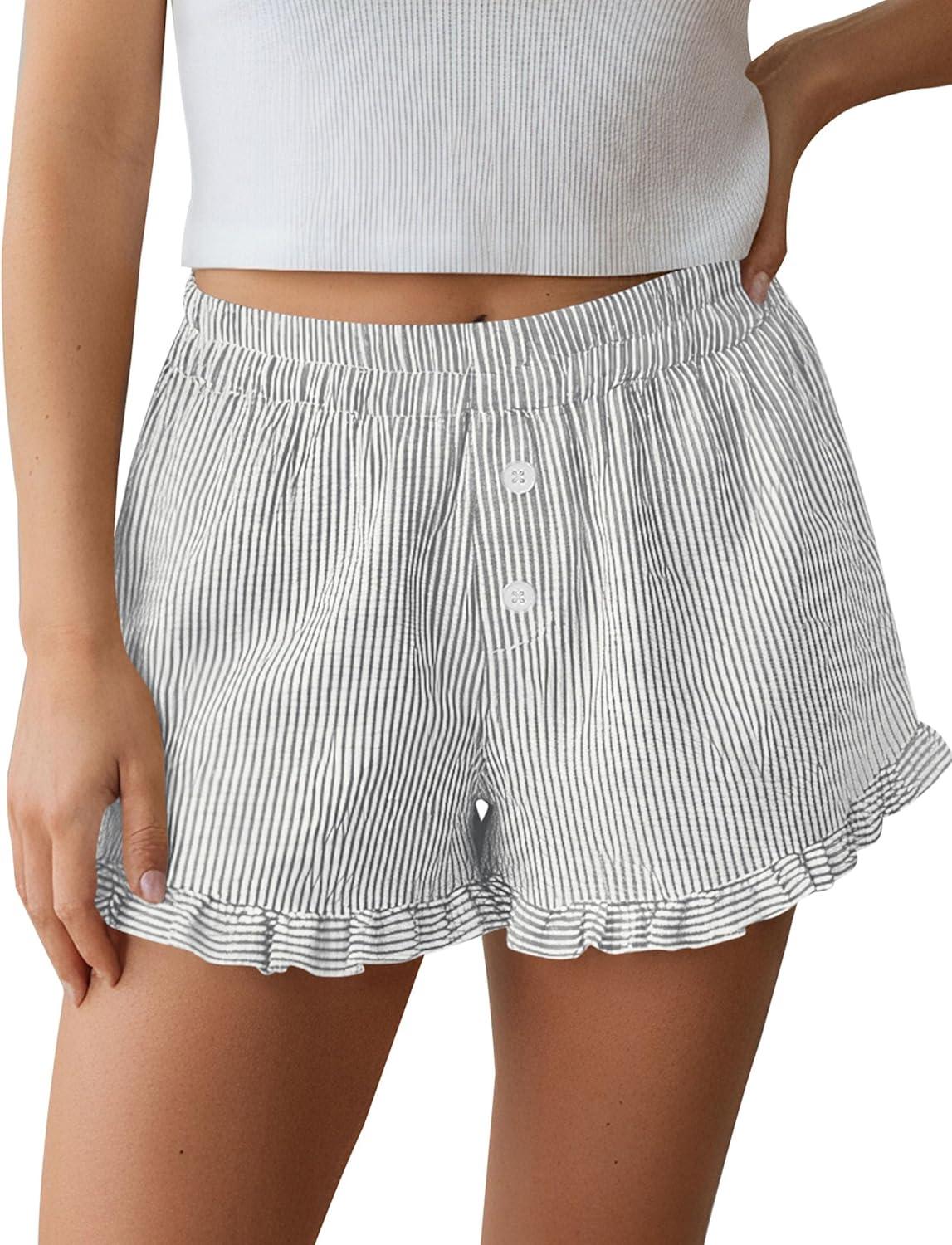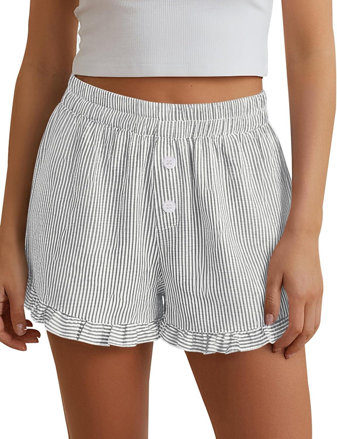 PRETTYGARDEN Womens Boxer Shorts Y2K Ruffle Pajama 2026 Summer Spring Lounge Sleep Striped Casual Beach Pj Bottoms Pockets(Striped Grey Blue)