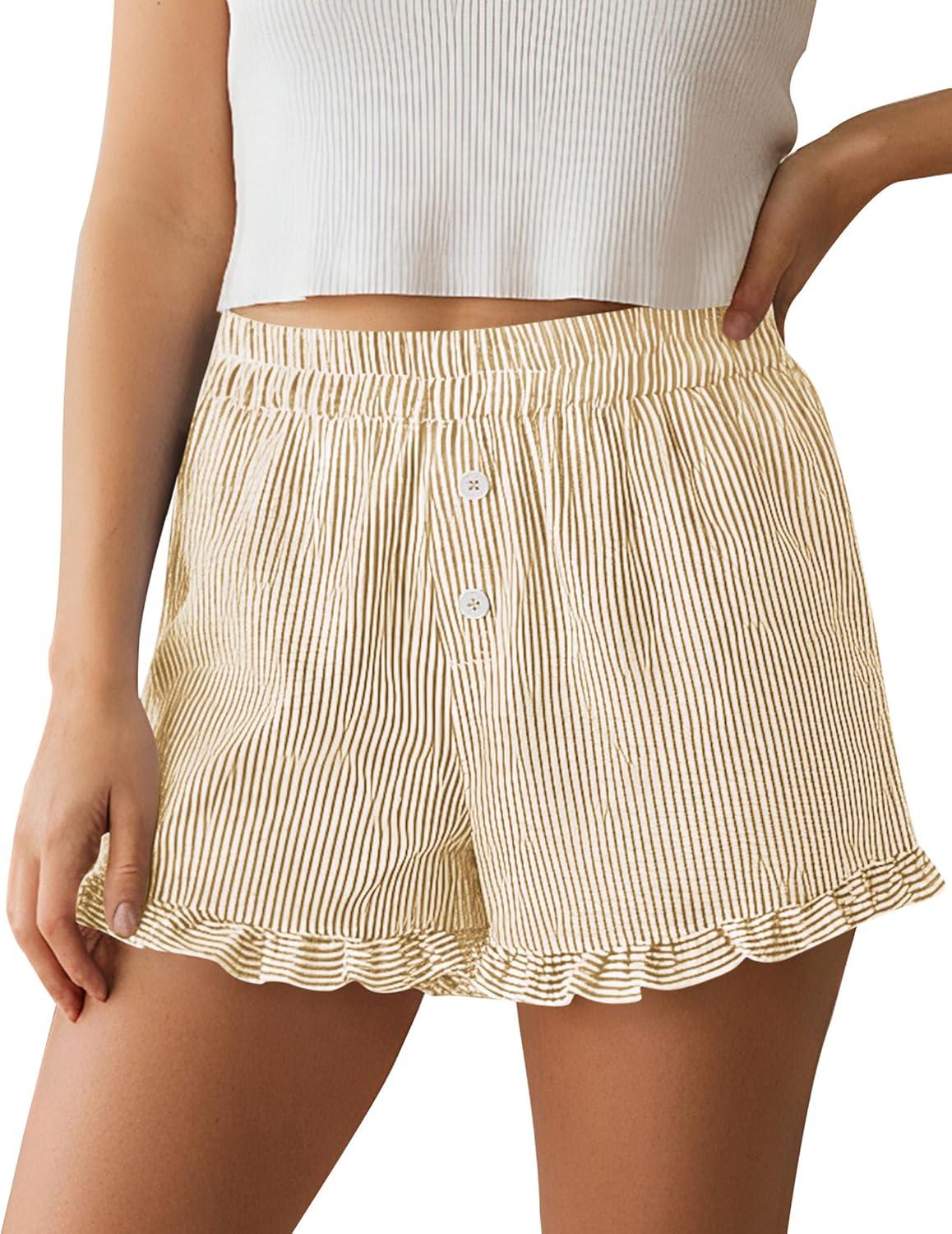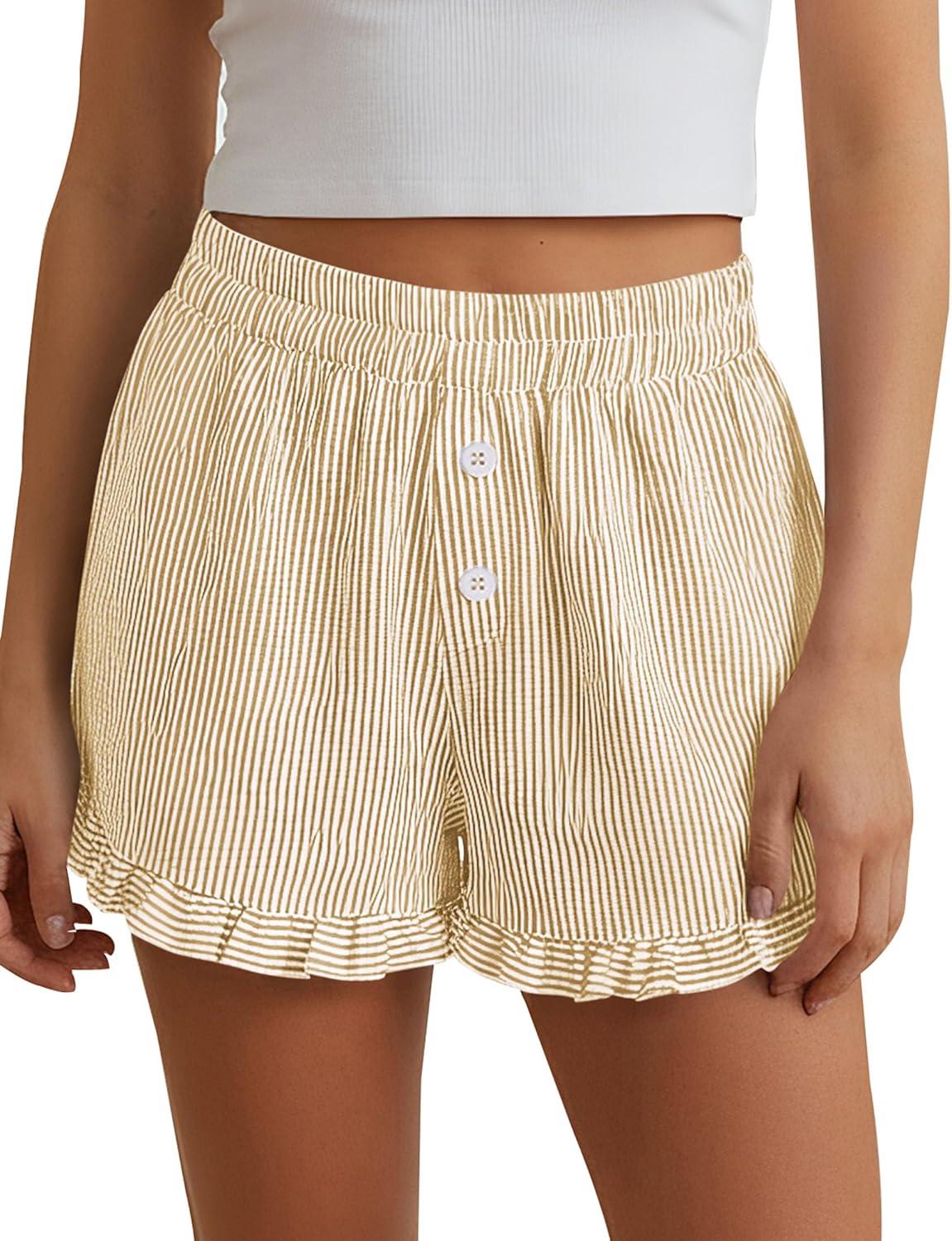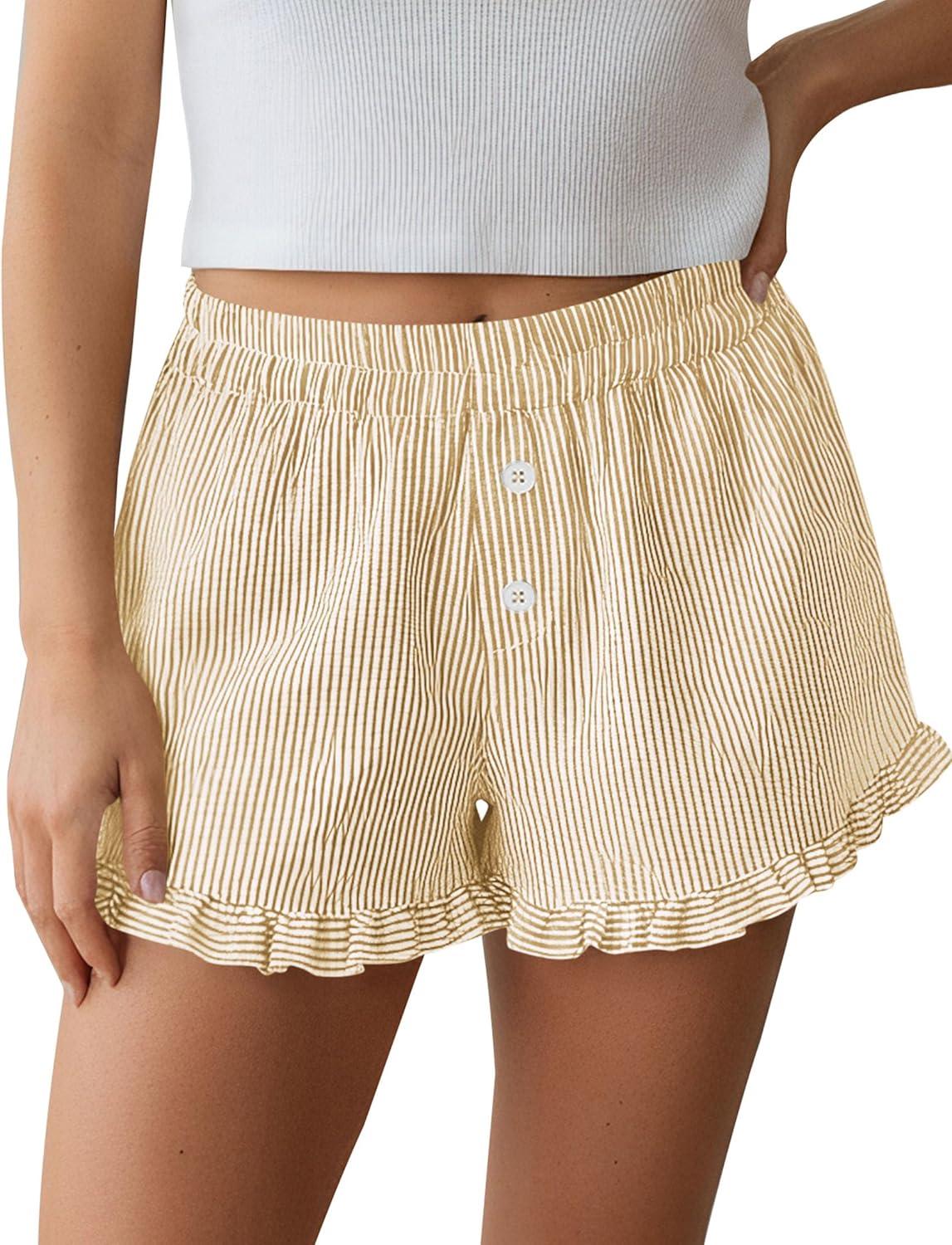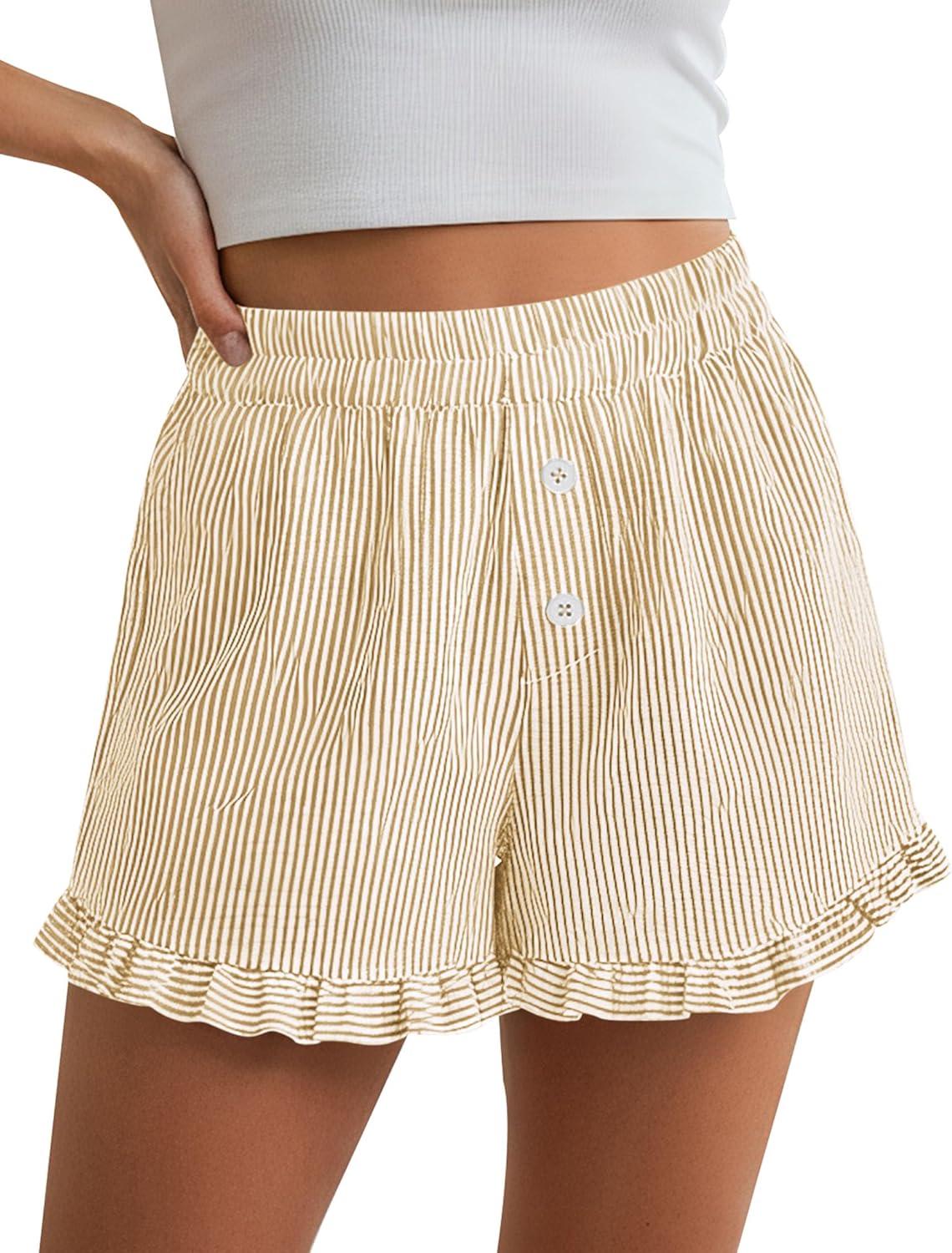 PRETTYGARDEN Womens Boxer Shorts Y2K Ruffle Pajama 2026 Summer Spring Lounge Sleep Striped Casual Beach Pj Bottoms Pockets(Striped Khaki)