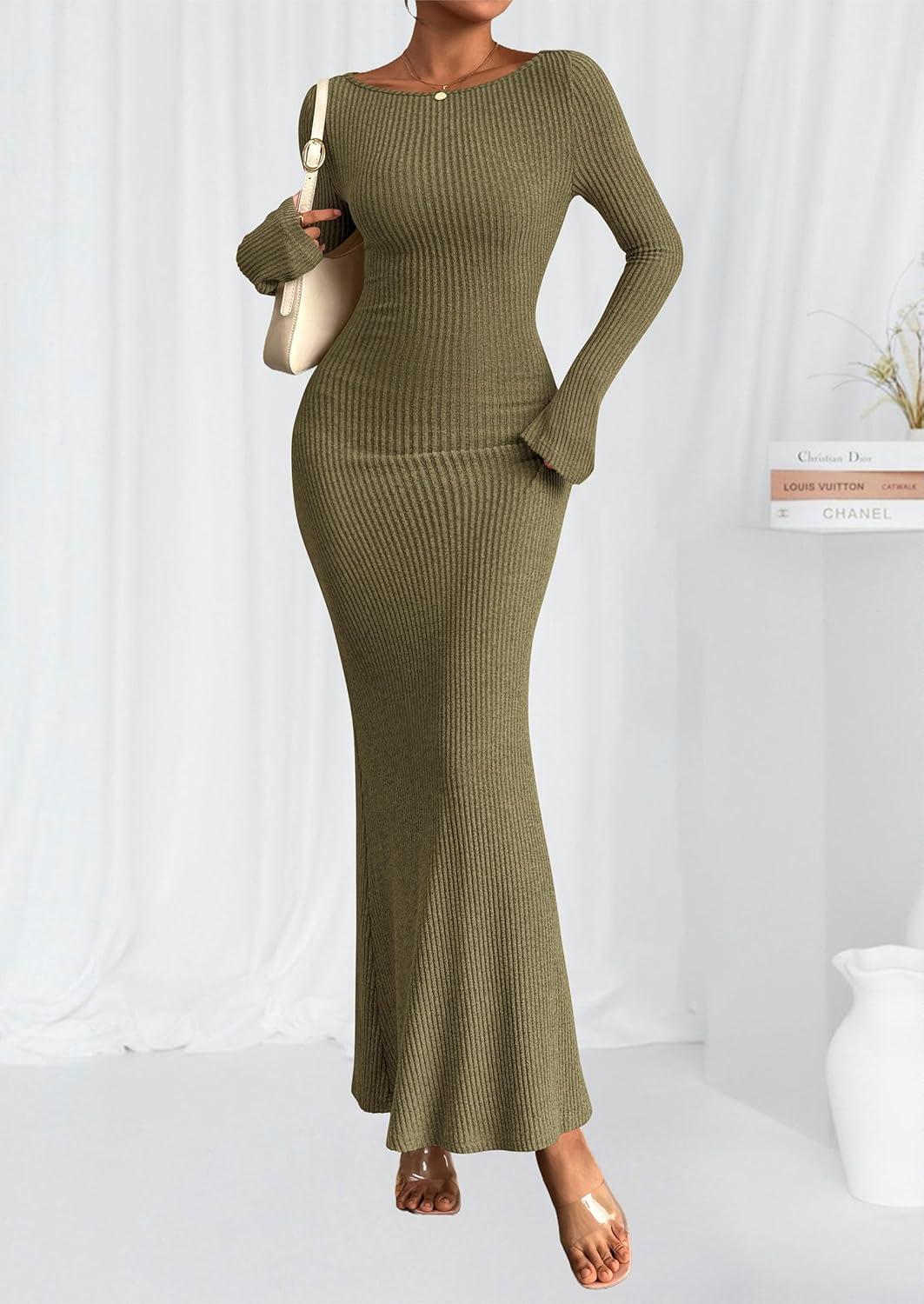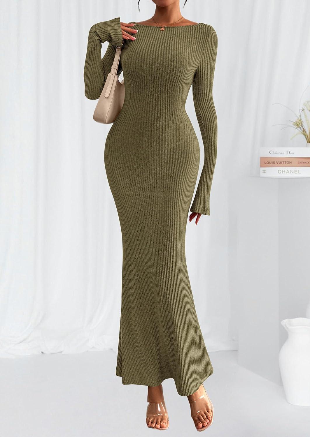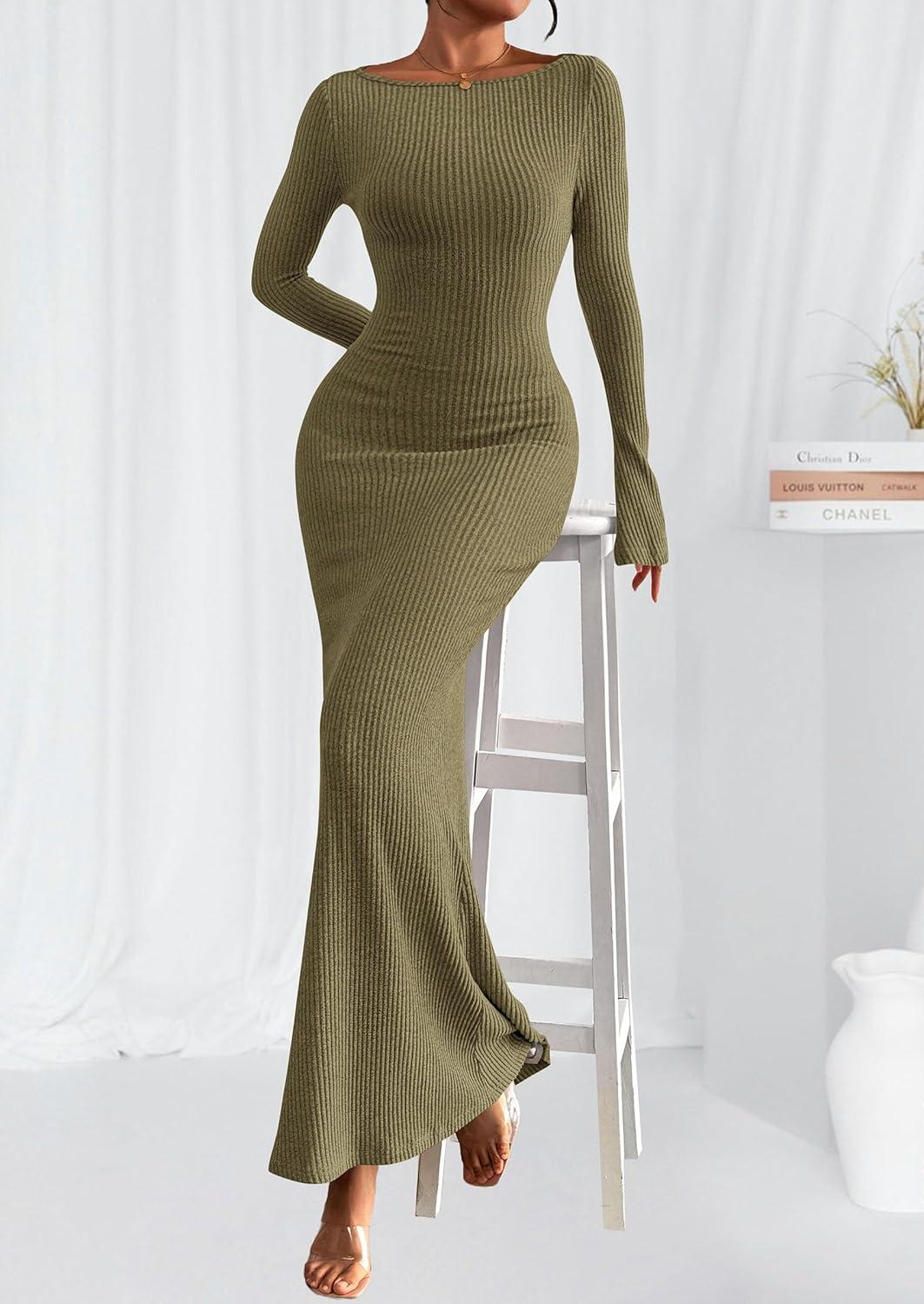 PRETTYGARDEN Women's Fall Fashion 2025 Long Sleeve Maxi Dress Ribbed Knit Boat Neck Bodycon Casual Dresses Going Out Outfits(Army Green)
