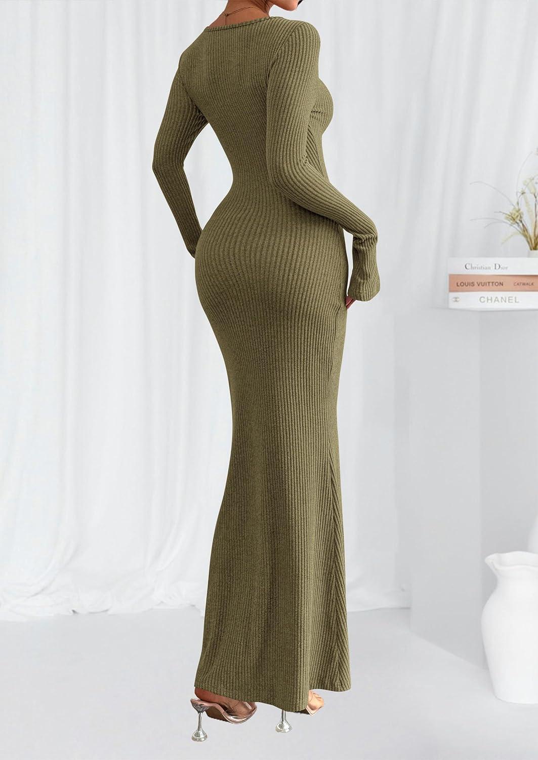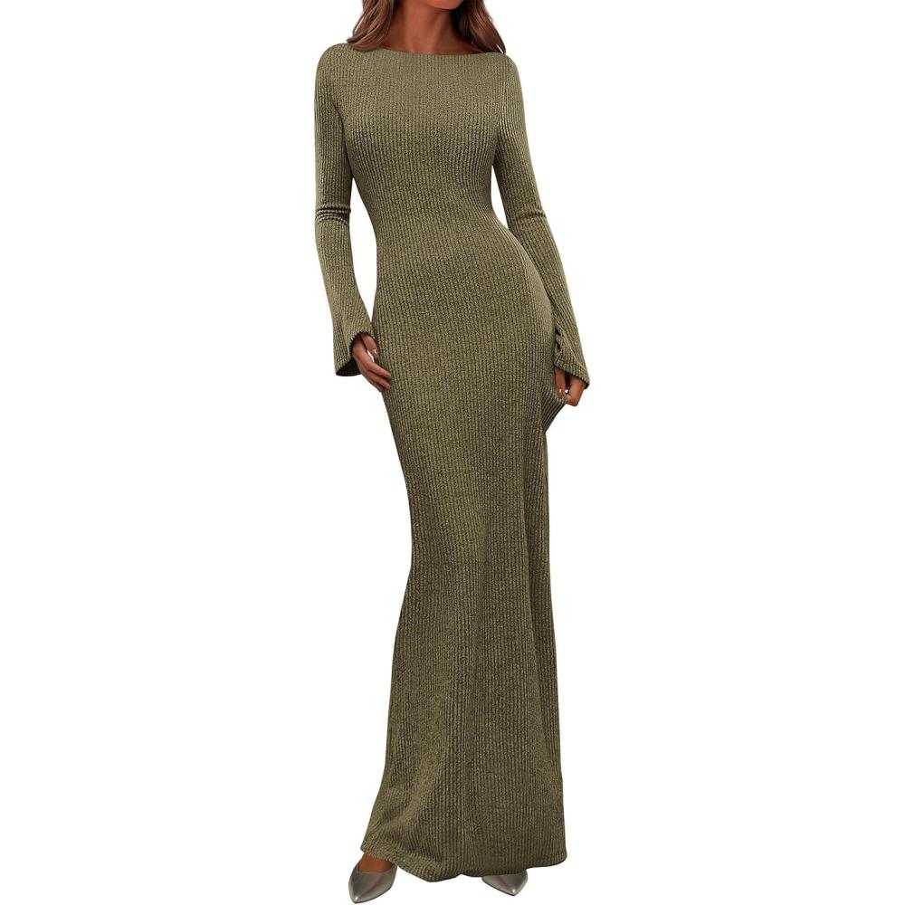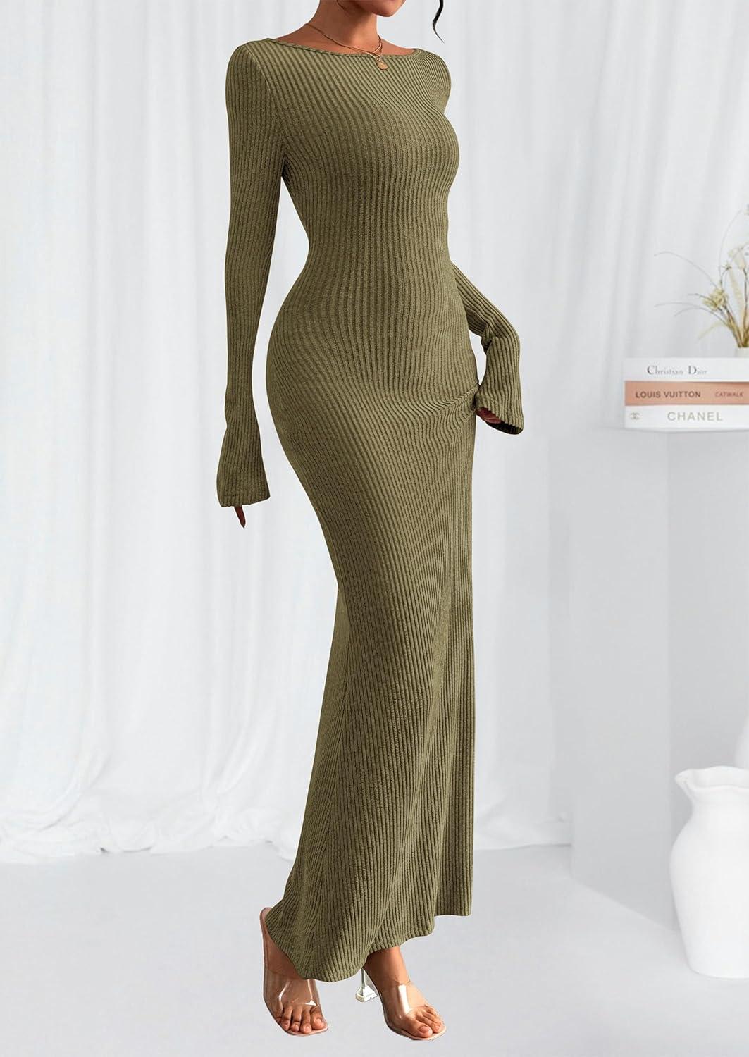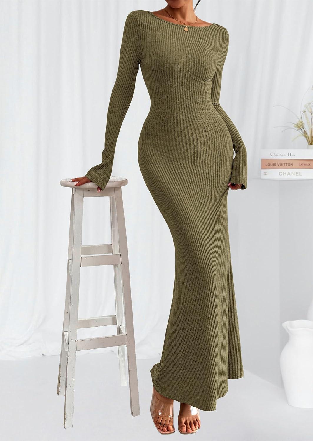 PRETTYGARDEN Women's Fall Fashion 2025 Long Sleeve Maxi Dress Ribbed Knit Boat Neck Bodycon Casual Dresses Going Out Outfits(Army Green)