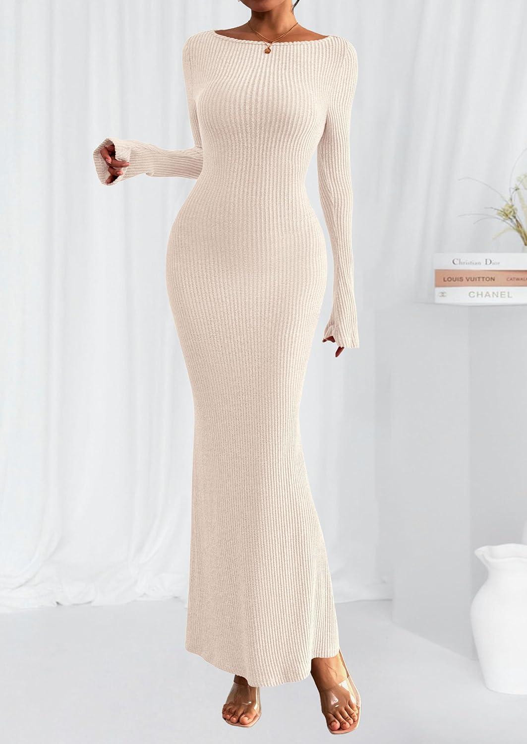 PRETTYGARDEN Women's Fall Fashion 2025 Long Sleeve Maxi Dress Ribbed Knit Boat Neck Bodycon Casual Dresses Going Out Outfits(Beige)