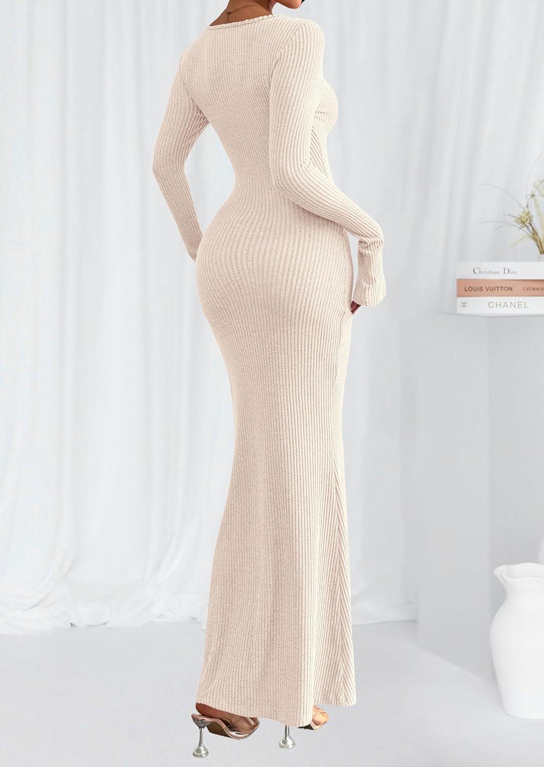 PRETTYGARDEN Women’s Fall Fashion 2025 Long Sleeve Maxi Dress Ribbed Knit Boat Neck Bodycon Casual Dresses Going Out Outfits(Beige)