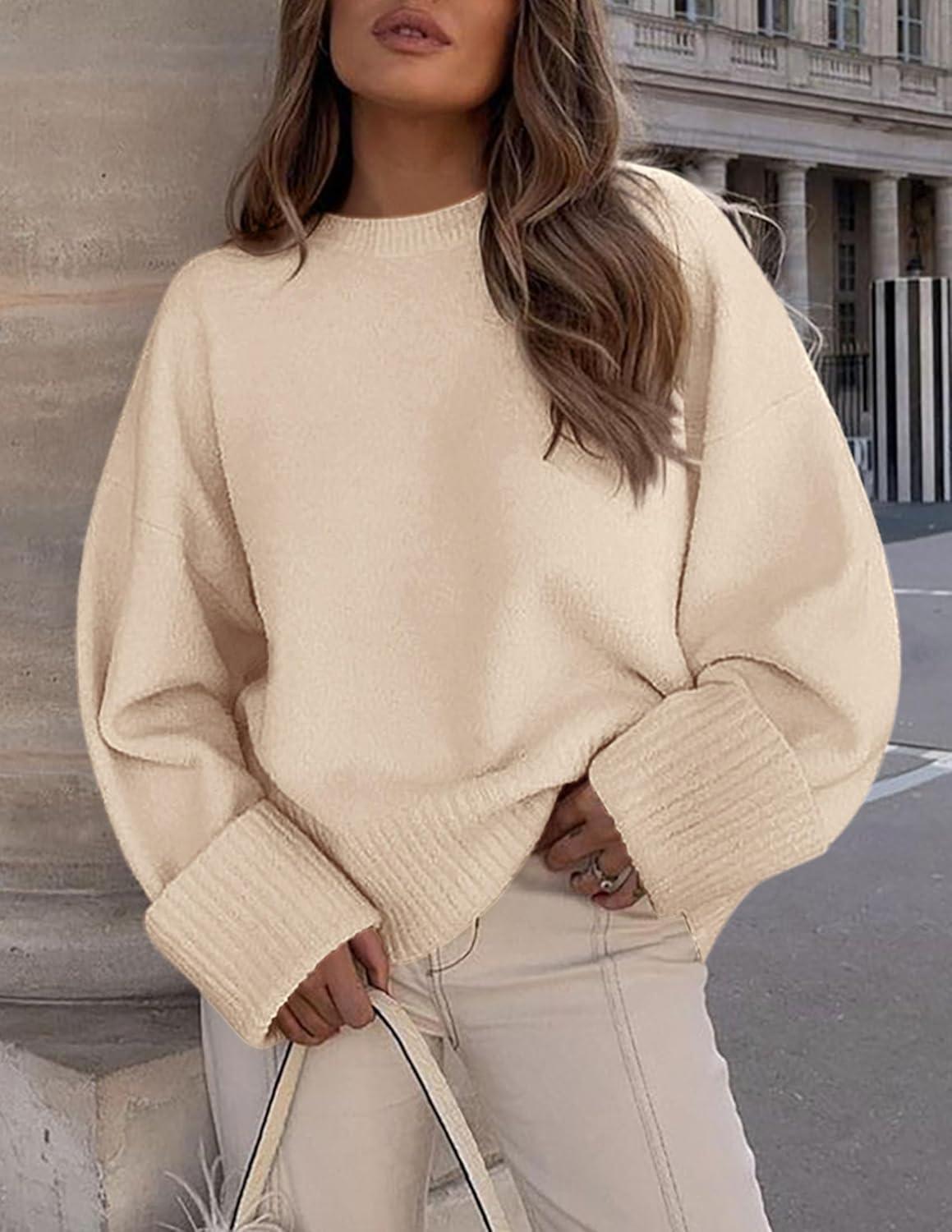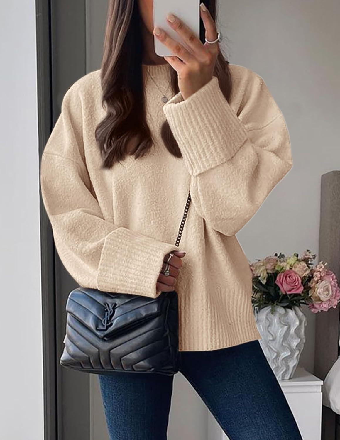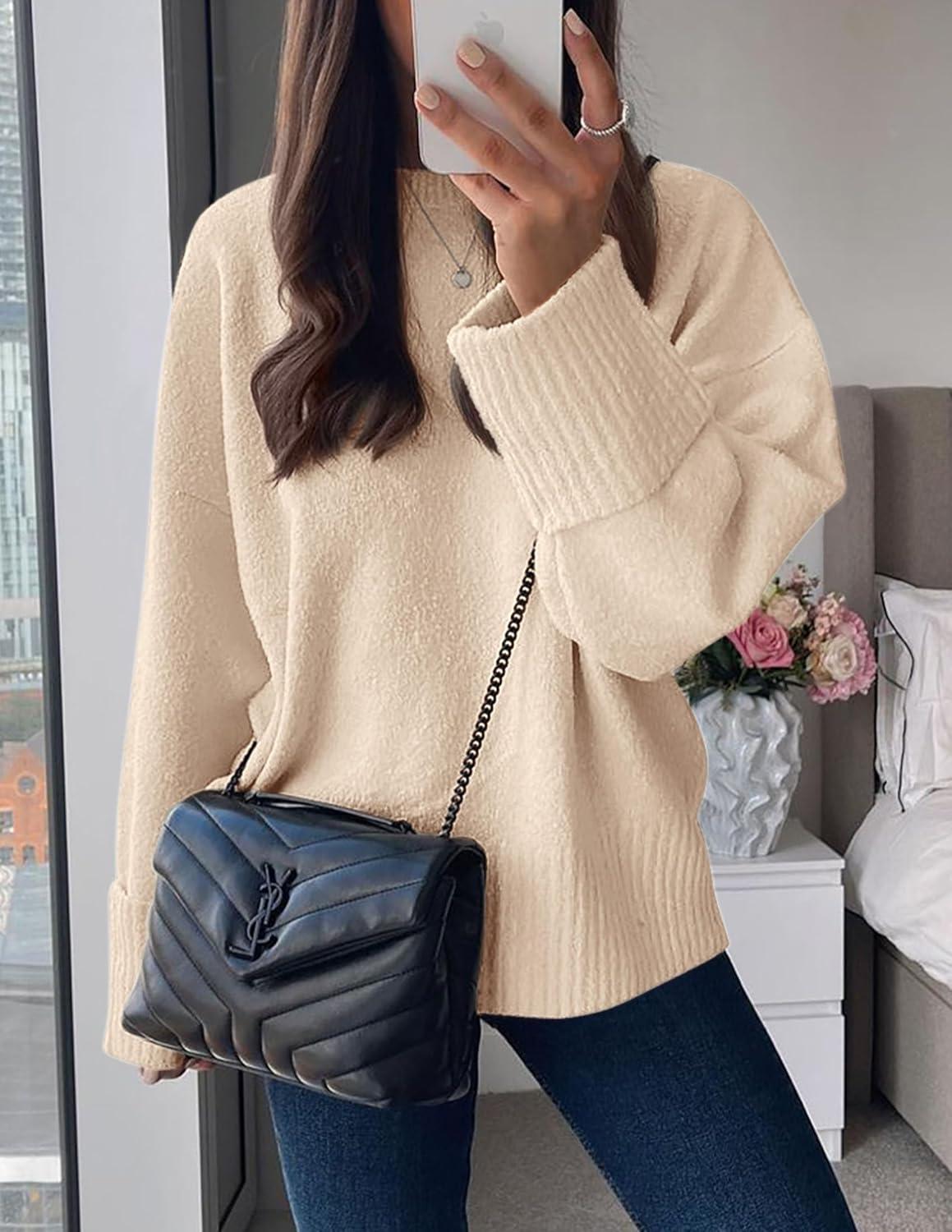 PRETTYGARDEN Women's Fall Oversized Sweaters Casual Crewneck Pullover Long Sleeve Fuzzy Chunky Knit Tops Blouse(Beige)