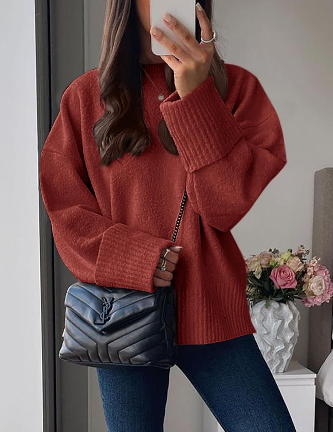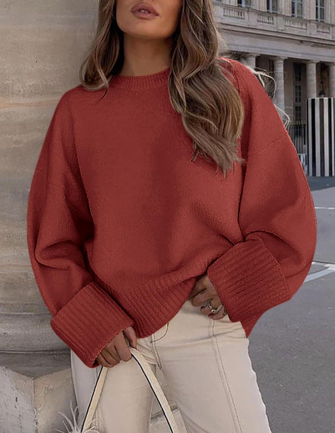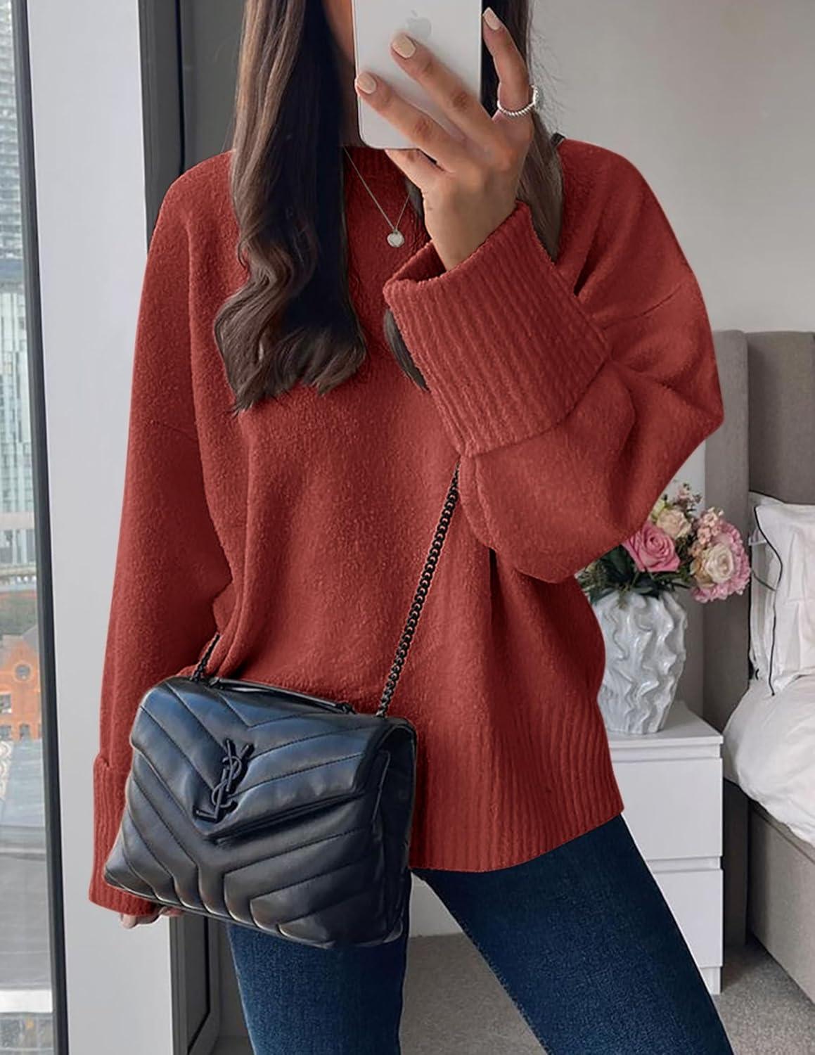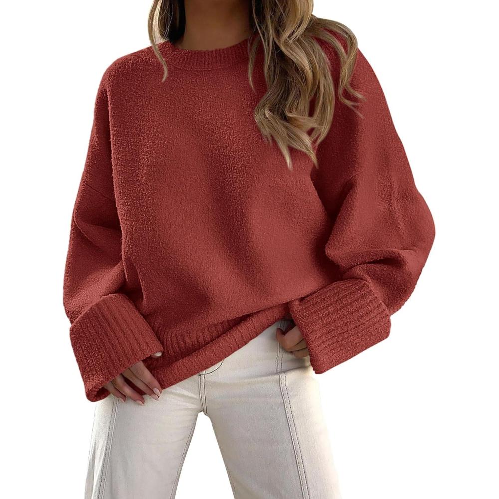 PRETTYGARDEN Women's Fall Oversized Sweaters Casual Crewneck Pullover Long Sleeve Fuzzy Chunky Knit Tops Blouse(Rust Red)