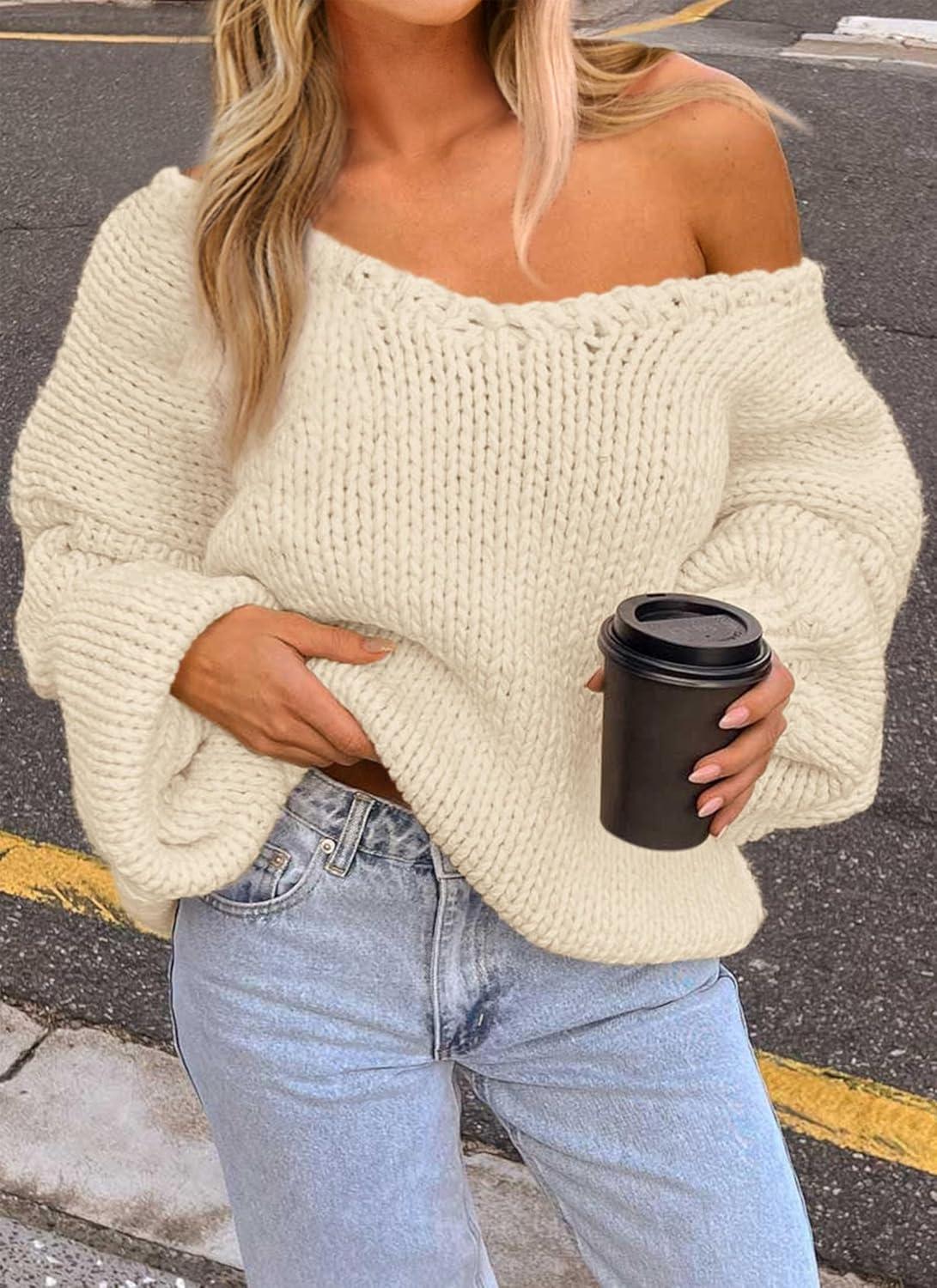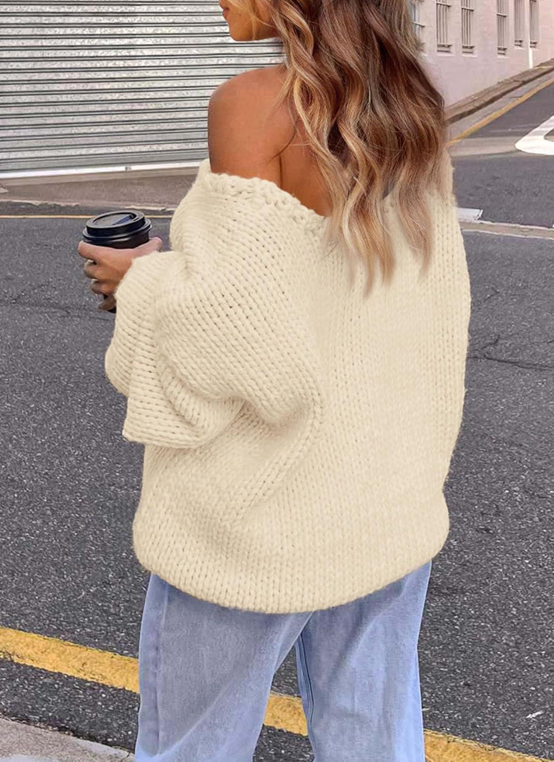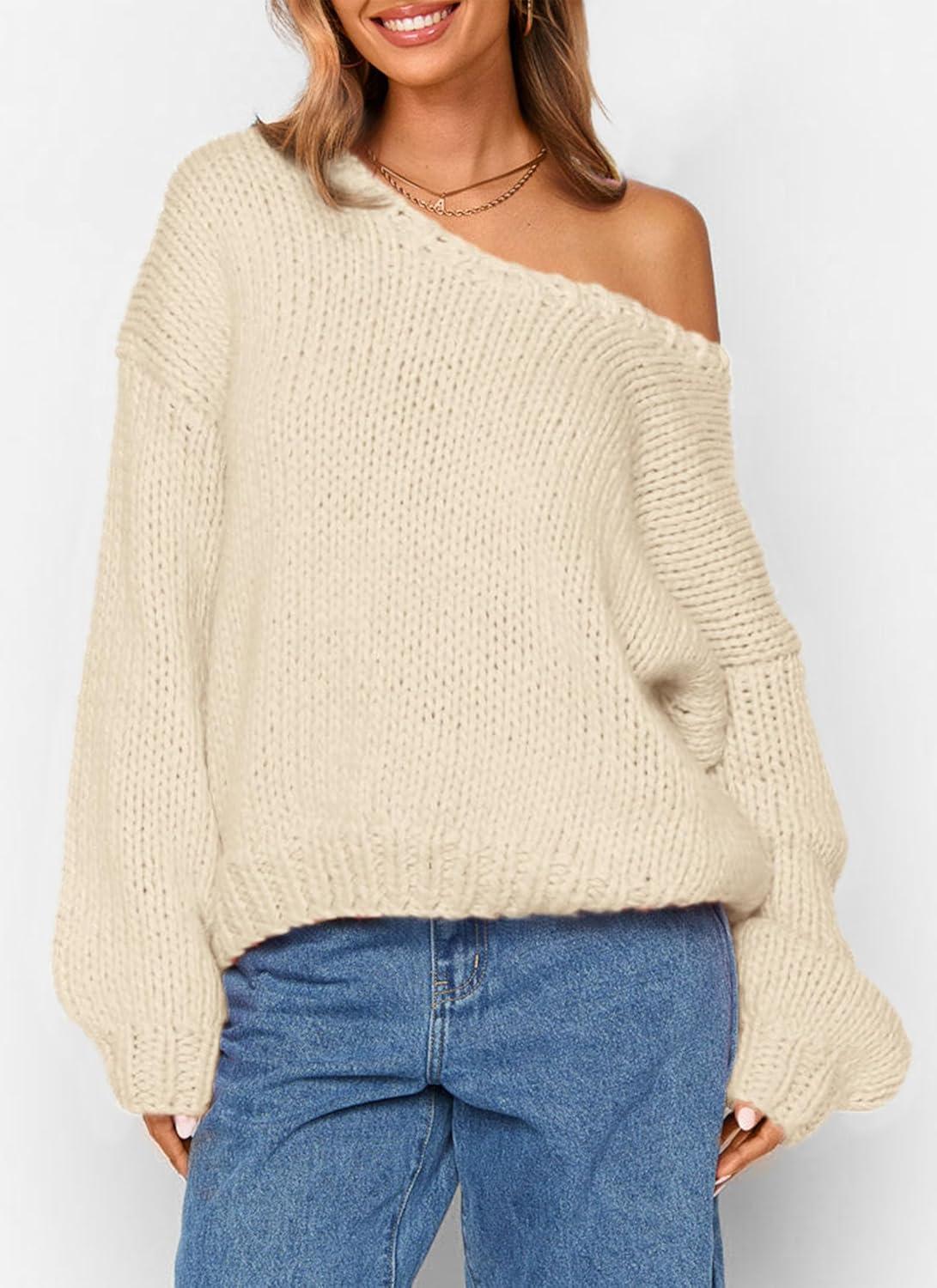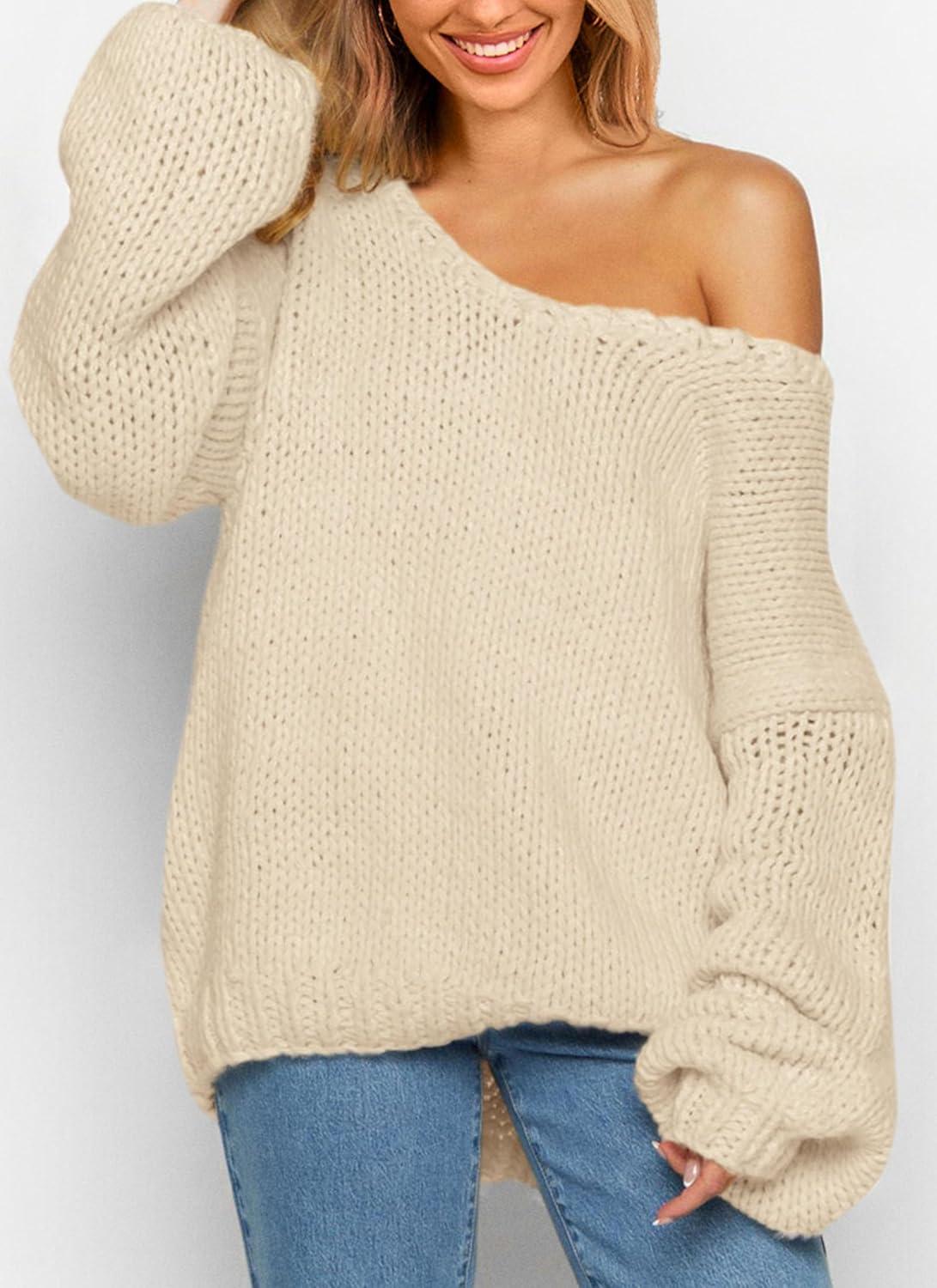 PRETTYGARDEN Women's Fall Oversized Sweaters Long Sleeve V Neck Dressy Casual Chunky Knit Loose Pullover Tops Winter Clothing(Beige)