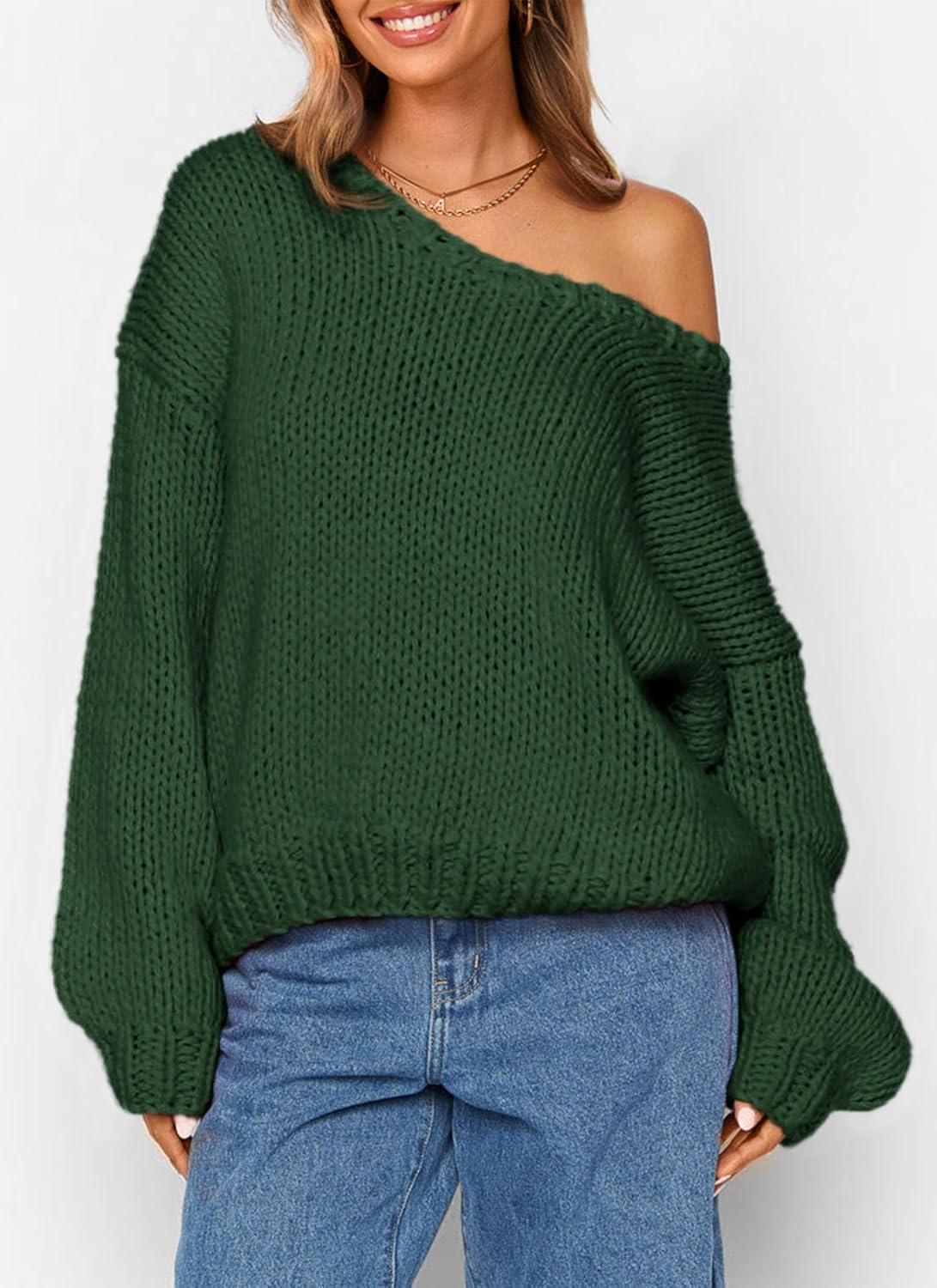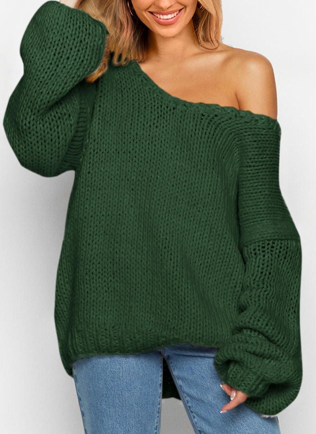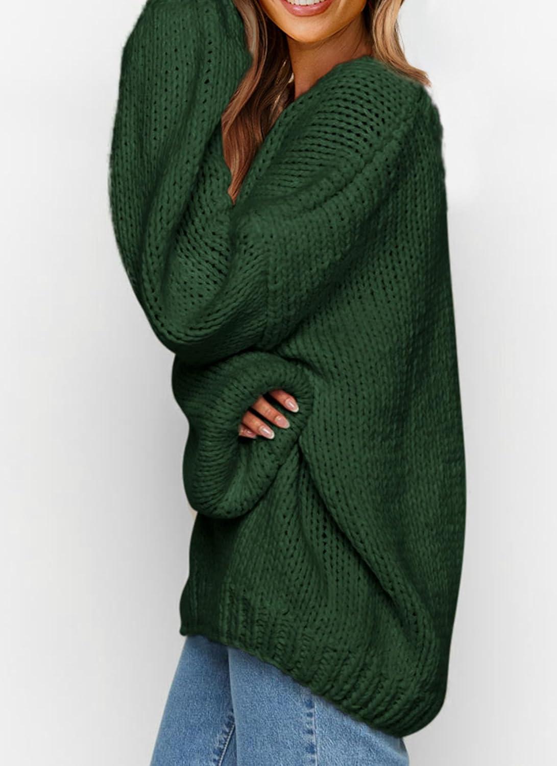 PRETTYGARDEN Women's Fall Oversized Sweaters Long Sleeve V Neck Dressy Casual Chunky Knit Loose Pullover Tops Winter Clothing(Dark Green)