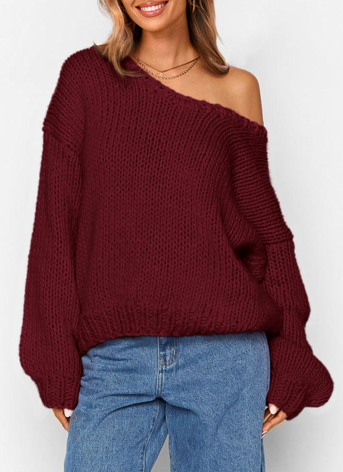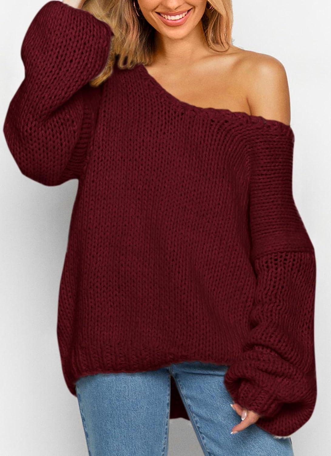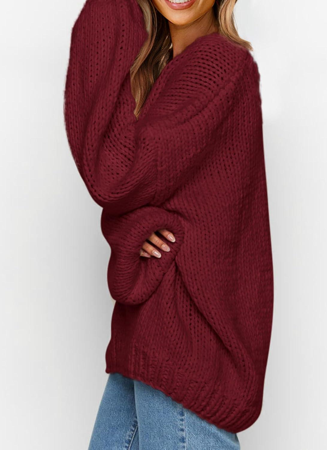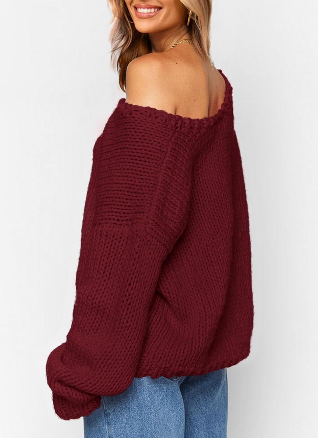 PRETTYGARDEN Women's Fall Oversized Sweaters Long Sleeve V Neck Dressy Casual Chunky Knit Loose Pullover Tops Winter Clothing(Wine Red)