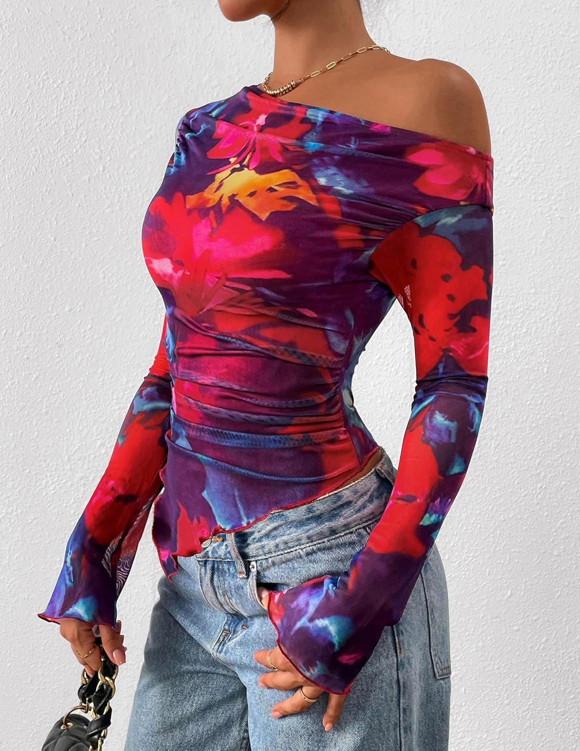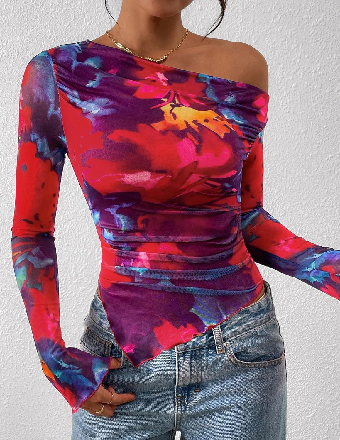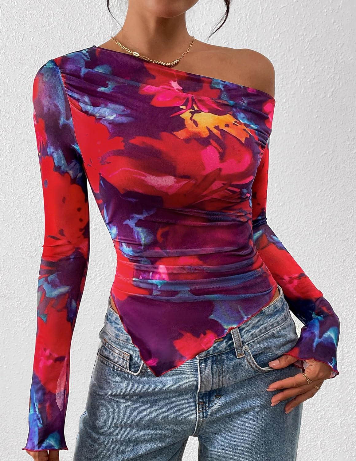 PRETTYGARDEN Womens Fall Trendy Off Shoulder Y2k Tops 2025 Tie Dye Mesh Long Sleeve Shirts Asymmetrical Ruched Floral Blouse(Floral Navy Red)