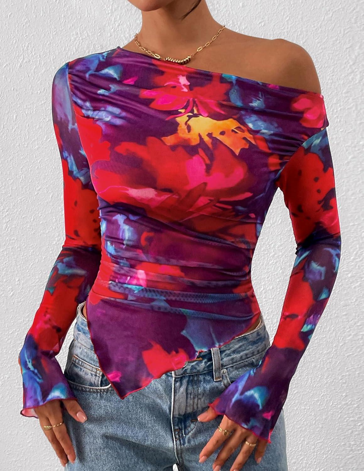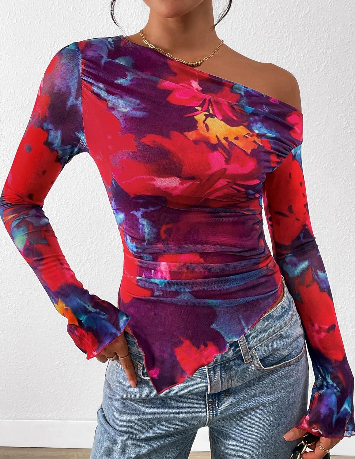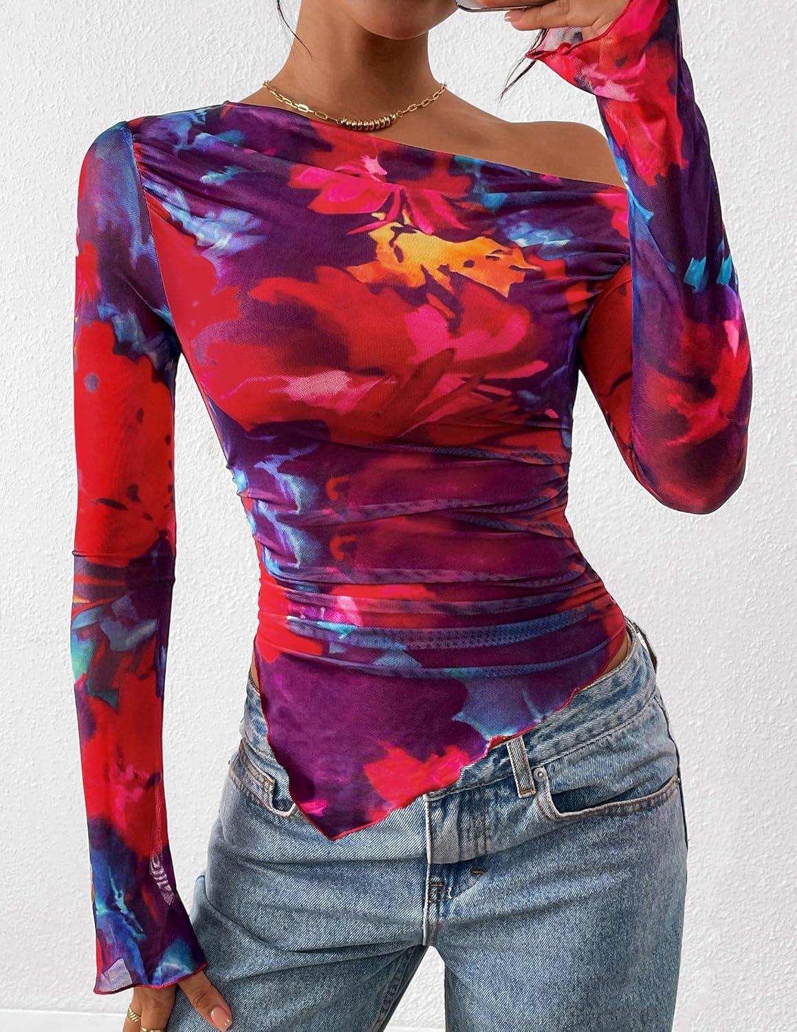 PRETTYGARDEN Womens Fall Trendy Off Shoulder Y2k Tops 2025 Tie Dye Mesh Long Sleeve Shirts Asymmetrical Ruched Floral Blouse(Floral Navy Red)
