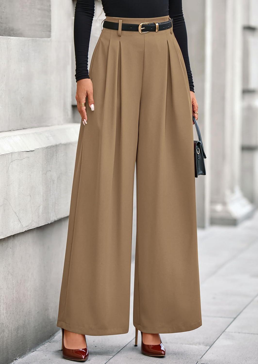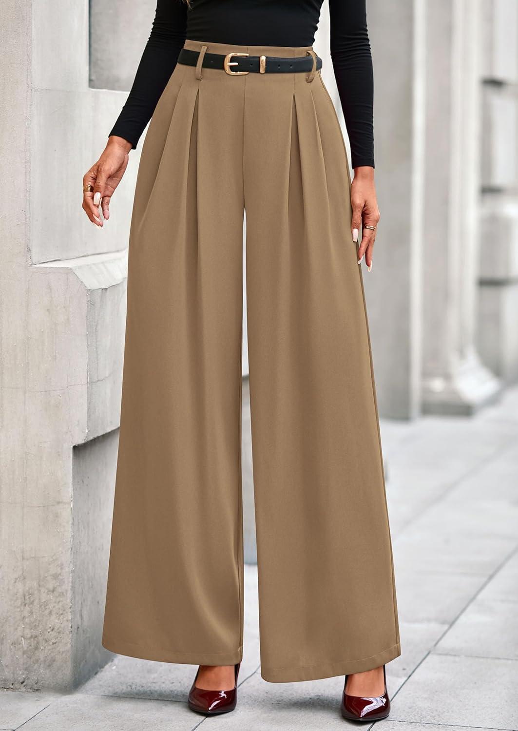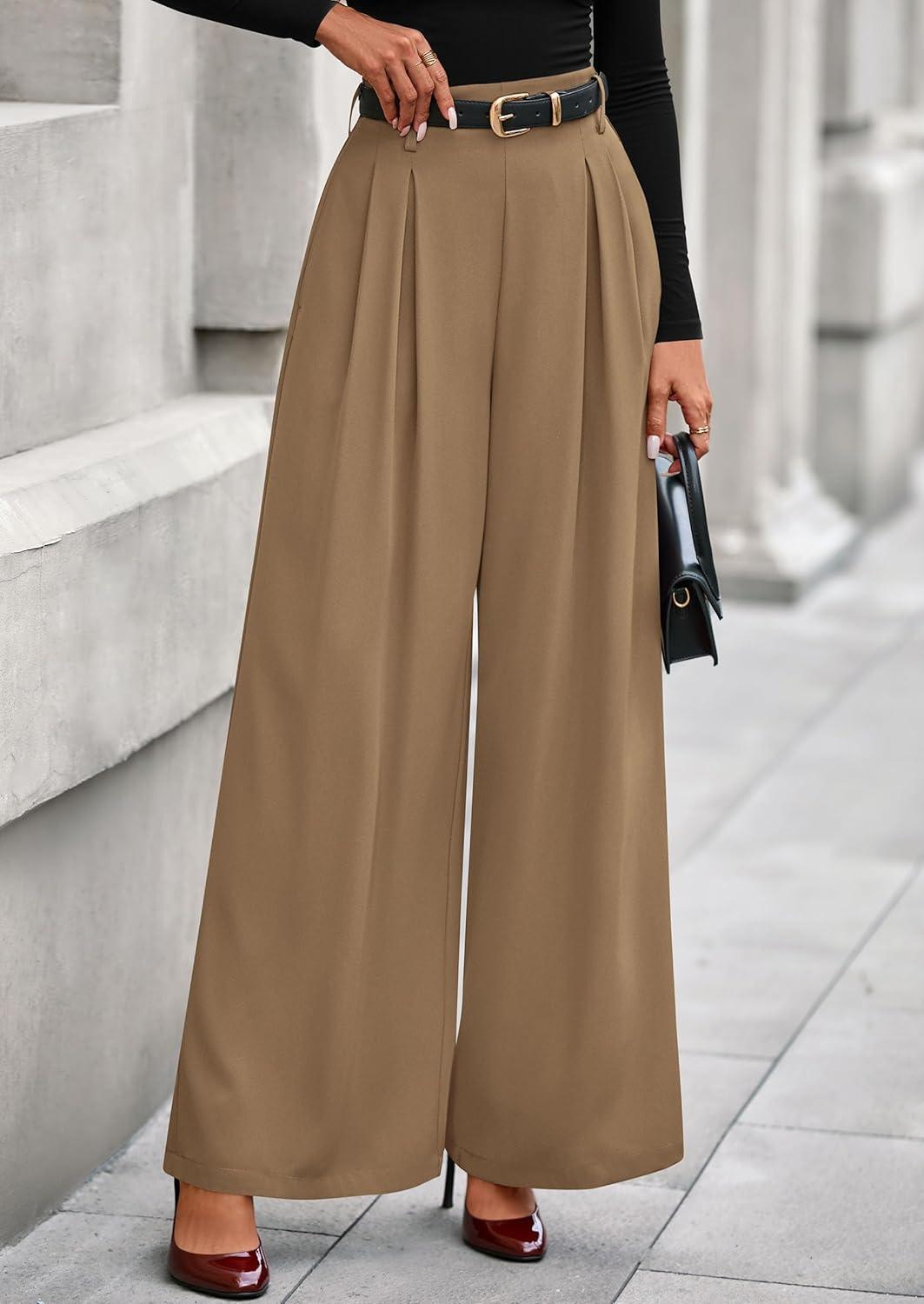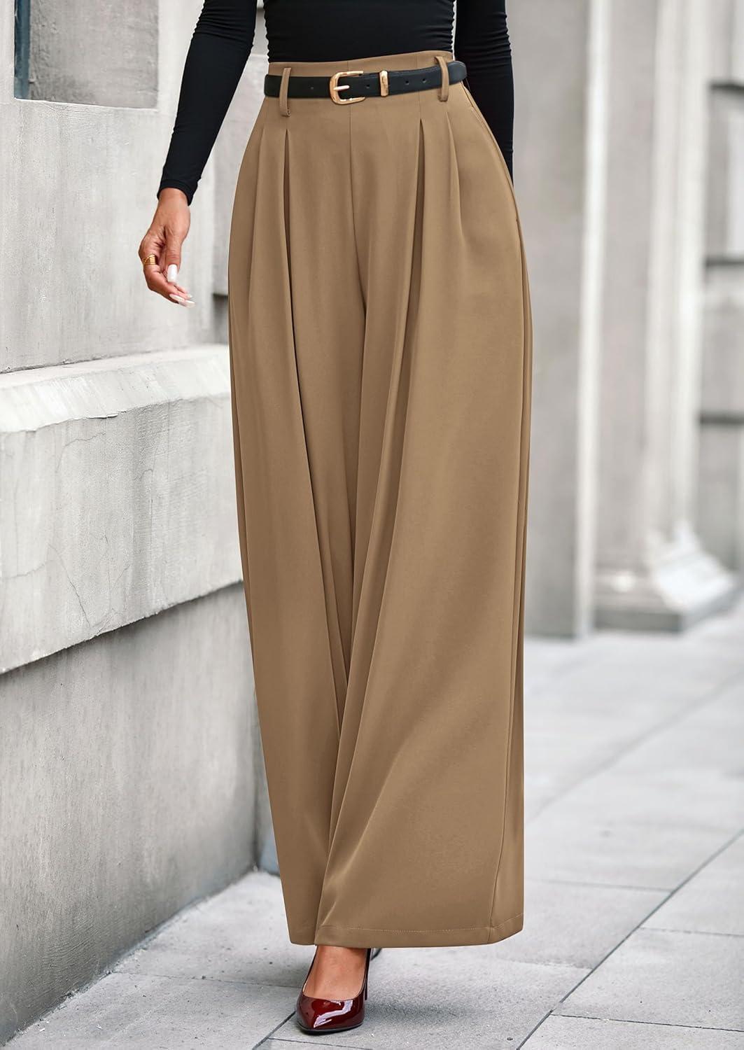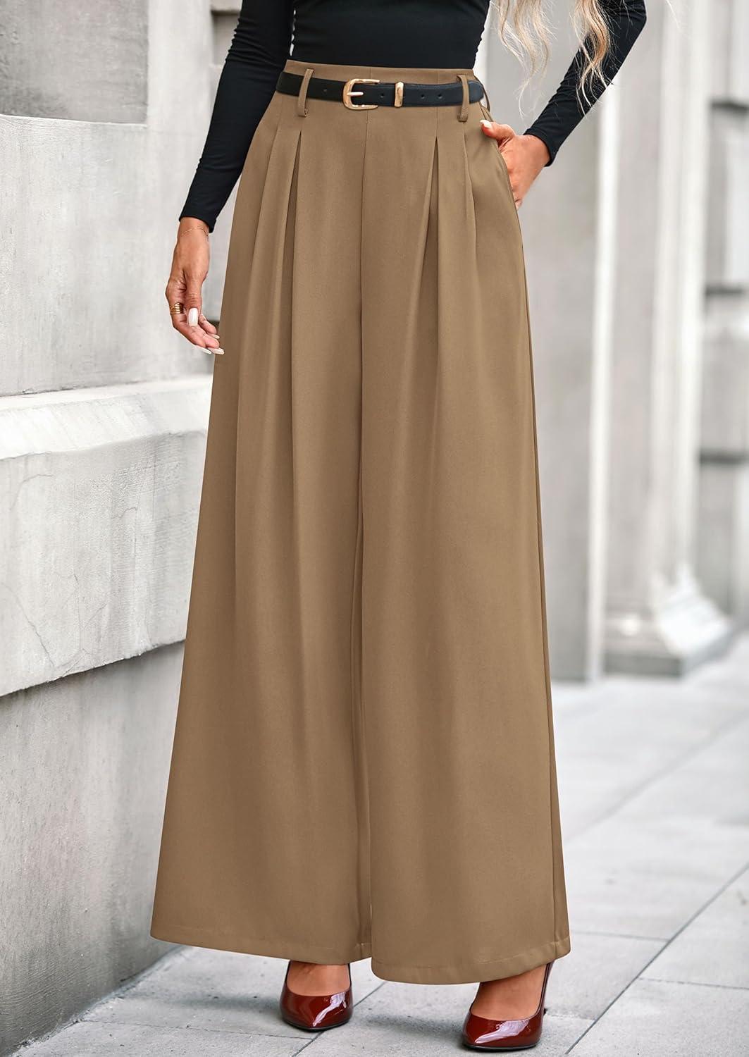 PRETTYGARDEN Womens Fall Wide Leg Trousers 2025 High Elastic Waist Loose Pleated Long Flowy Palazzo Work Pants with Pockets(Light Brown)