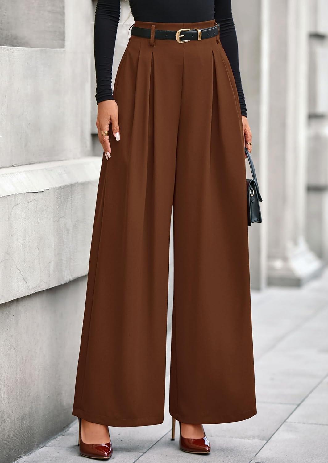 PRETTYGARDEN Womens Fall Wide Leg Trousers 2025 High Elastic Waist Loose Pleated Long Flowy Palazzo Work Pants with Pockets(Red Brown)