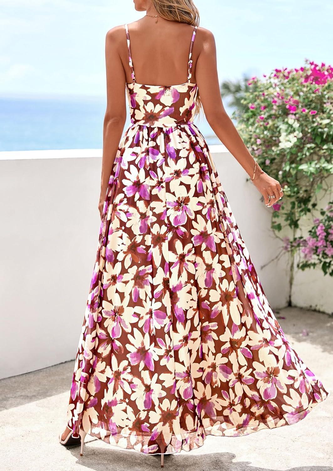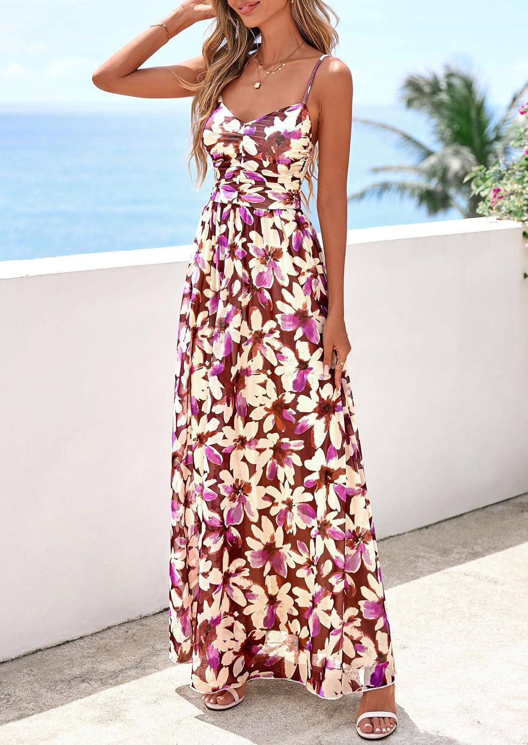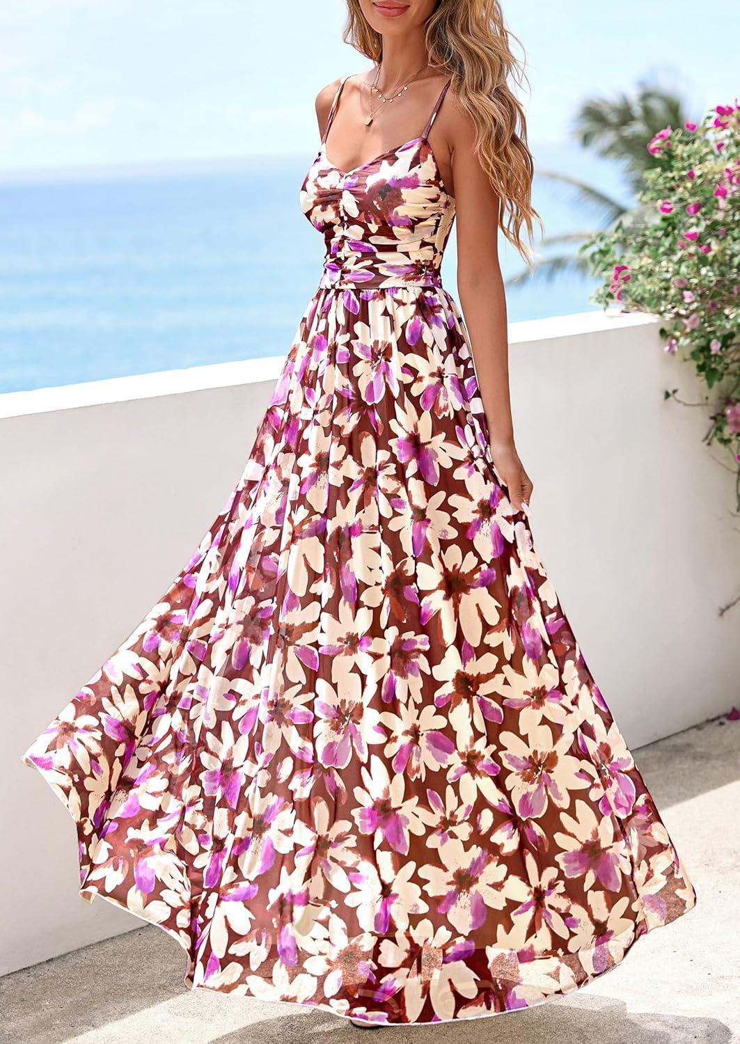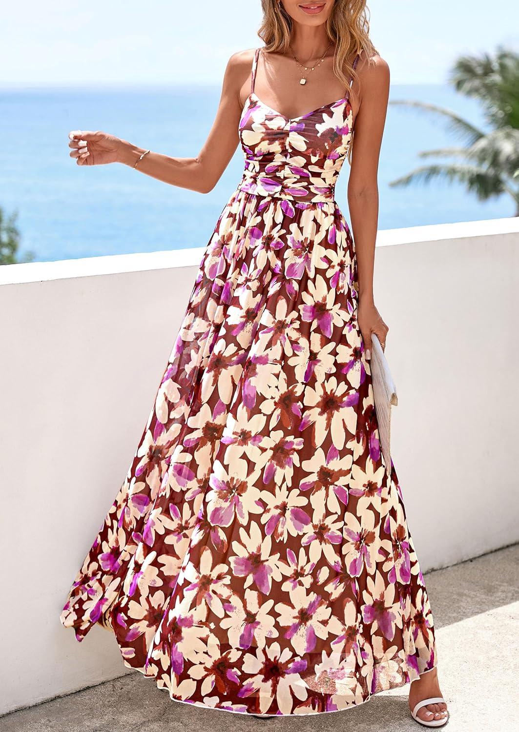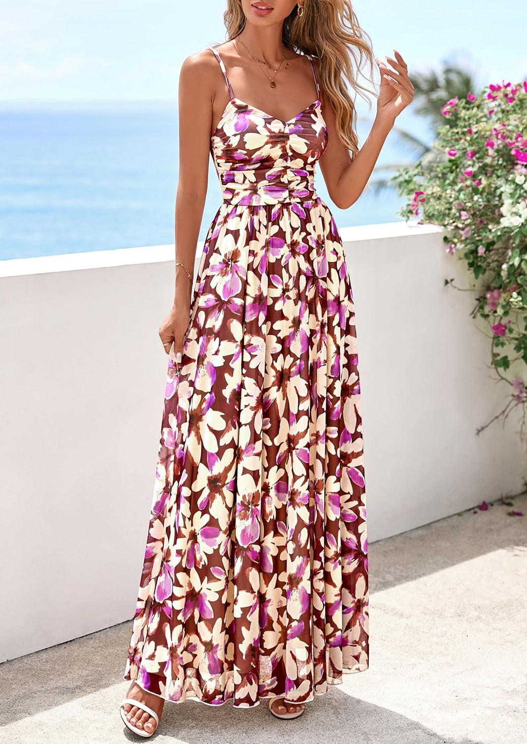 PRETTYGARDEN Women’s Floral Maxi Dress Summer Outfits 2026 Spaghetti Strap Flowy Long Sundress Beach Vacation Boho Dresses(Floral Purple)