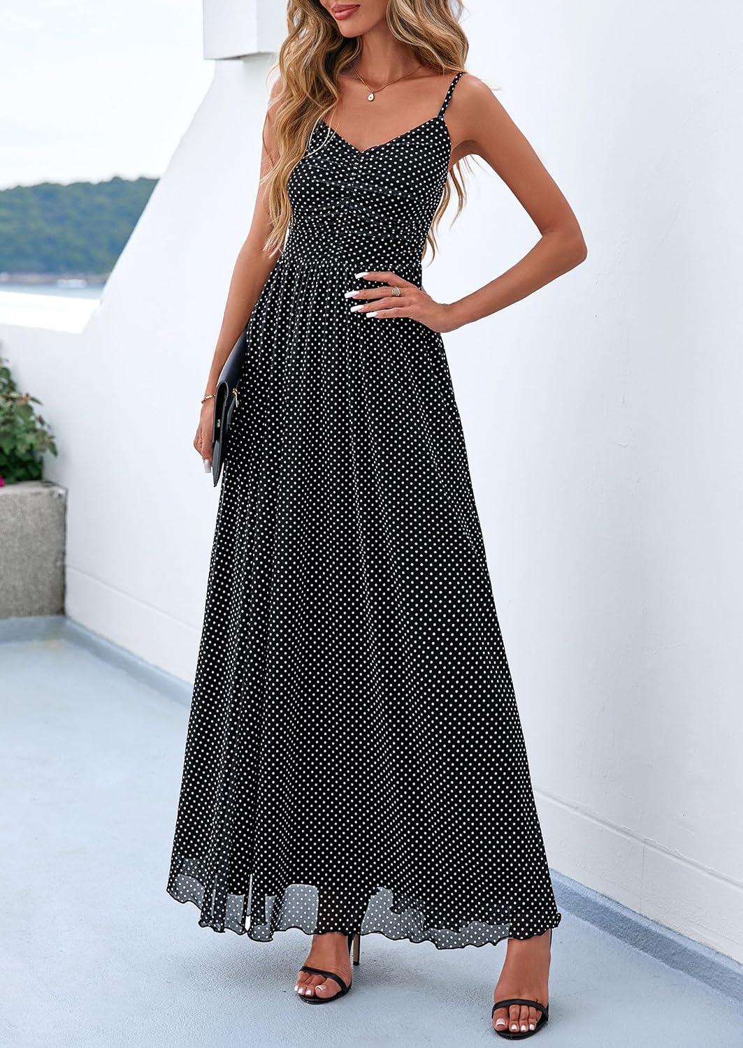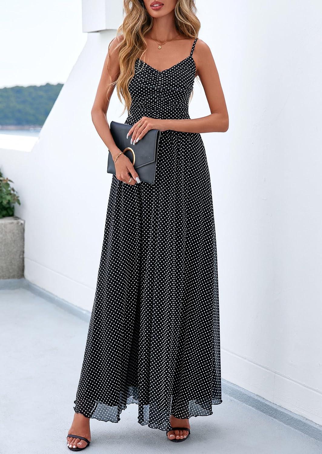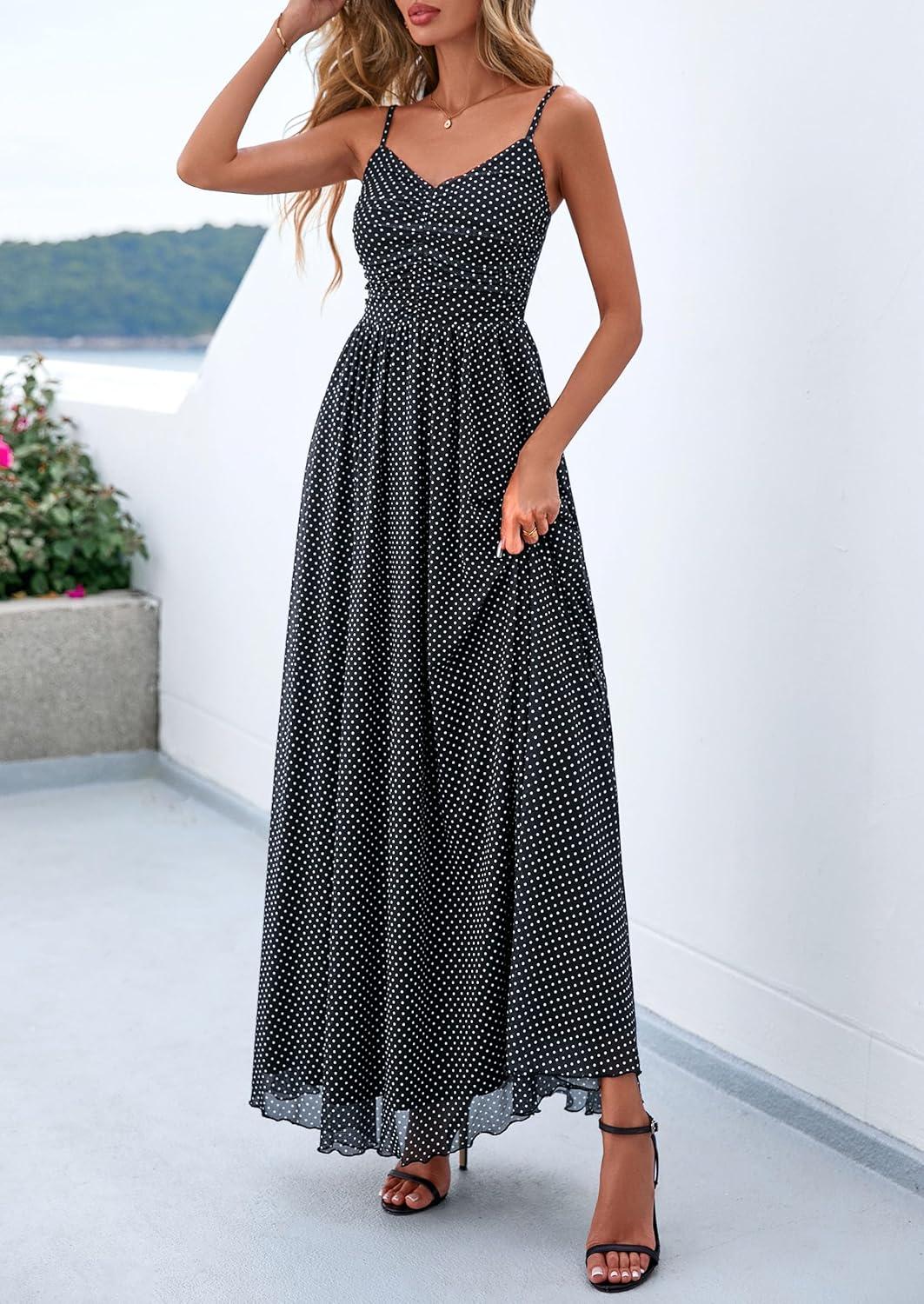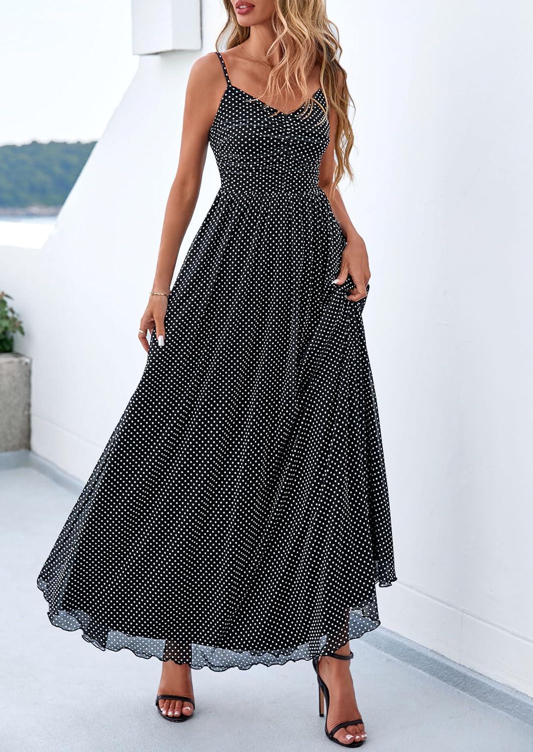 PRETTYGARDEN Women's Floral Maxi Dress Summer Outfits 2026 Spaghetti Strap Flowy Long Sundress Beach Vacation Boho Dresses(Polka Dot Black White)
