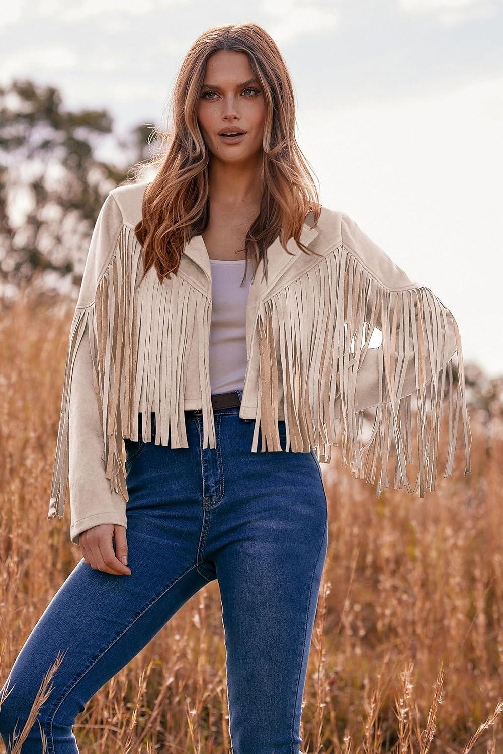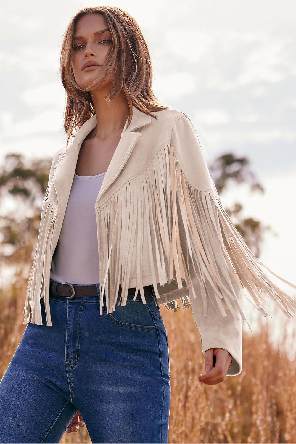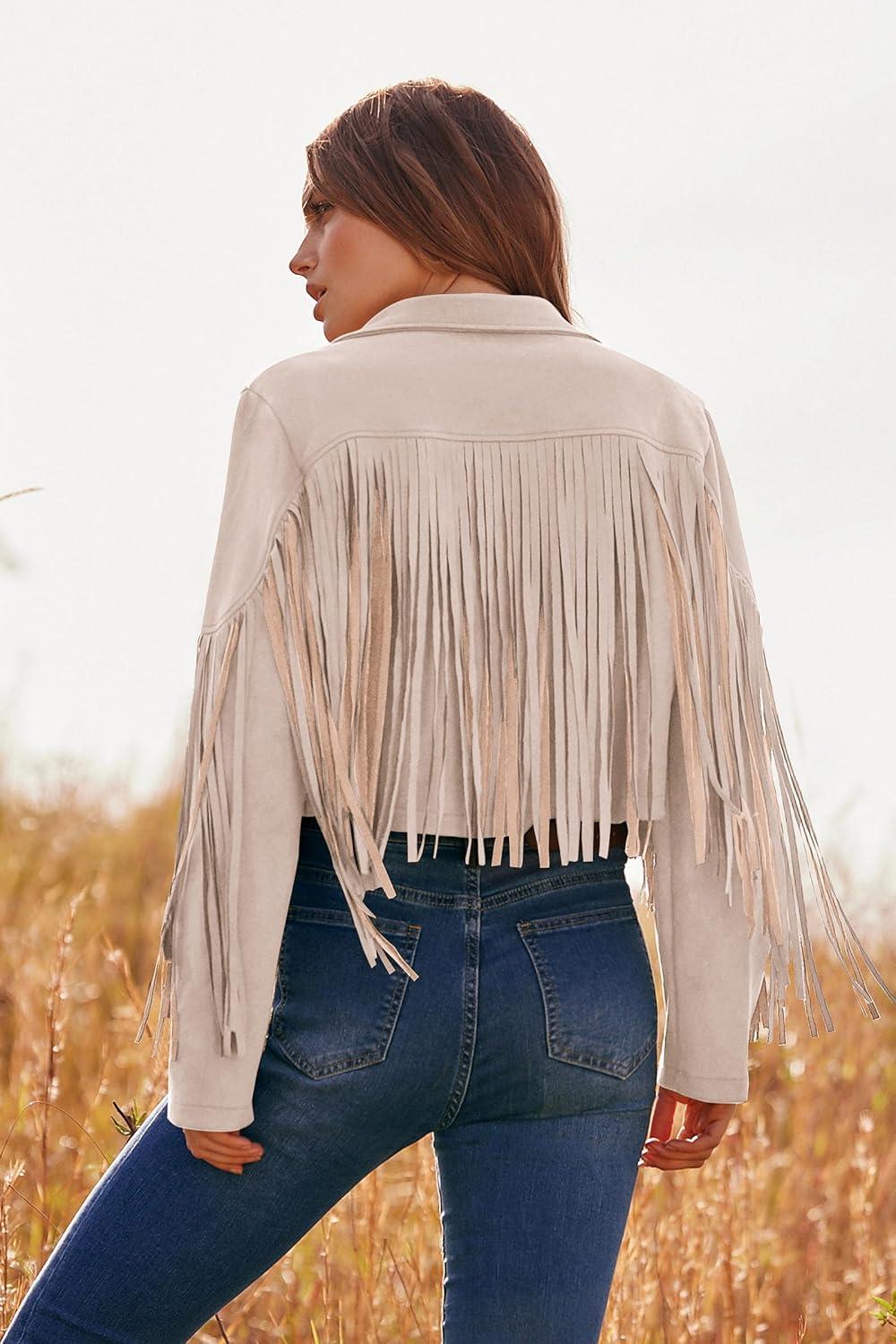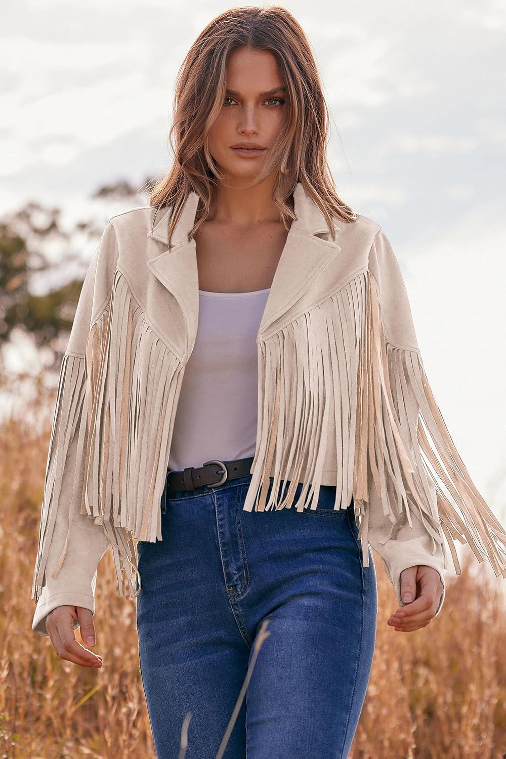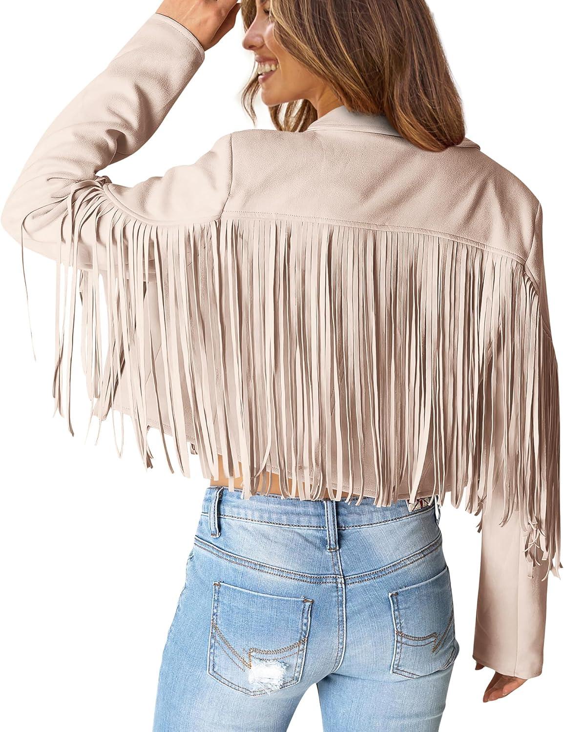 PRETTYGARDEN Women’s Fringe Faux Suede Leather Jackets Fall Fashion 2025 Tassel Motorcycle Cropped Coats(Beige White)