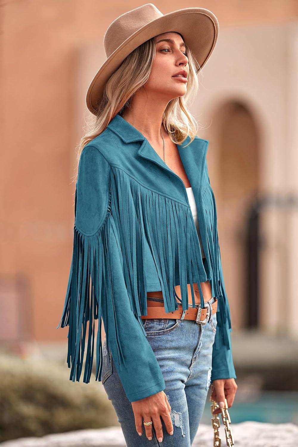 PRETTYGARDEN Women's Fringe Faux Suede Leather Jackets Fall Fashion 2025 Tassel Motorcycle Cropped Coats(Lake Blue)