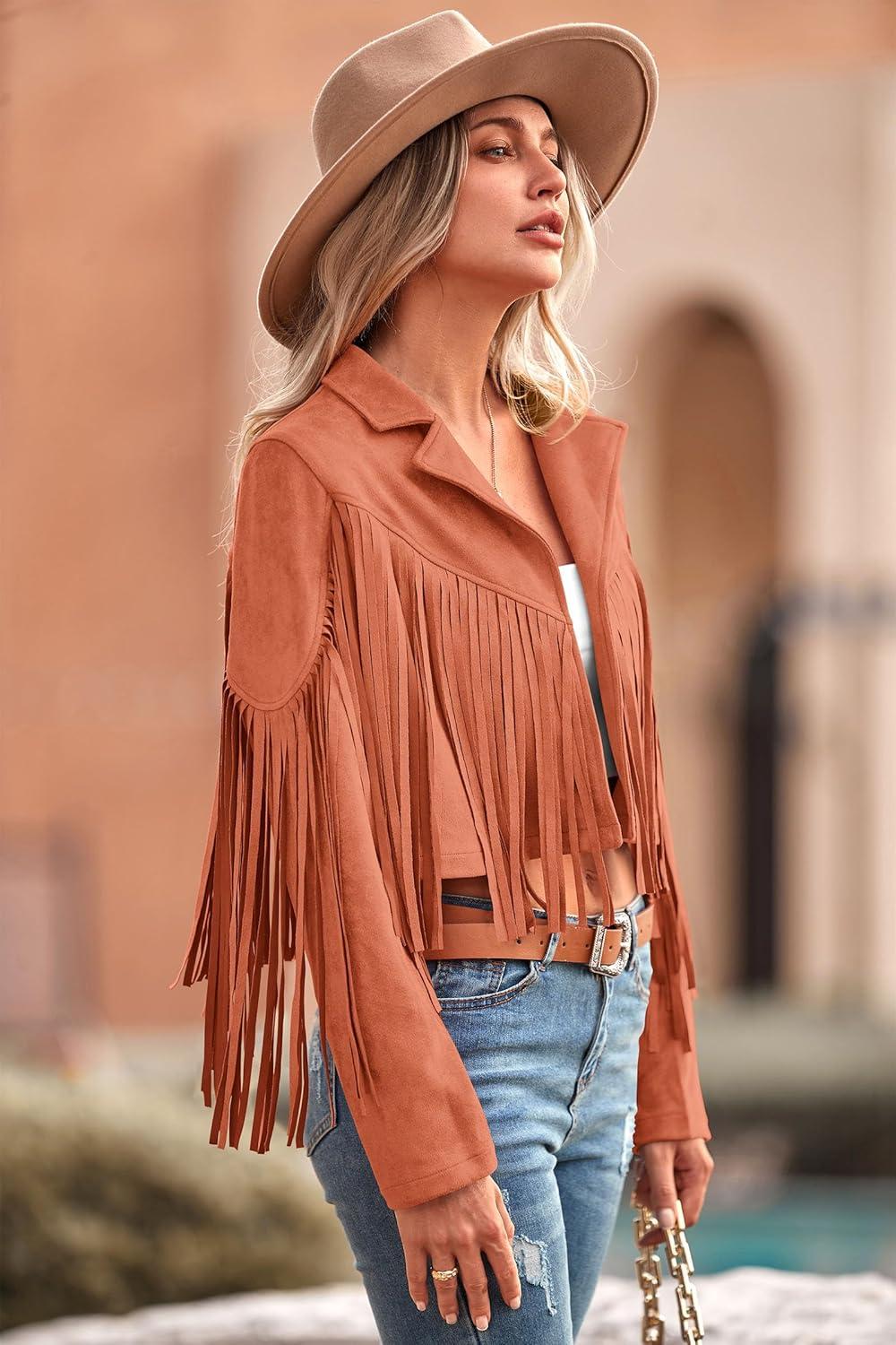 PRETTYGARDEN Women's Fringe Faux Suede Leather Jackets Fall Fashion 2025 Tassel Motorcycle Cropped Coats(Orange)