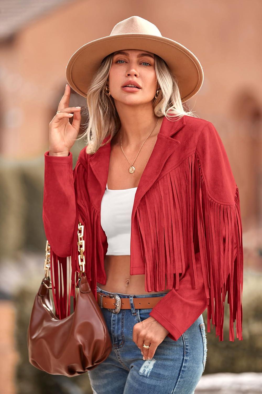 PRETTYGARDEN Women's Fringe Faux Suede Leather Jackets Fall Fashion 2025 Tassel Motorcycle Cropped Coats(Red)