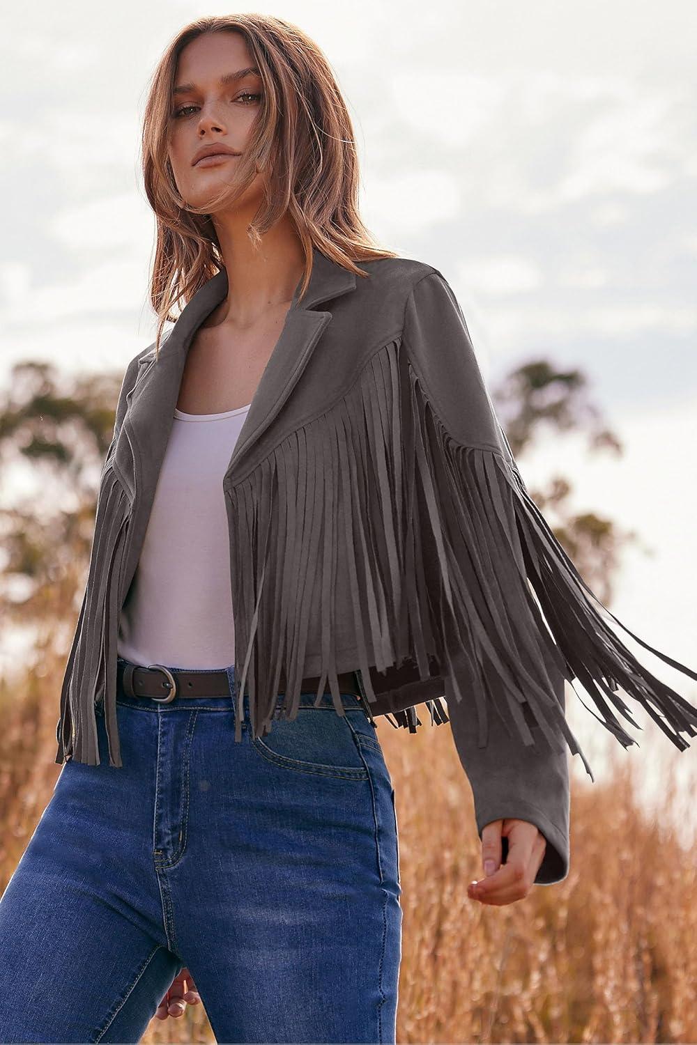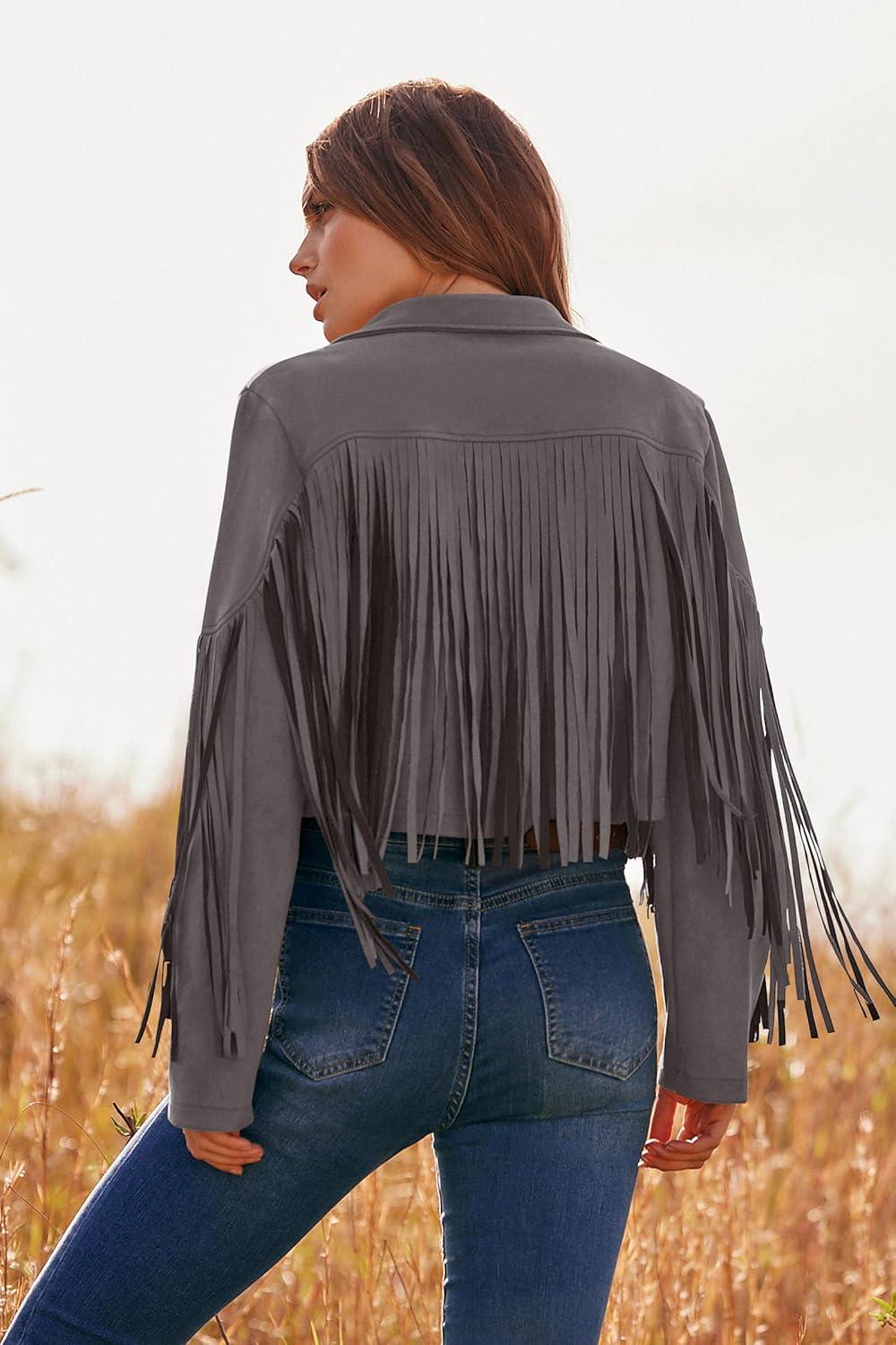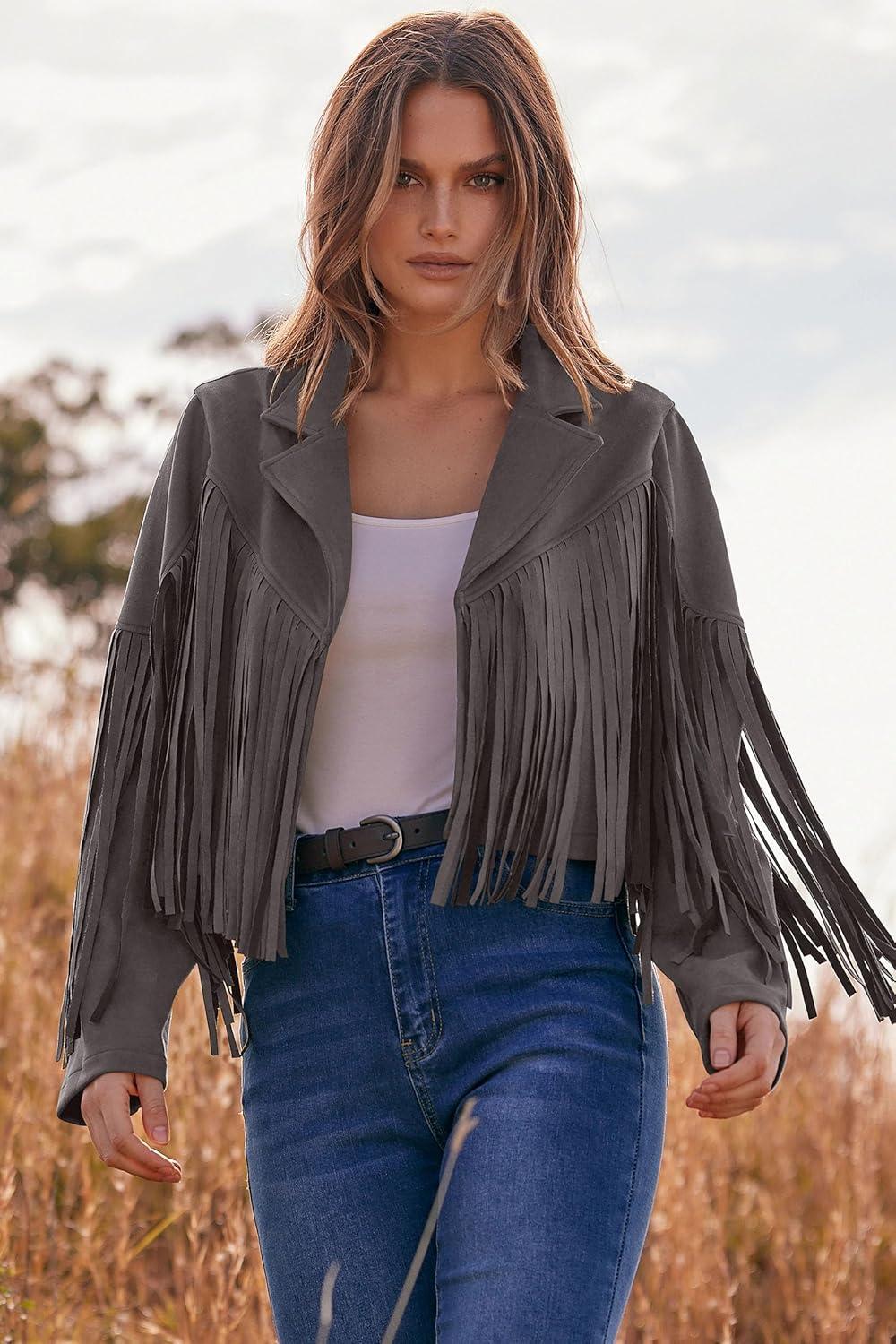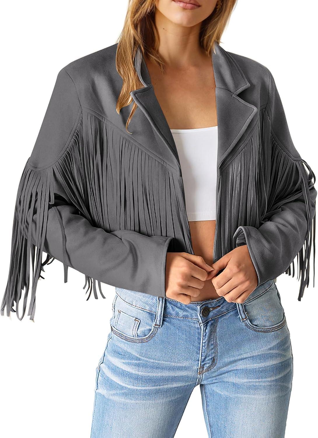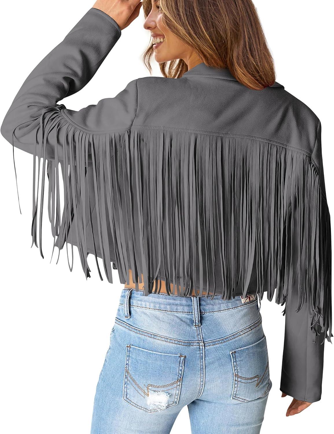 PRETTYGARDEN Women's Fringe Faux Suede Leather Jackets Fall Fashion 2025 Tassel Motorcycle Cropped Coats(Silver Grey)