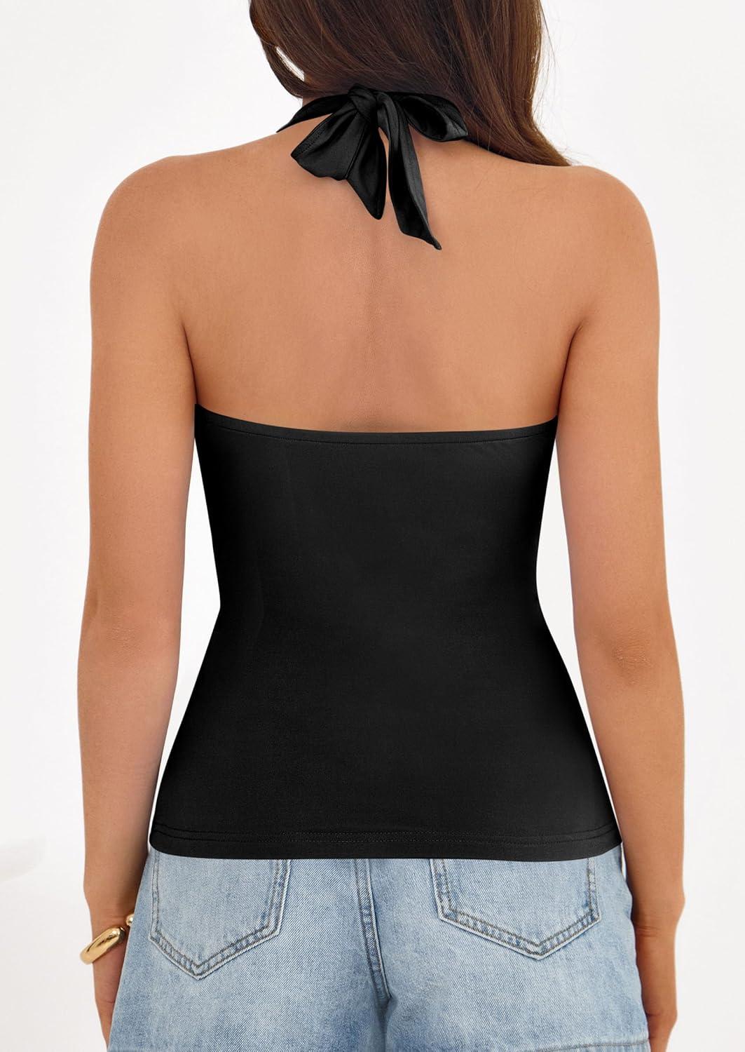 PRETTYGARDEN Womens Halter Top 2026 Spring Tie Wrap Sleeveless Ruched V Neck Fitted Summer Tops Backless Fashion Y2k Clothes(Black)