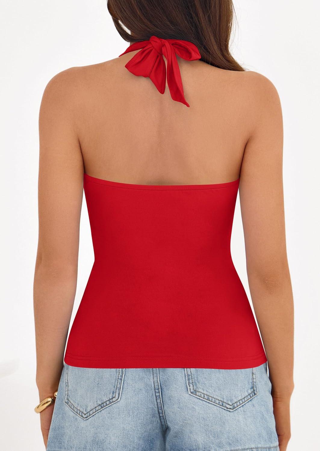 PRETTYGARDEN Womens Halter Top 2026 Spring Tie Wrap Sleeveless Ruched V Neck Fitted Summer Tops Backless Fashion Y2k Clothes(Red)