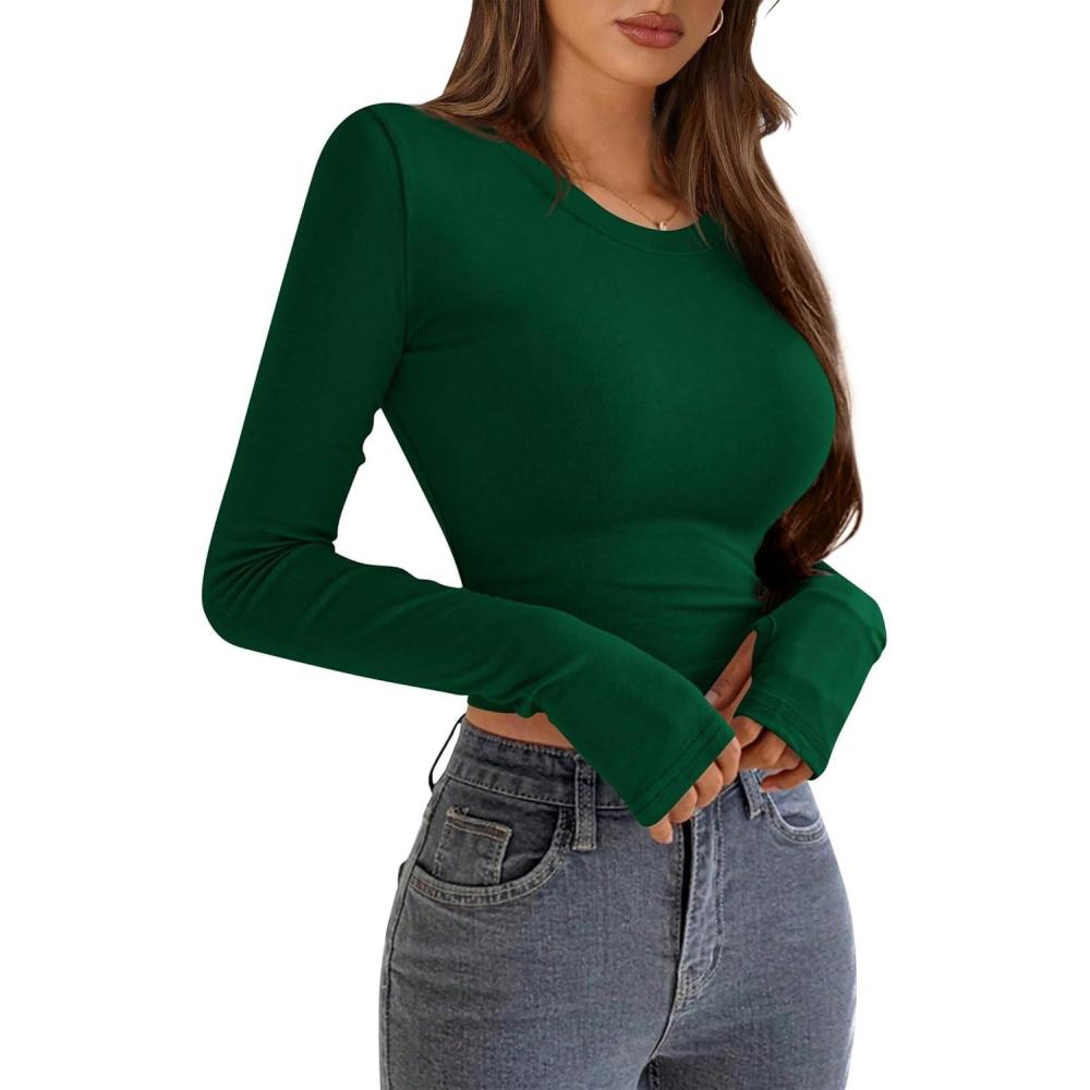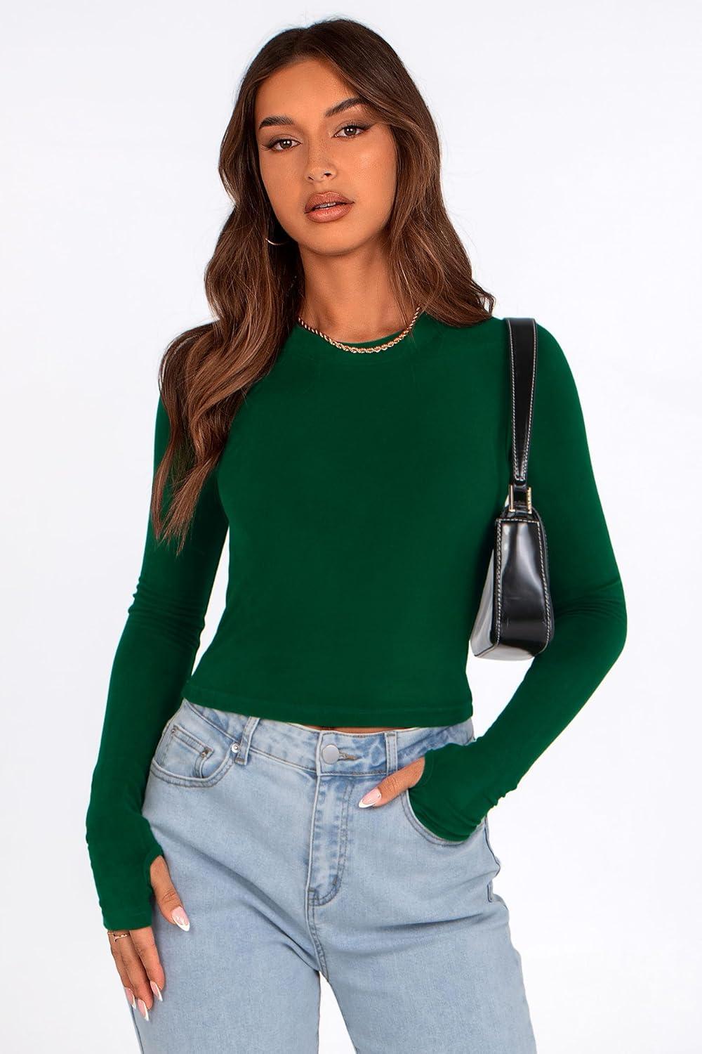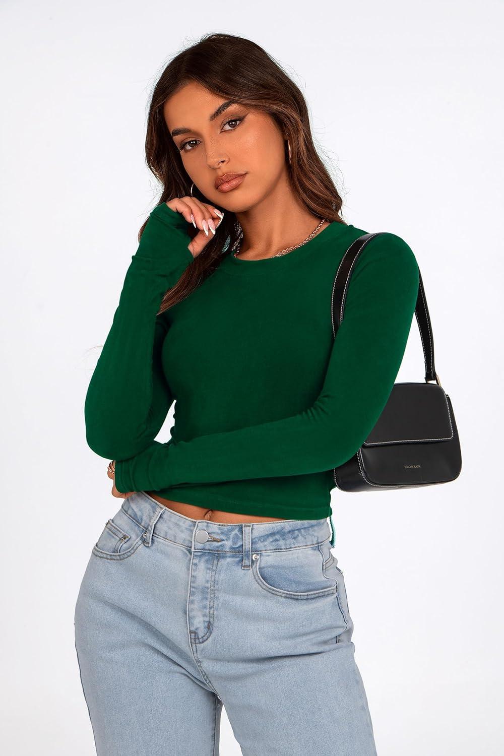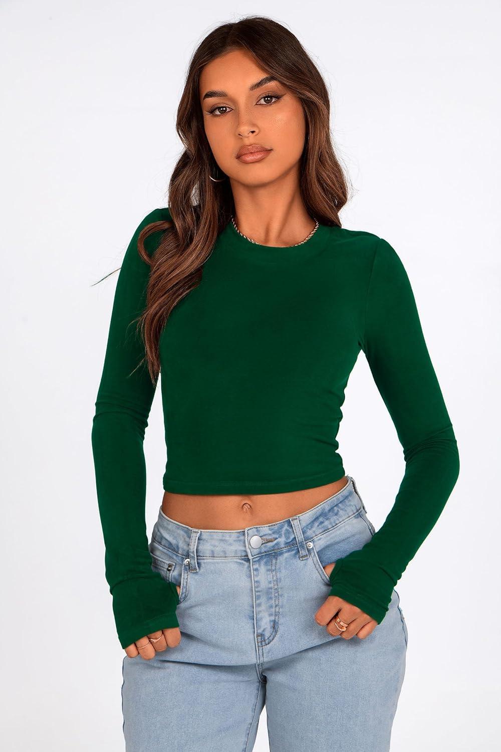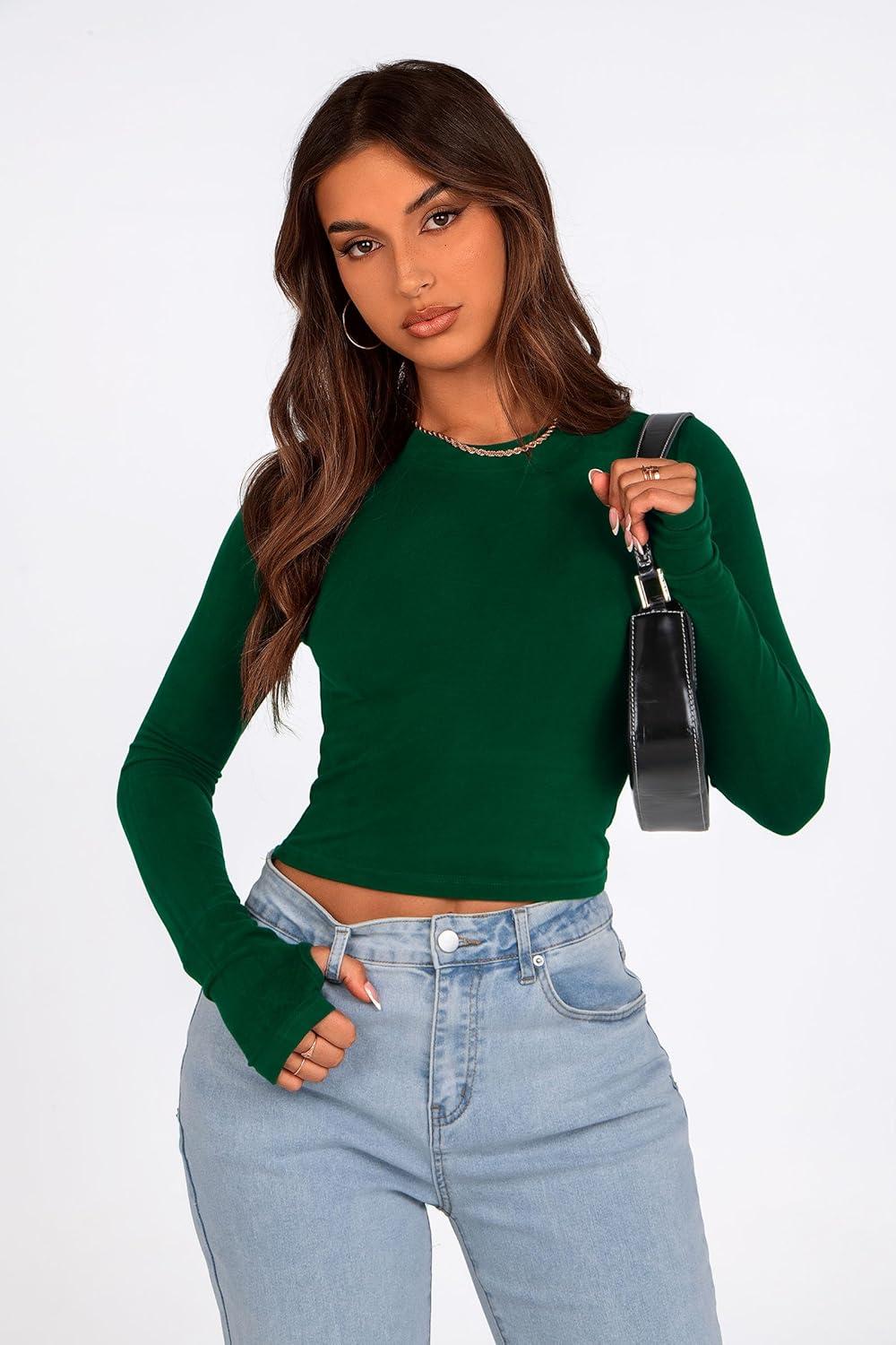 PRETTYGARDEN Women's Long Sleeve Crop Tops Y2K Spring Fall Fashion Clothes Basic Slim Fit Tee Shirts Blouse(Green)