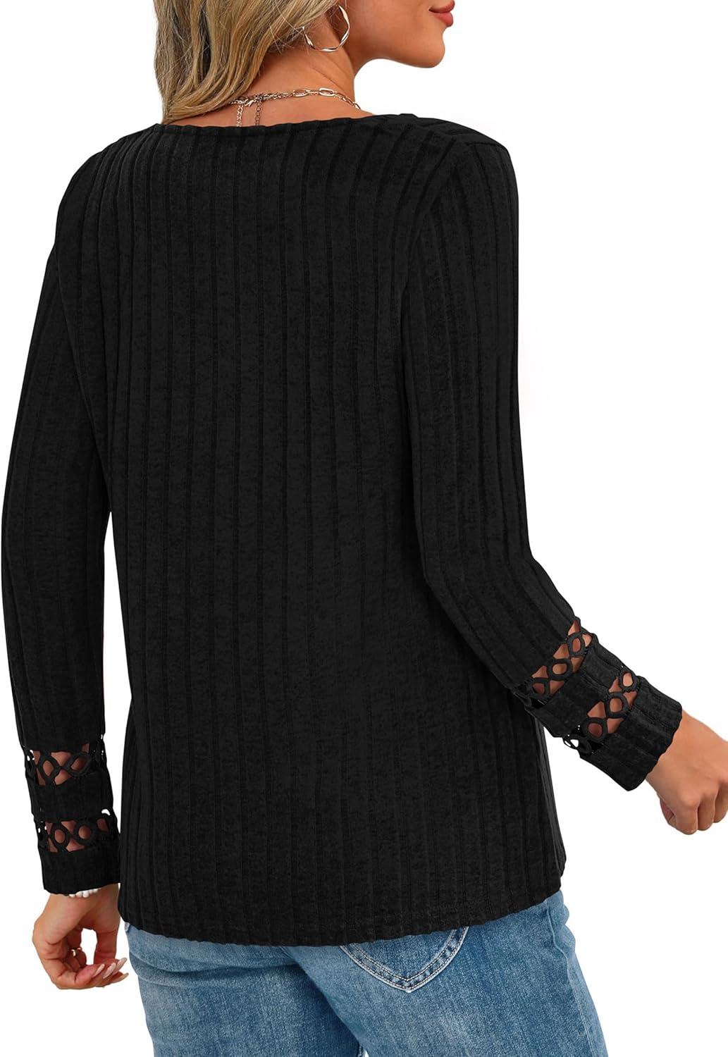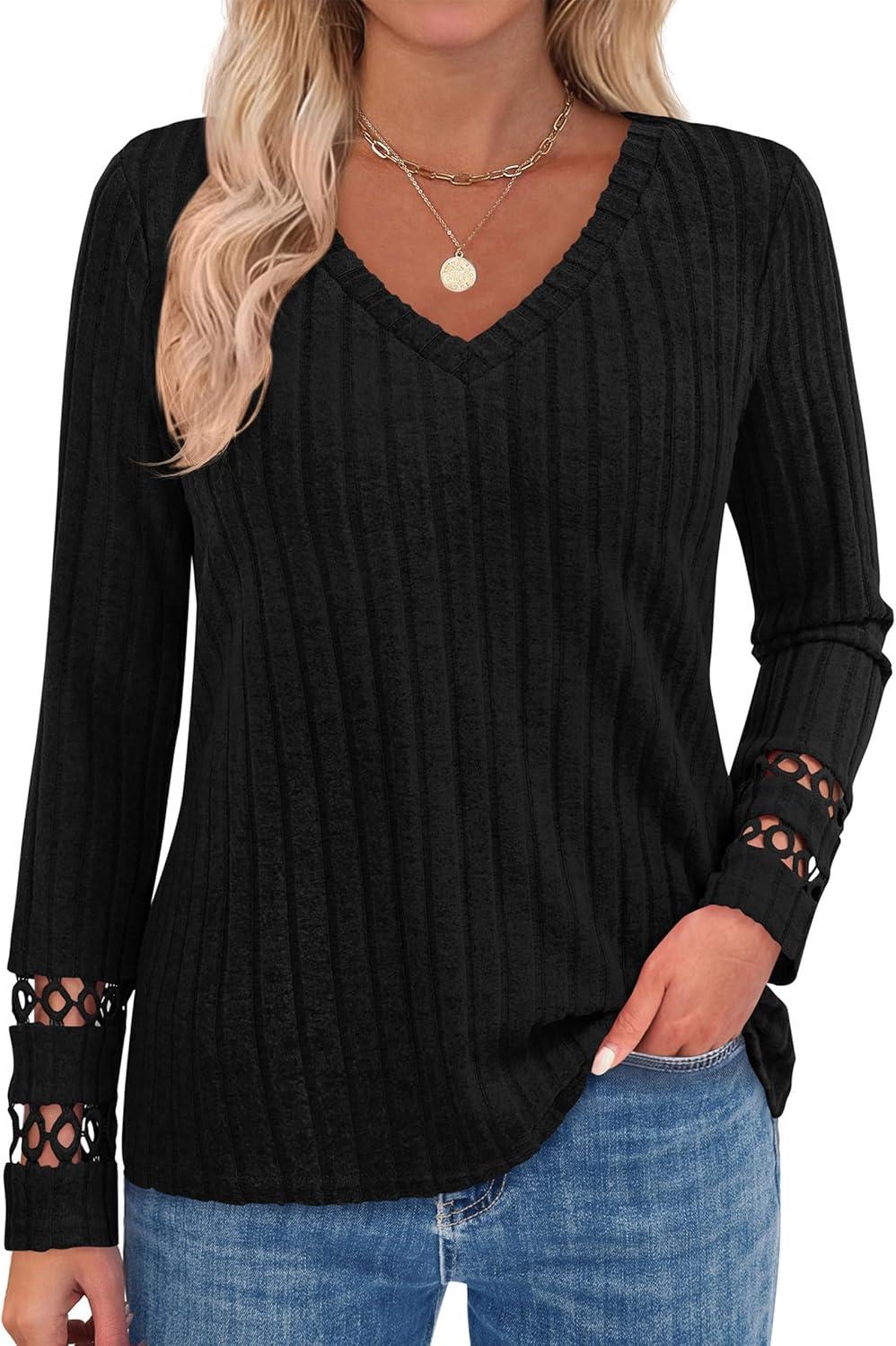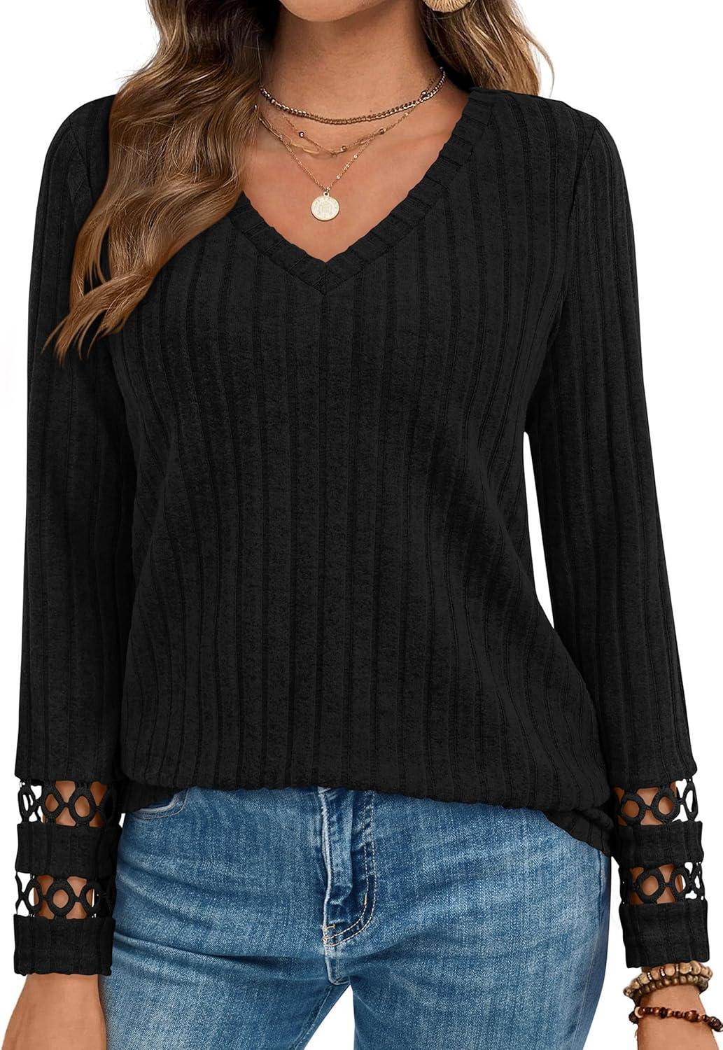 PRETTYGARDEN Women's Long Sleeve Shirts Ribbed Knit V Neck Tee Dressy Casual Blouses Going Out Tunic Tops 2025 Fall Outfits(Black)