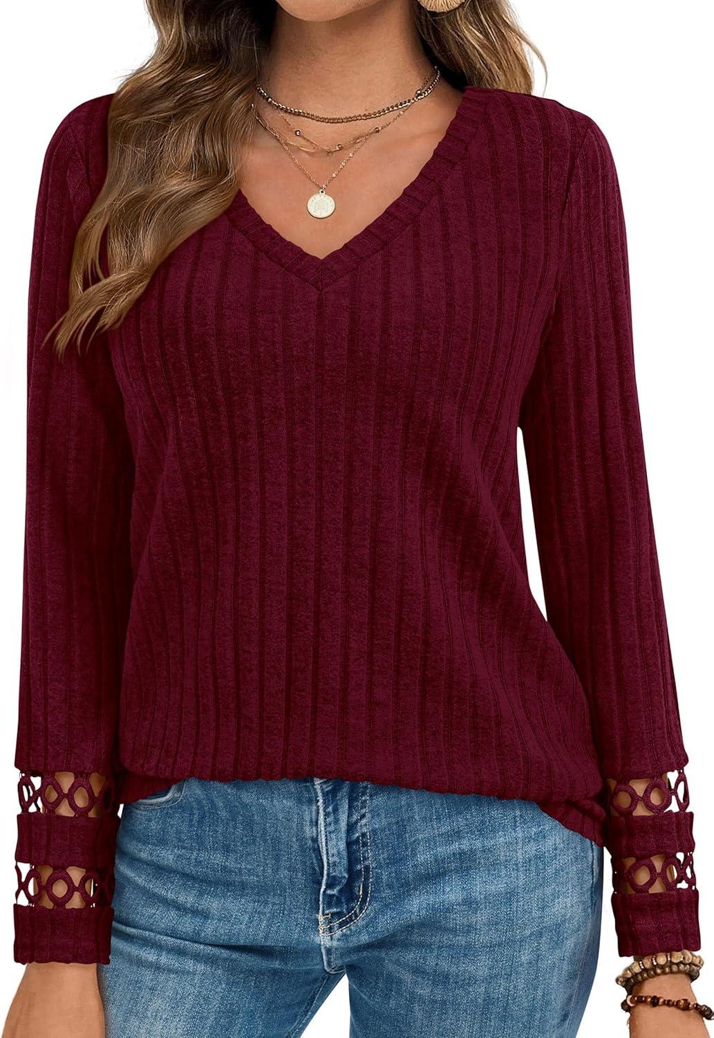 PRETTYGARDEN Women's Long Sleeve Shirts Ribbed Knit V Neck Tee Dressy Casual Blouses Going Out Tunic Tops 2025 Fall Outfits(Burgundy)