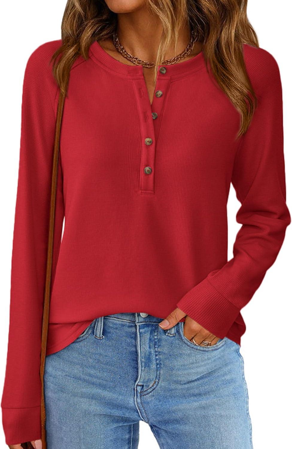PRETTYGARDEN Women’s Long Sleeve Waffle Knit Shirts 2025 Fall Casual Button Up Henley V Neck Tunic Tops Loose Fit Basic Tees(Red)