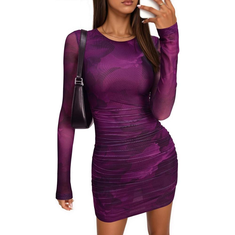 PRETTYGARDEN Women’s Mini Dress Fall Outfits 2025 Trendy Tie Dye Print Long Sleeve Homecoming Club Party Bodycon Dresses(Floral Purple)