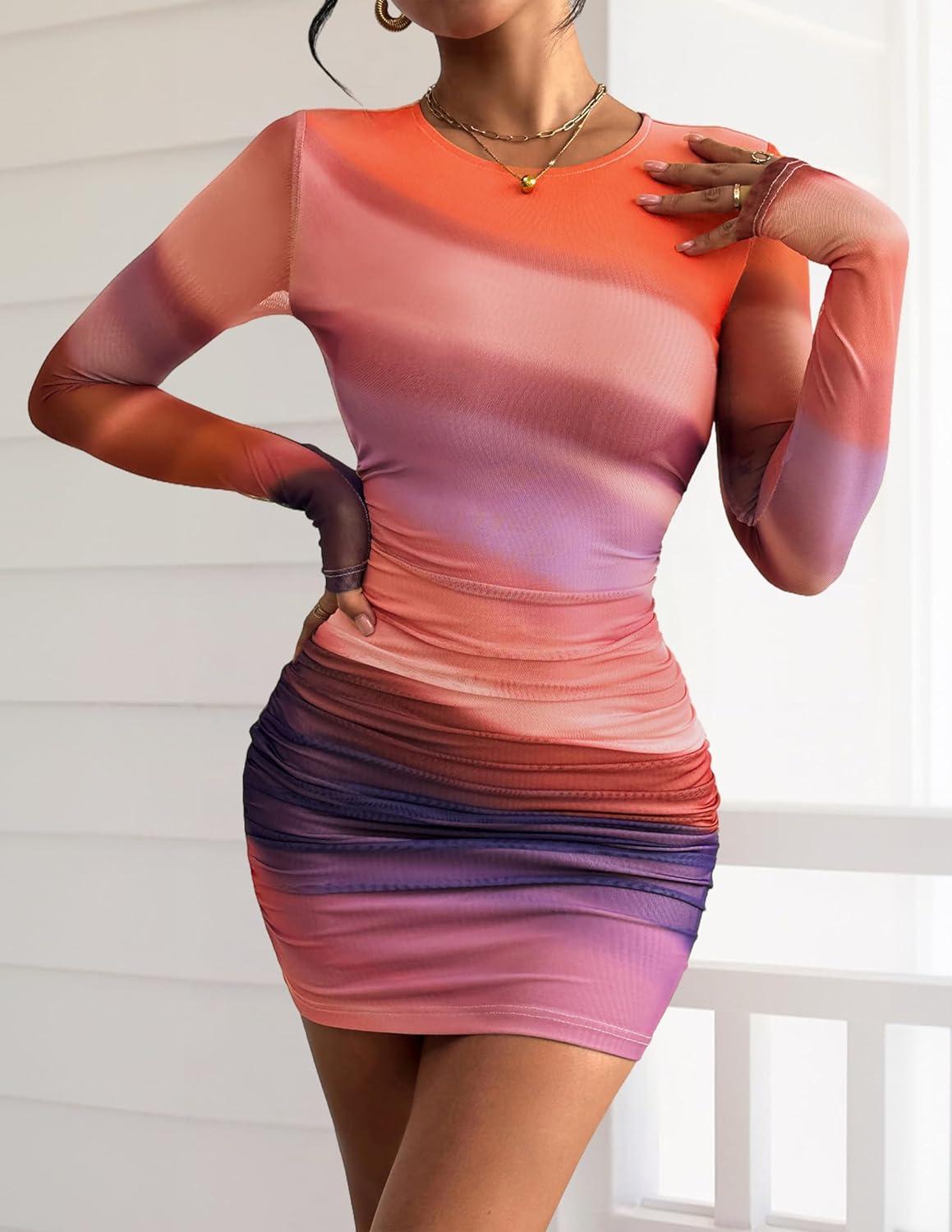 PRETTYGARDEN Women’s Mini Dress Fall Outfits 2025 Trendy Tie Dye Print Long Sleeve Homecoming Club Party Bodycon Dresses(Purple Orange)